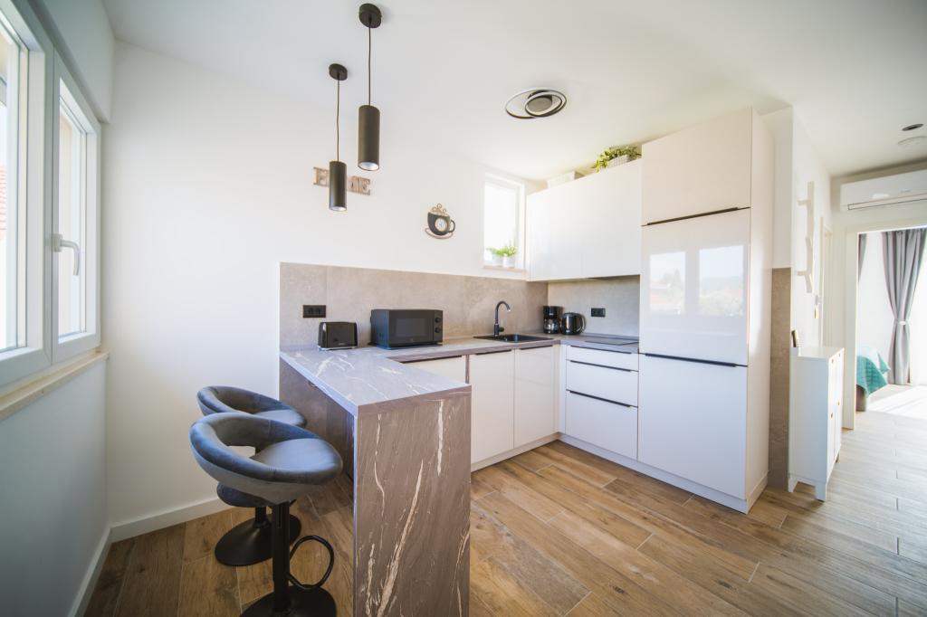 Apartmán Sunset je moderní a plně vybavený apartmán pro dvě osoby v Orebići na poloostrově Pelješac. Nachází se v prvním patře rodinného domu se samostatným schodištěm a vchodem. Dům se nachází 80 m od moře a blízko centra města, pár minut chůze od obchodu, pekárny, lékárny, restaurace... Apartmán se skládá z kuchyně s jídelním stolem, pokoje s manželskou postelí 180x200, 55" televize, psacího stolu s monitorem a klávesnicí pro připojení notebooku, pokud jste na pracovní dovolené, koupelny a dvou balkonů a parkovacího místa na soukromém parkovišti před domem. Hosté apartmánu obdrží uvítací balíček. Přejeme vám příjemný pobyt v apartmánu Sunset Orebić.
