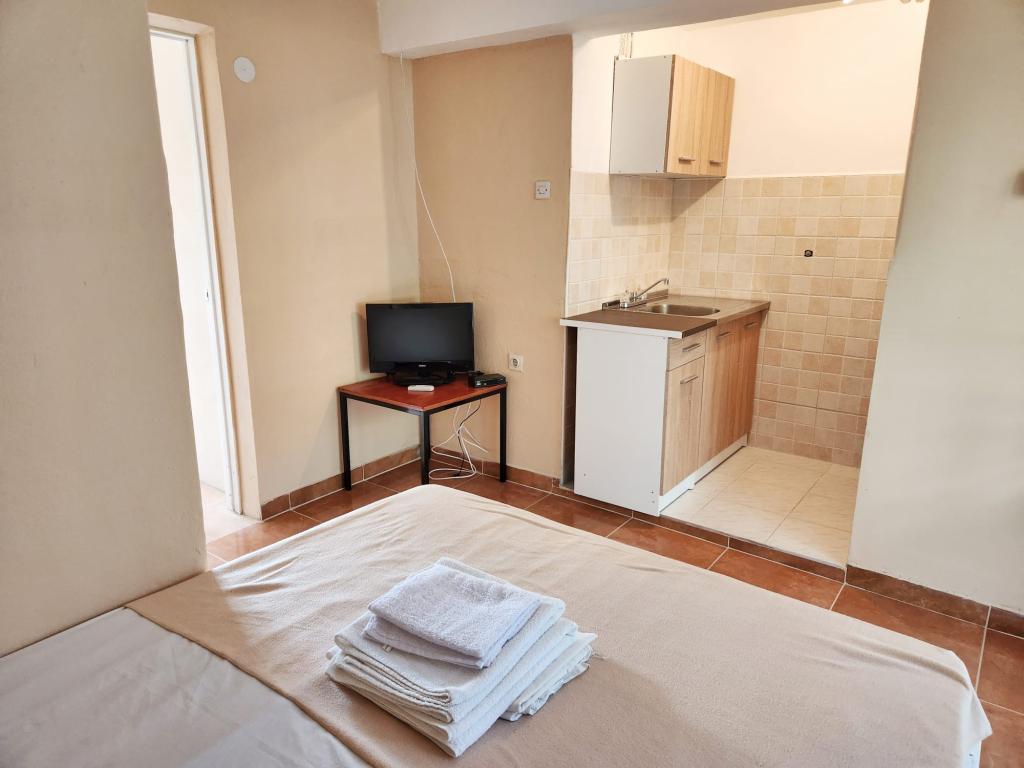 Placené cenově dostupné apartmány (€ 35 noc pro 4 osoby v období mimo sezónu a 45 EUR noci pro 4 osoby v hlavní sezóně), 20 m od moře. K bytu se dvěma balkony a dvou dvoulůžkových pokojů pochází z vnější chodby. Z jedné ložnice Byt je zapsána v koupelně a druhý v prostoru kuchyně. Teplá voda se získává ze solárního zařízení. Parkoviště pro osobní auta ve dvoře. Wi-Fi besplatan.Svi apartmány jsou klimatizované. Výhody - v blízkosti moře (pláž Trstenica), dobrá atmosféra, v blízkosti obchodů, barů a restaurací Nevýhoda - není obývací pokoj, ale se dvěma balkony