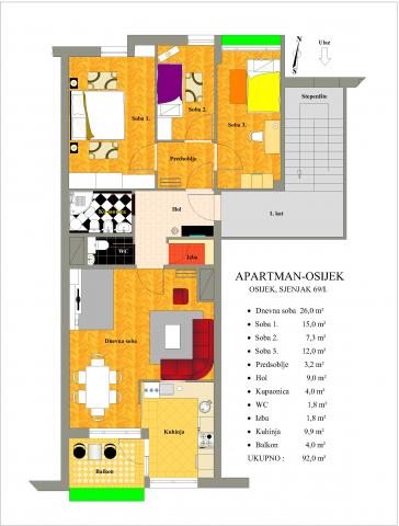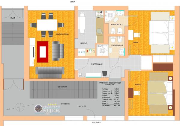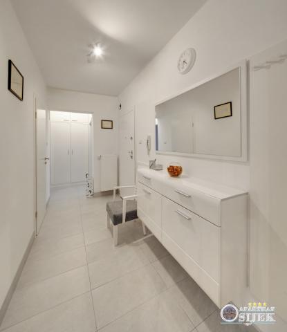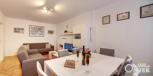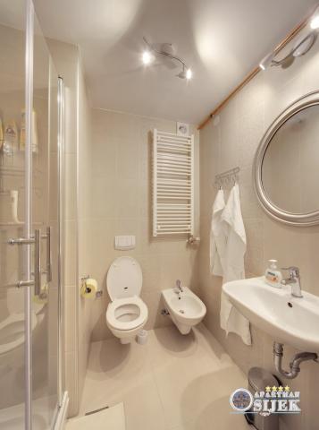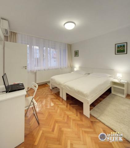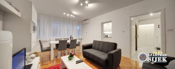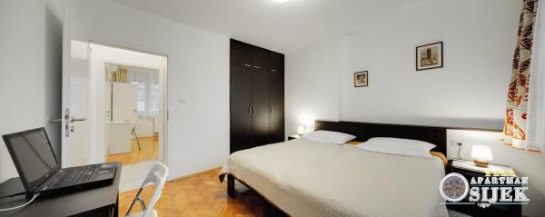 Apartmán "Osijek" se nachází v prvním patře domu v klidné vilové čtvrti Sjenjak, nedaleko hlavních ulic a silnic, které procházejí městem, a který spojuje Osijek s okolím a dálnice A5. V bytě je vlastně plochá 92 m², s slunný obývací a klidné severní oblast pro noční odpočinek. To má jednu ložnici s manželskou postelí, dvě samostatné ložnice, obývací pokoj s rohovou rozkládací pohovkou, koupelna, samostatné WC, kuchyní a balkonem. V blízkosti se nacházejí stadionu Municipal Garden, posilovna, městská bazény, restaurace a Osijek staré město - barokní Citadel. Osijek je město s největším počtem parků a zelených ploch v Chorvatsku, a až do některých destinací ve městě se dostanete pěšky nebo tramvají a jejichž poloha v přední části budovy. Chodit po ulicích Osijeku vám ukáže svou dlouhou historii: z archeologických vykopávek antického Mursa v Dolním Městě, přes barokní pevnost a občanské architektury XIX. staletý Horní Město, do moderní městské centrum.
