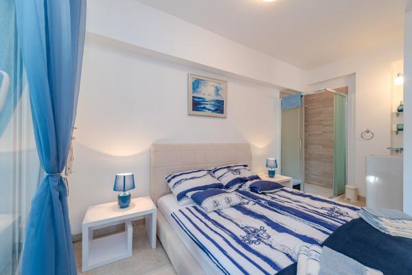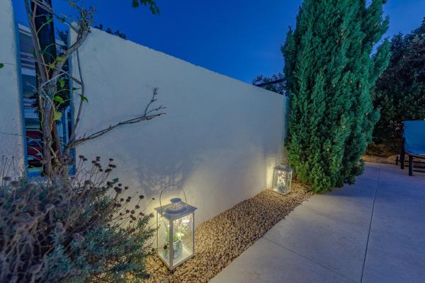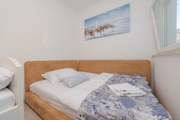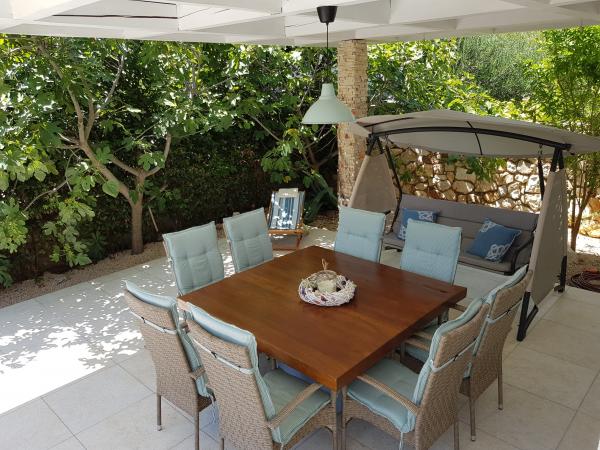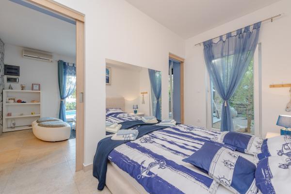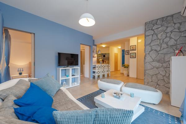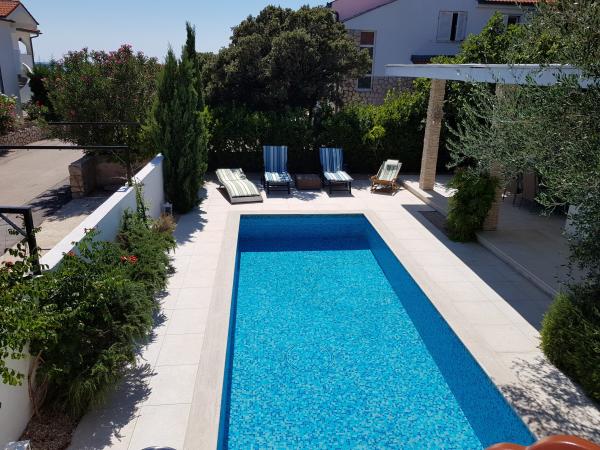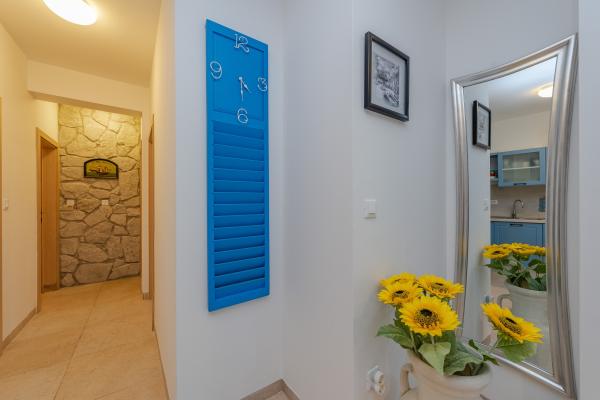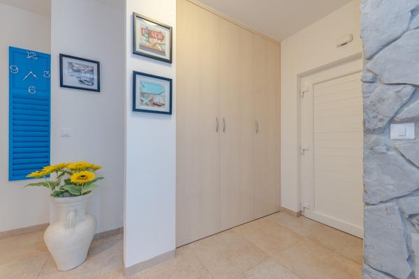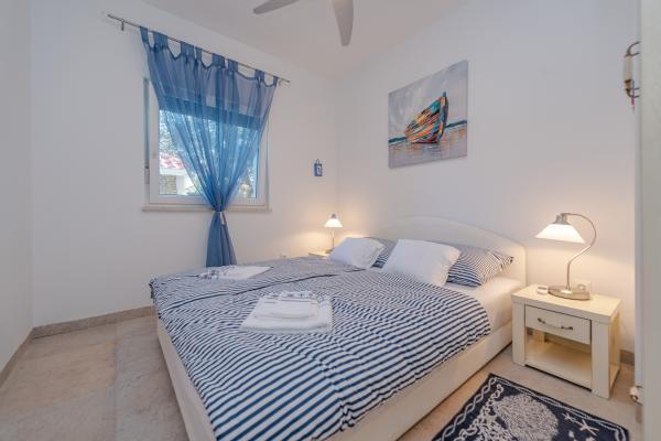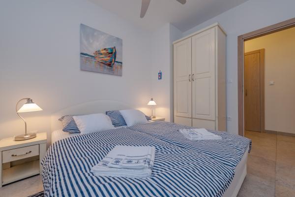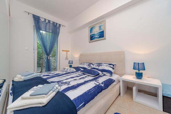 Byt se nachází v novější budově, je plně a moderně vybavený, nově zařízený pro příjemný a relaxační pobyt, od moře asi 250 m. Nachází se v přízemí budovy. Má samostatný vchod, zahradu, která je rozdělena na opalovací plochu kolem bazénu a zahradu a krytou terasu, kde se konají denní a večerní setkání. K dispozici je velký stůl na terase a vedle kyvadlové paluby na odpočinek. 26 m² bazénu může využívat pouze hosté tohoto bytu. V zahradě jsou zasazeny fíky, ve kterých mohou hosté požívat ovoce a zdobí zahradnictví (vavřínová, cypřišová, rozmarýnová, levandule a oleandr). Hosté mají soukromí a klid. Interiér - obývací pokoj a tři ložnice, 2 sprchové kouty, 1 WC, komora. Celková užitná plocha bytu je 112 m2, z toho je uzavřeno 70 m2. Byt má také dvě parkovací místa. Během několika minut chůze od apartmánu se nachází obchod, lékárna, rybářský trh, kadeřnictví, domácí výrobci ovoce a zeleniny ...