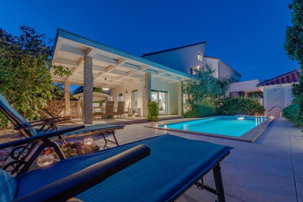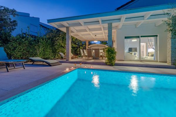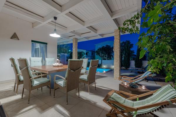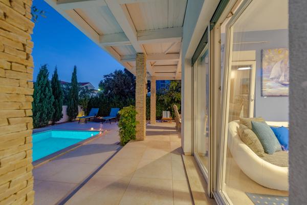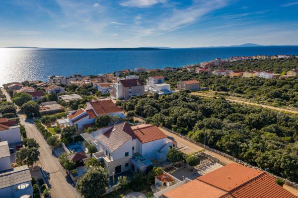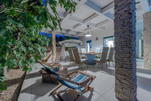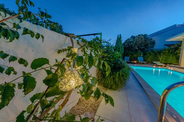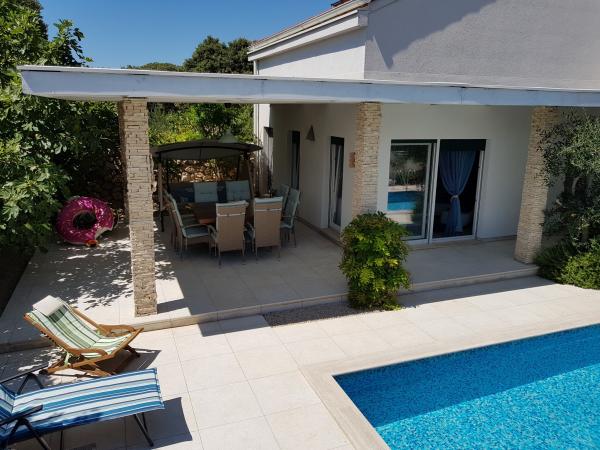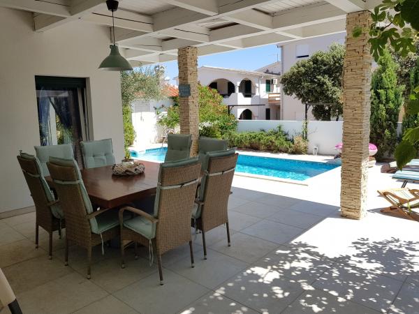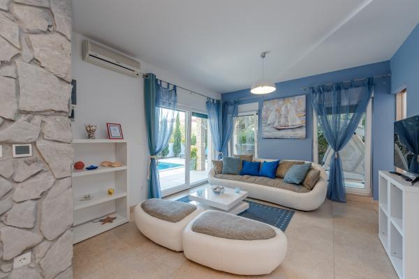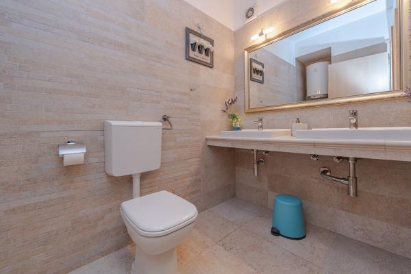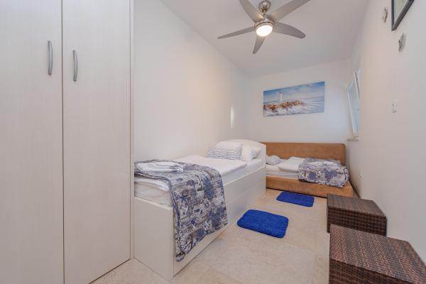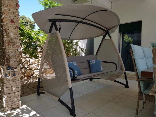 Byt se nachází v novější budově, je plně a moderně vybavený, nově zařízený pro příjemný a relaxační pobyt, od moře asi 250 m. Nachází se v přízemí budovy. Má samostatný vchod, zahradu, která je rozdělena na opalovací plochu kolem bazénu a zahradu a krytou terasu, kde se konají denní a večerní setkání. K dispozici je velký stůl na terase a vedle kyvadlové paluby na odpočinek. 26 m² bazénu může využívat pouze hosté tohoto bytu. V zahradě jsou zasazeny fíky, ve kterých mohou hosté požívat ovoce a zdobí zahradnictví (vavřínová, cypřišová, rozmarýnová, levandule a oleandr). Hosté mají soukromí a klid. Interiér - obývací pokoj a tři ložnice, 2 sprchové kouty, 1 WC, komora. Celková užitná plocha bytu je 112 m2, z toho je uzavřeno 70 m2. Byt má také dvě parkovací místa. Během několika minut chůze od apartmánu se nachází obchod, lékárna, rybářský trh, kadeřnictví, domácí výrobci ovoce a zeleniny ...