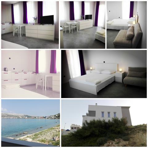 Pronajmu studio apartmány a pokoj ve městě Pag, první řada k moři. Každé studio a pokoj má klimatizaci, bezplatné Wi-Fi, satelitní TV, parkování zdarma. Vzdálenost od centra města je cca 10 minut pěšky. Před domem je malá pláž, která je prodloužením hlavní městské pláže.