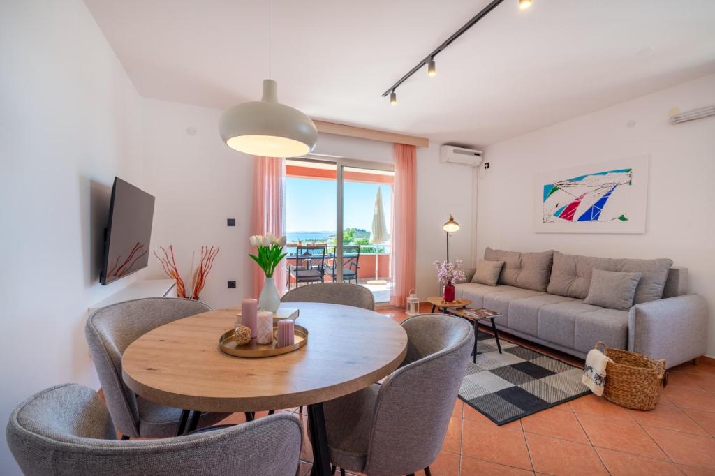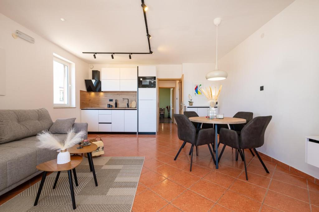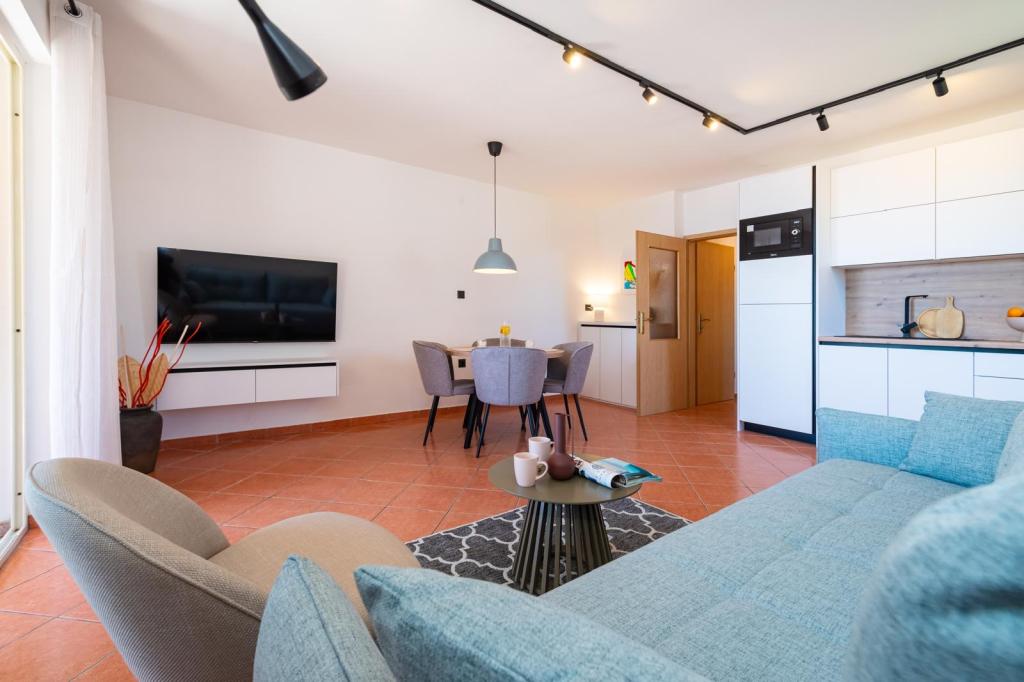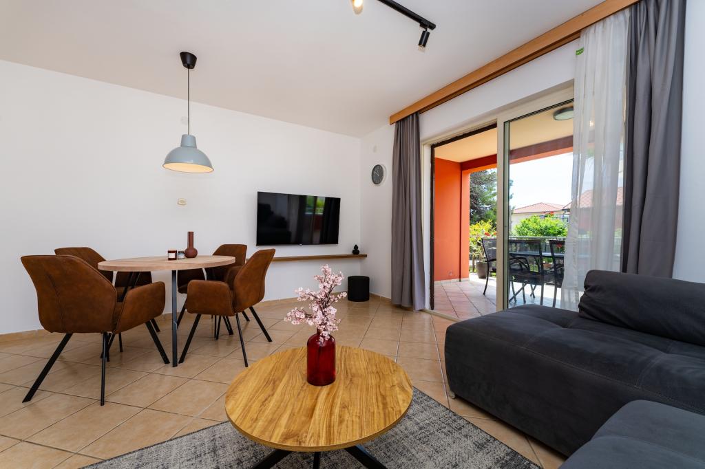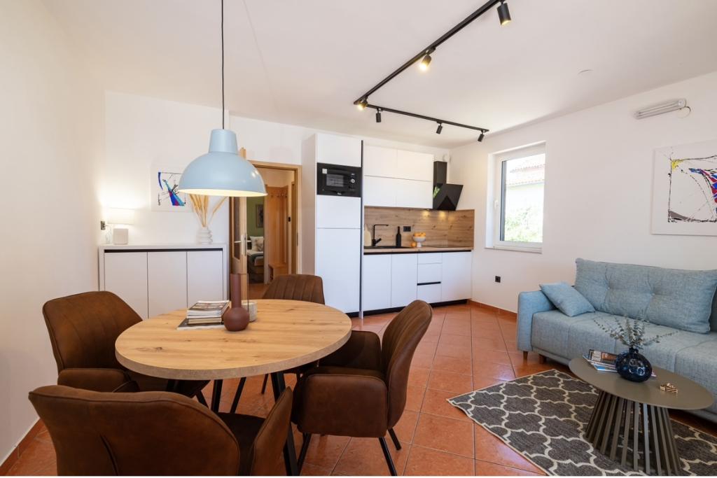 Vila San Marino má osm identických apartmánů rozmístěných na třech podlažích. Na každém patře jsou dva apartmány. Apartmány mají celkovou rozlohu 55 m2 a obsahují dvoulůžkovou ložnici, obývací pokoj s rozkládací postelí, kuchyň, jídelnu a velkou terasu. Všechny apartmány se nacházejí v první řadě u moře a jsou orientované směrem k moři. Jsou vybaveny klimatizací pro chlazení a vytápění. Kuchyně jsou vybaveny nádobím pro přípravu a servírování jídla a nápojů v odpovídajícím množství, lednicí, mrazákem, elektrickou varnou deskou, plynovým sporákem a digestoří a koupelny mají sprchy. Každý apartmán má plochou televizi se satelitním příjmem a anténou a přístup k internetu. Terasy mají posezení.