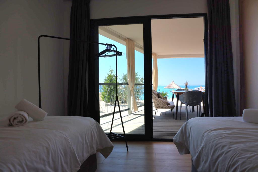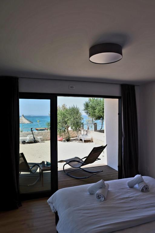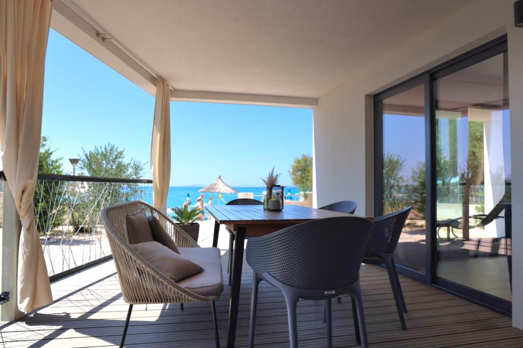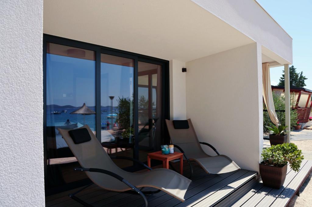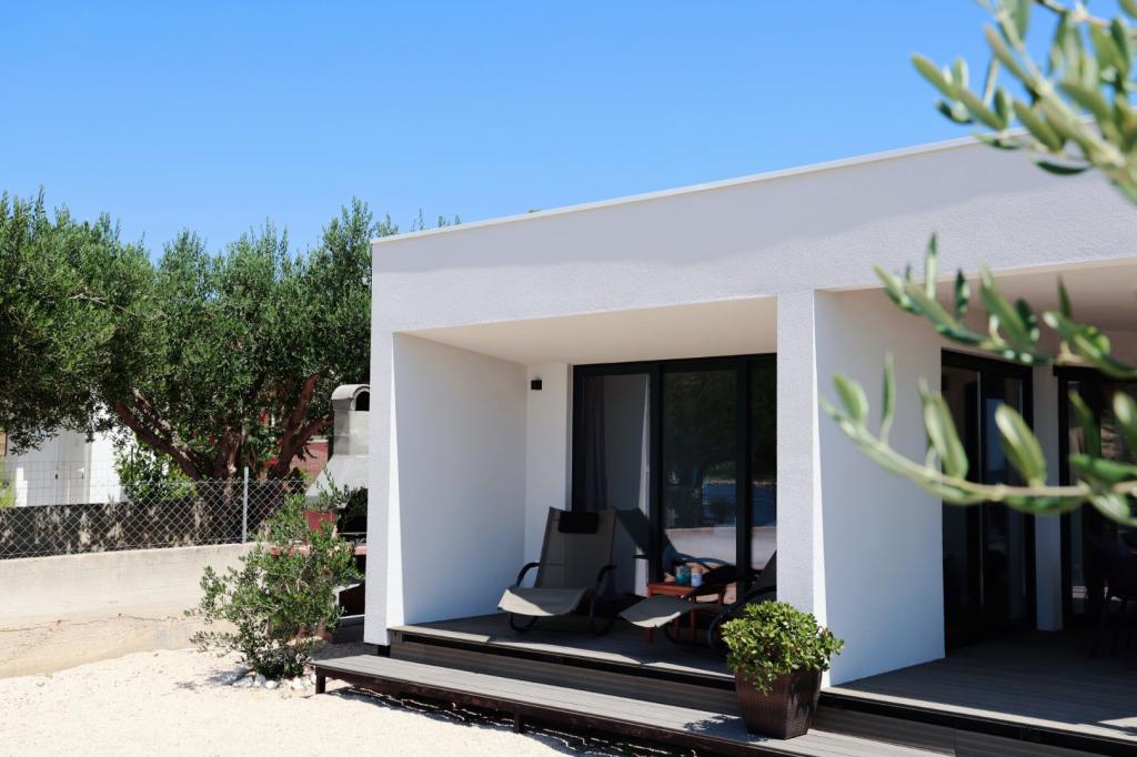 Na krásné pláži jsou mobilní domy k pronájmu. Domy jsou moderně a luxusně zařízené, skládají se z velké ložnice s koupelnou, ložnice, kuchyně, obývacího pokoje a koupelny a terasy 20 m2 s krásným výhledem na moře a blízké ostrovy. Mobilní domy jsou klimatizované, mají TV a internet. Kuchyň je plně vybavená a zahrnuje; elektrická trouba, myčka, kávovar, pračka, velká lednice, varná konvice, nádobí... Ložní prádlo a ručníky jsou v ceně. Domy se nachází v klidné části města, 5 minut chůze od centra.