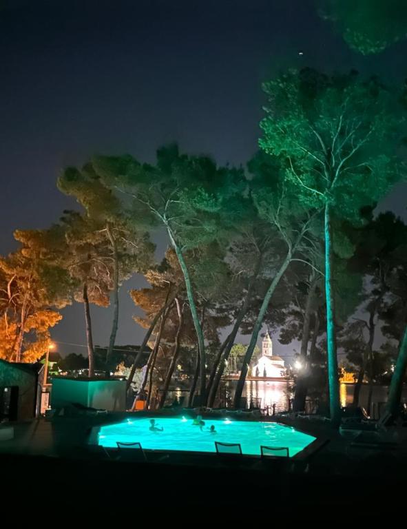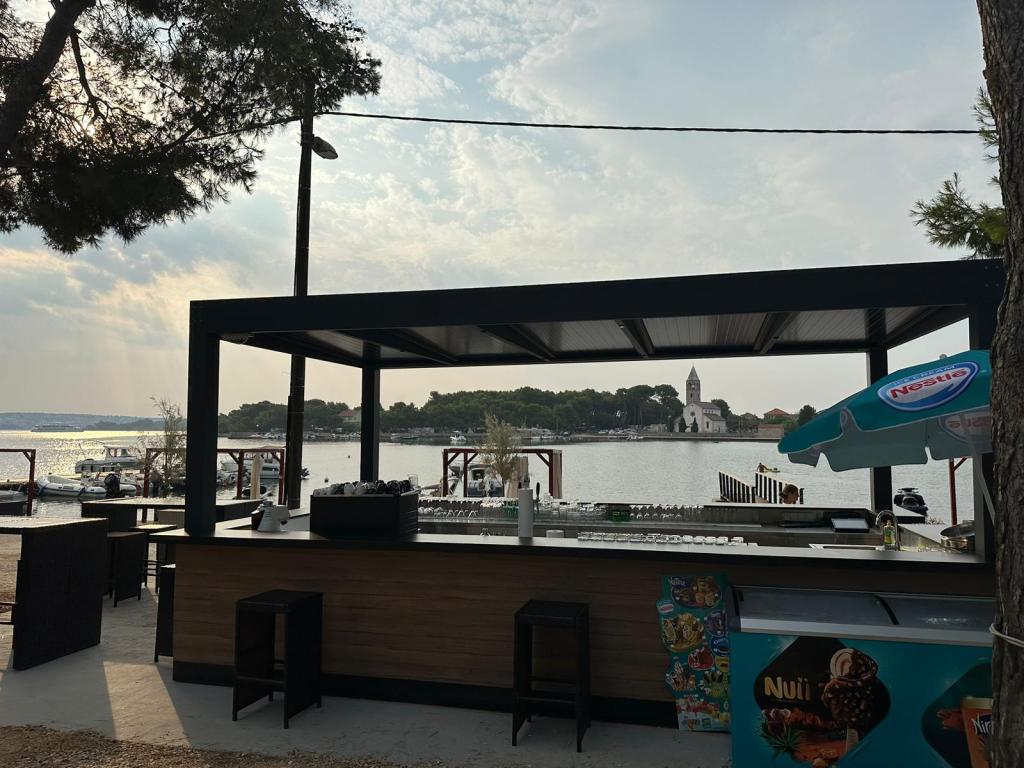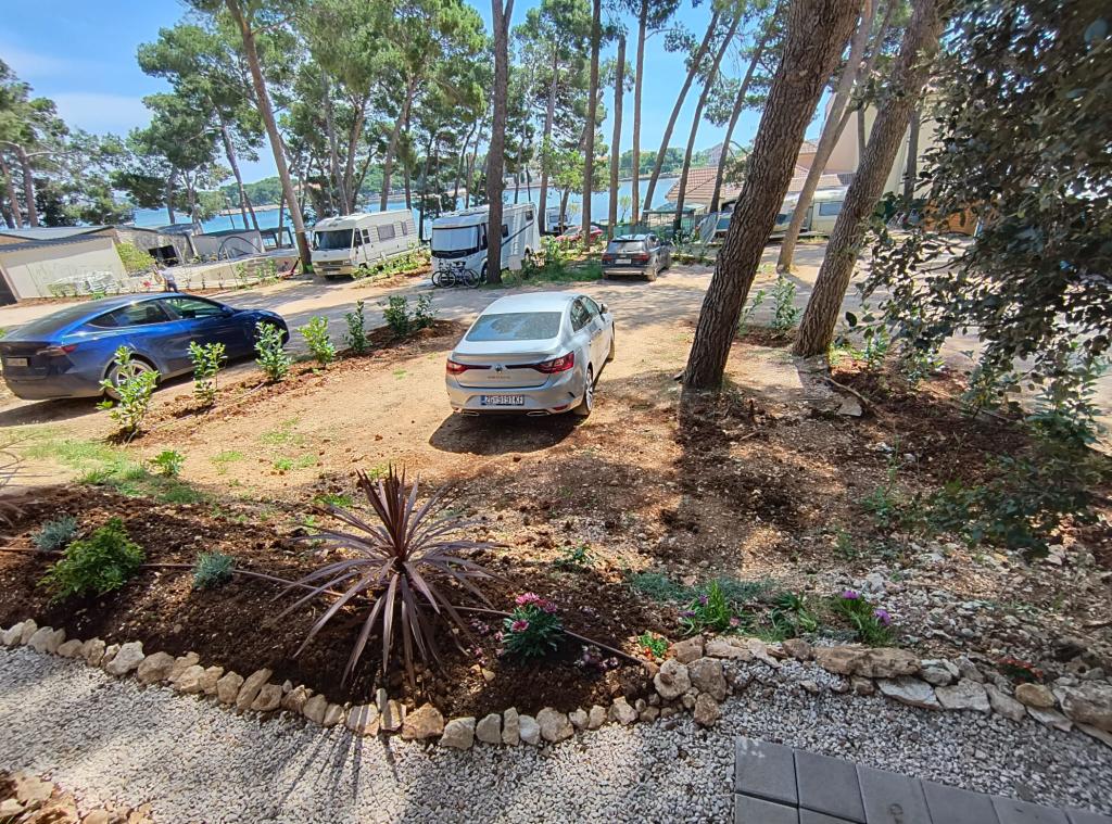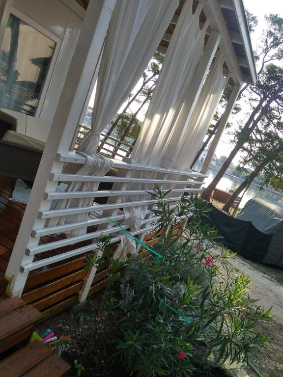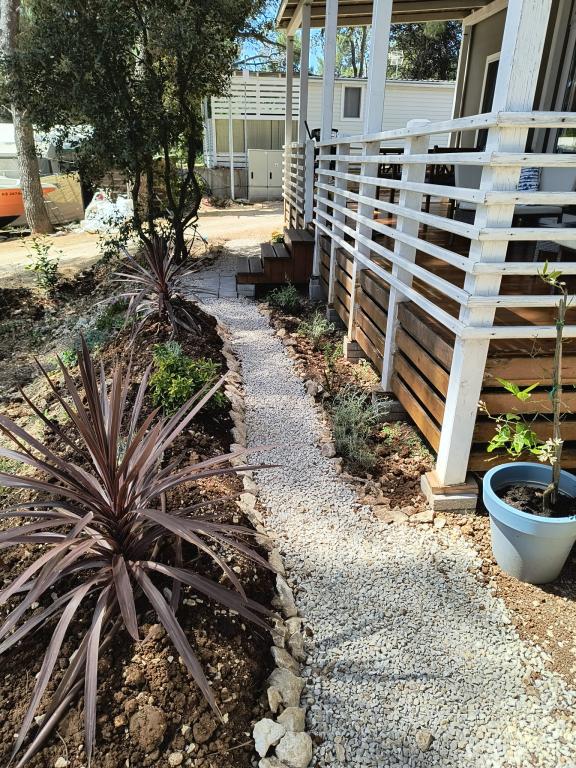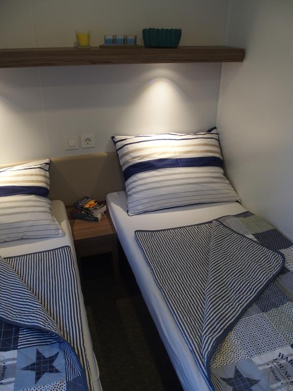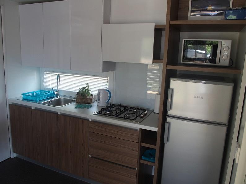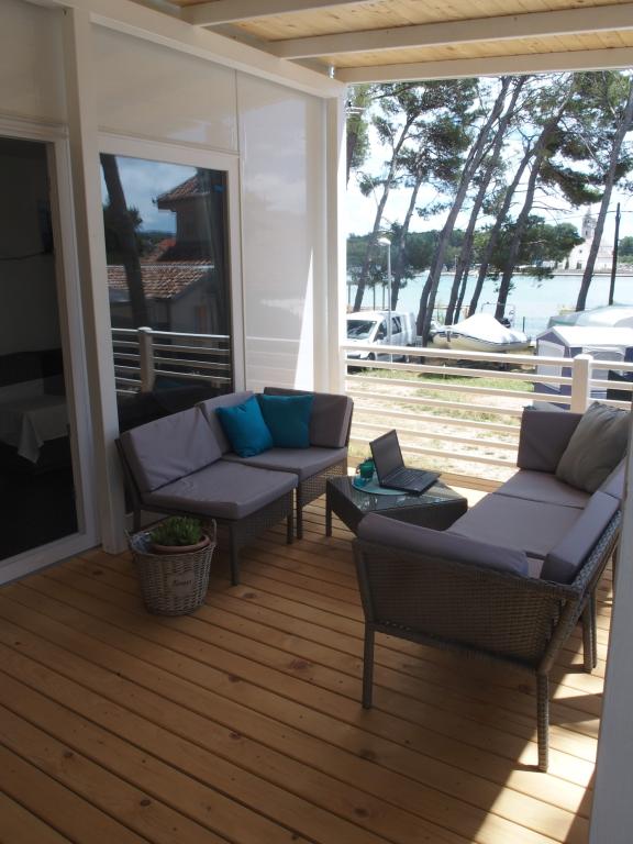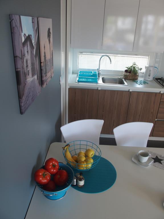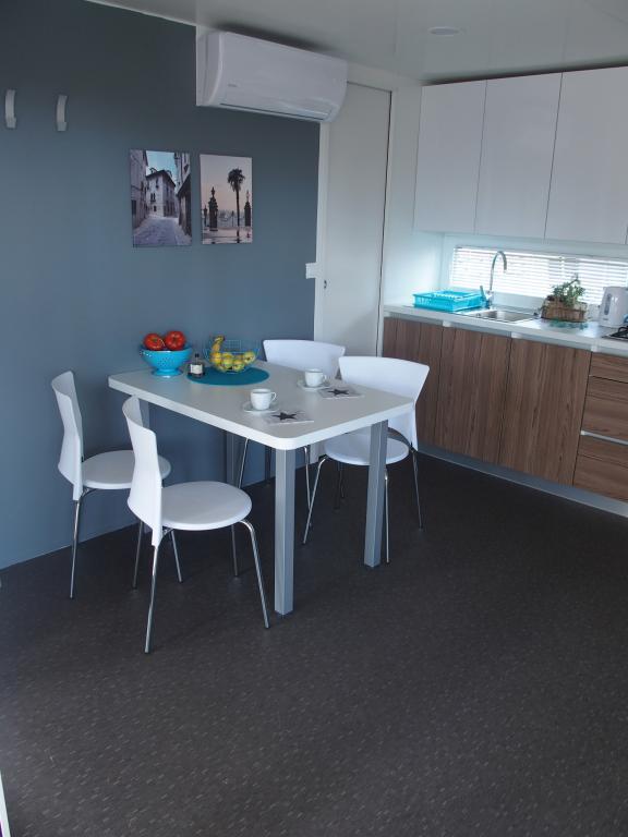 Luxusní mobilní dům se nachází v přírodním „hlubokém stínu“ borového lesa, pouhých 20 m od písečné pláže. S velkou otevřenou terasou s výhledem na moře, 2 ložnicemi, plně vybavenou kuchyní a koupelnou a velkým obývacím pokojem s další rozkládací pohovkou je tento rekreační dům ideální volbou pro relaxační rodinnou dovolenou. Poskytuje pohodlné ubytování pro 4 osoby, maximální kapacita je 4 + 1 osoba. Terasa má posezení pro relaxaci, jídelní stůl až pro 6 osob a také plynový gril. Pouhých 20 m odtud se nachází krásná a bezpečná pláž s písečným mořským dnem, která se táhne od jednoho konce zálivu k druhému. Podél pobřeží, několik kilometrů v obou směrech, se nacházejí další pláže různých typů, které můžete prozkoumat. Uvnitř kempu mají hosté přístup k bazénu se zařízenou opalovací plochou s bezplatnými lehátky a také k kavárně s barem. Terasa domu je umístěna tak, že máte otevřený výhled na celý záliv a bazén.