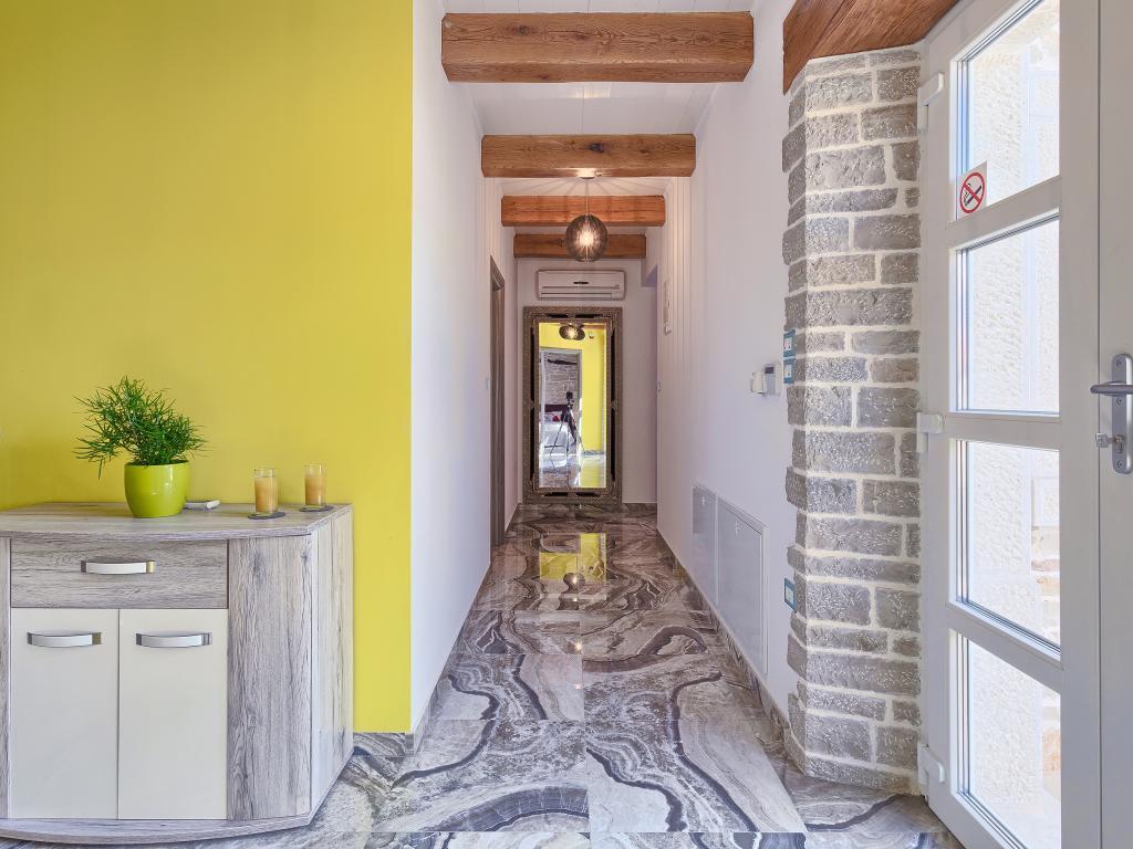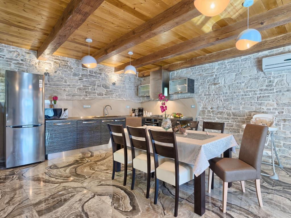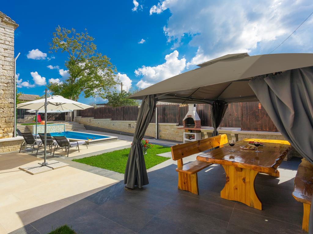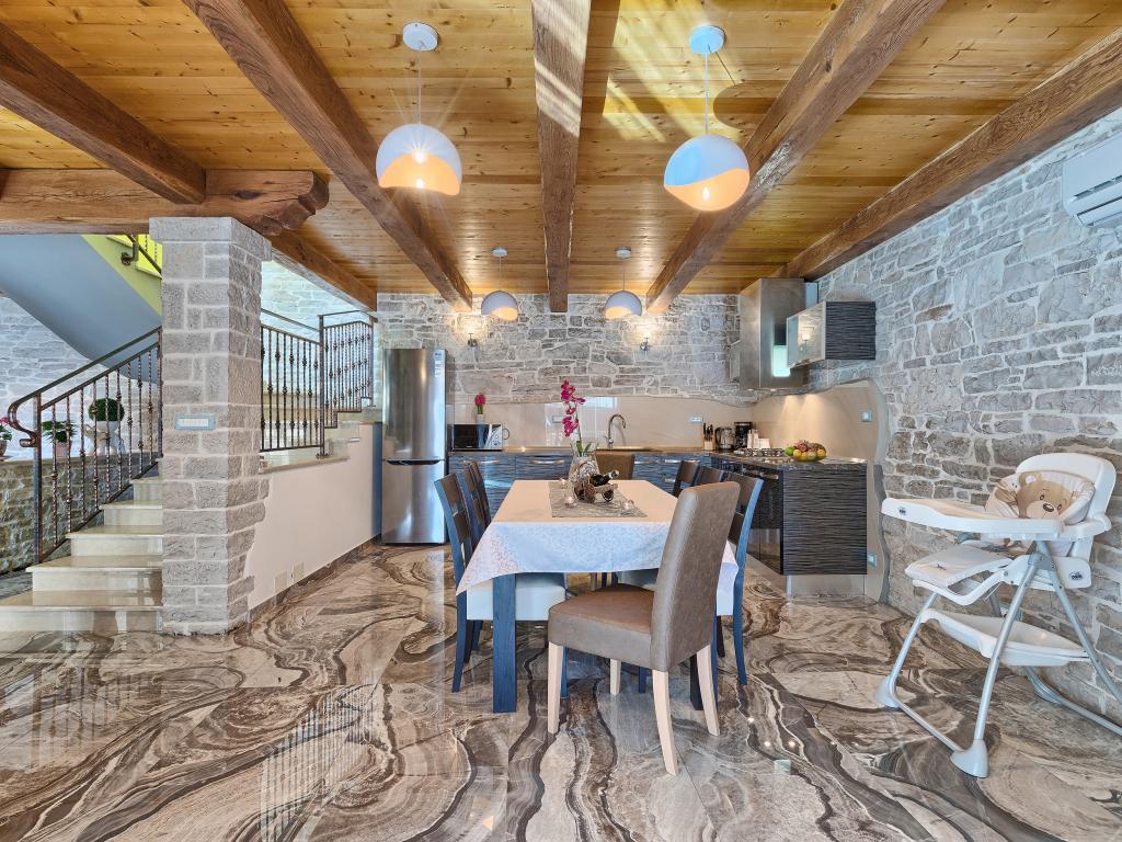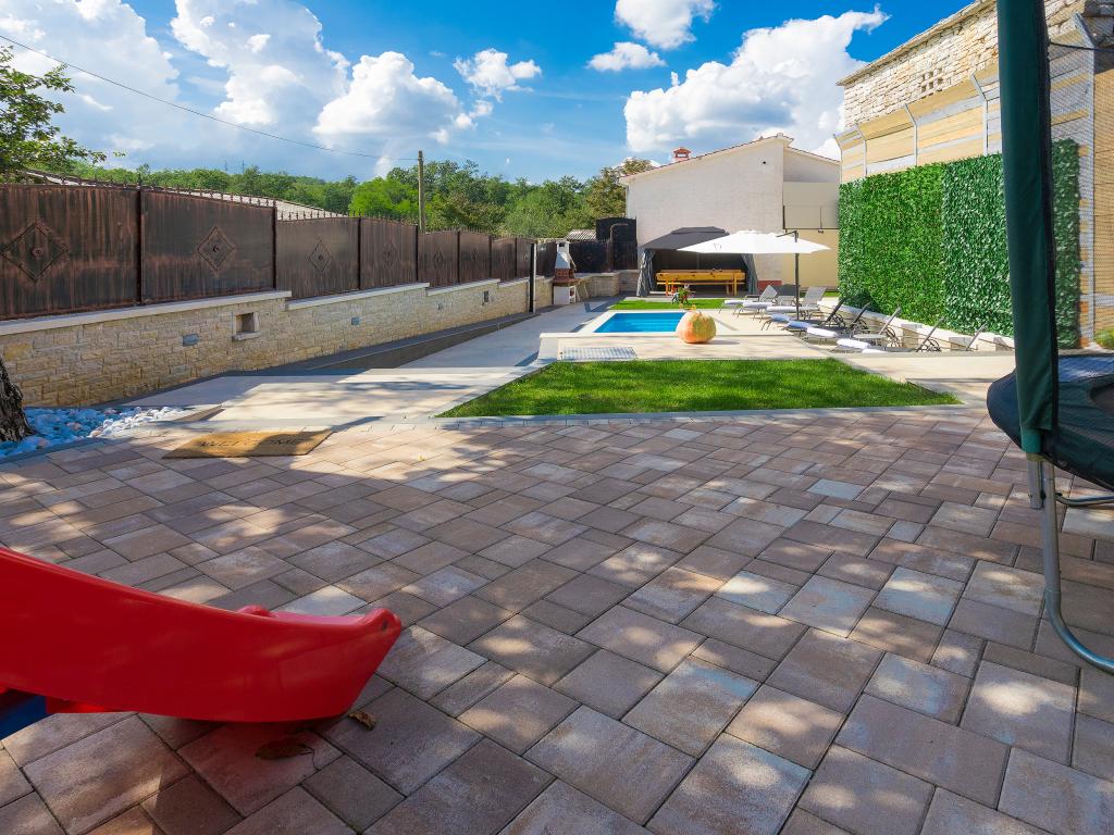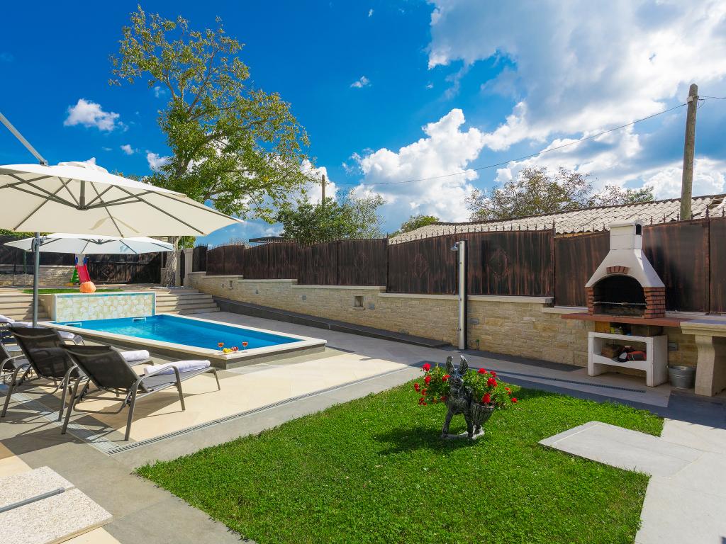 Ať už hledáte únik od shonu každodenního života nebo základnu pro vaši aktivní dovolenou, Villa Patrick je pro vás ideálním místem. Starý kamenný dům z roku 1880, kompletně zrekonstruovaný v roce 2017, se nachází v malém městečku Pilati nedaleko Pazinu v srdci Istrie. Dům o velikosti 200 m2 obsahuje vše potřebné pro pohodlný pobyt až pro 10 osob (8+2), oplocená zahrada o velikosti 500 m2 s bazénem poskytuje klid a maximální soukromí. Ideální poloha v centru Istrie umožňuje plánovat další aktivity, od kulturních a uměleckých, sportovních, historických až po gastronomickou turistiku, protože všechny známé lokality jsou vzdálené 2-40 km. A pokud si chcete rozšířit obzory, místo je ideální pro plánování jednodenních výletů do poněkud vzdálenějších míst jako Pula, Rovinj nebo Umag. Villa Patrick pojme až 10 osob (optimálně 8) a nabízí vám maximální pohodlí. K dispozici jsou čtyři pohodlné ložnice s manželskými postelemi a vlastní koupelnou - každý pokoj má vlastní klimatizaci a televizi se satelitním přijímačem; společný obývací pokoj s krbem a TV se satelitním příjmem, společná koupelna, velká kuchyň se všemi moderními spotřebiči a otevřená jídelna pro 10 osob. K venkovnímu prostoru patří terasa s bazénem, dvě posezení, gril, dětské hřiště, zahrada a kryté stání pro 4 auta. Wi-Fi je zdarma...