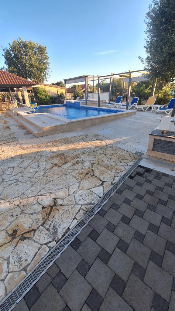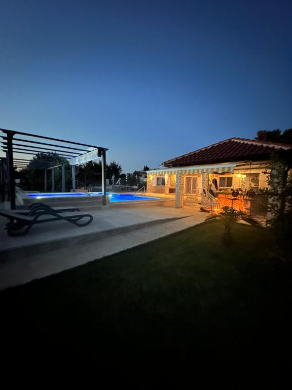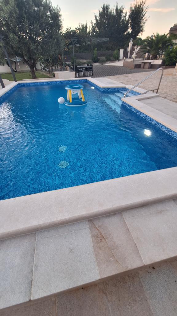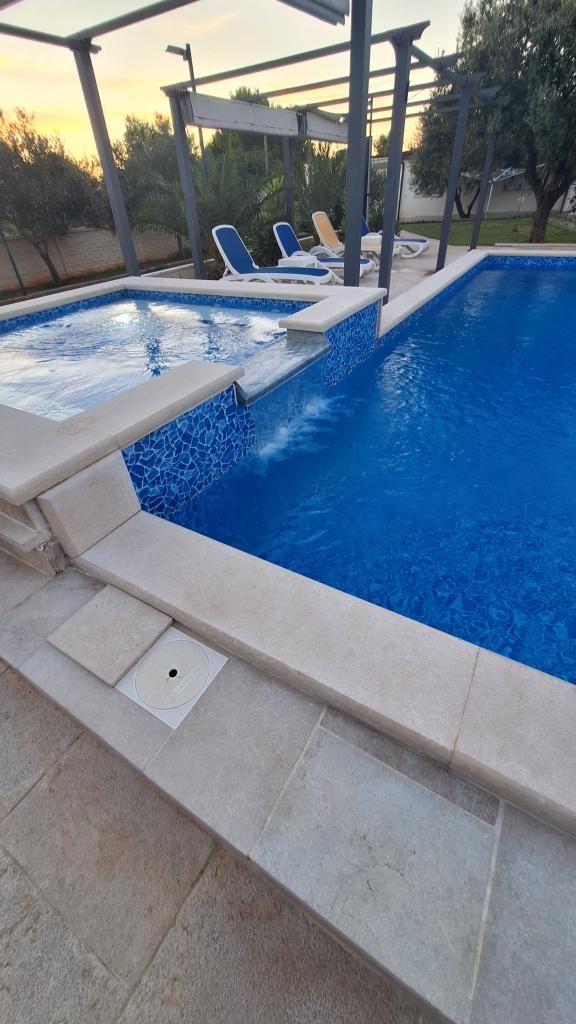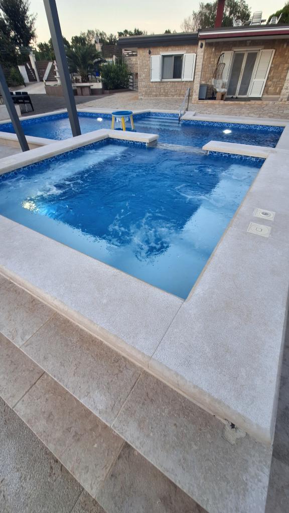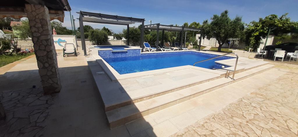 Rekreační dům s vyhřívaným bazénem a masážním bazénem s umělým vodopádem. Bazén má rozměry 8x4 m a masážní bazén 3x3 m. Je vzdálen 200 metrů od pláže. Nedaleko se nachází restaurace, přístav pro kotvení lodí a pláž pro domácí mazlíčky. S grilem, parkoviště pro 3 auta.