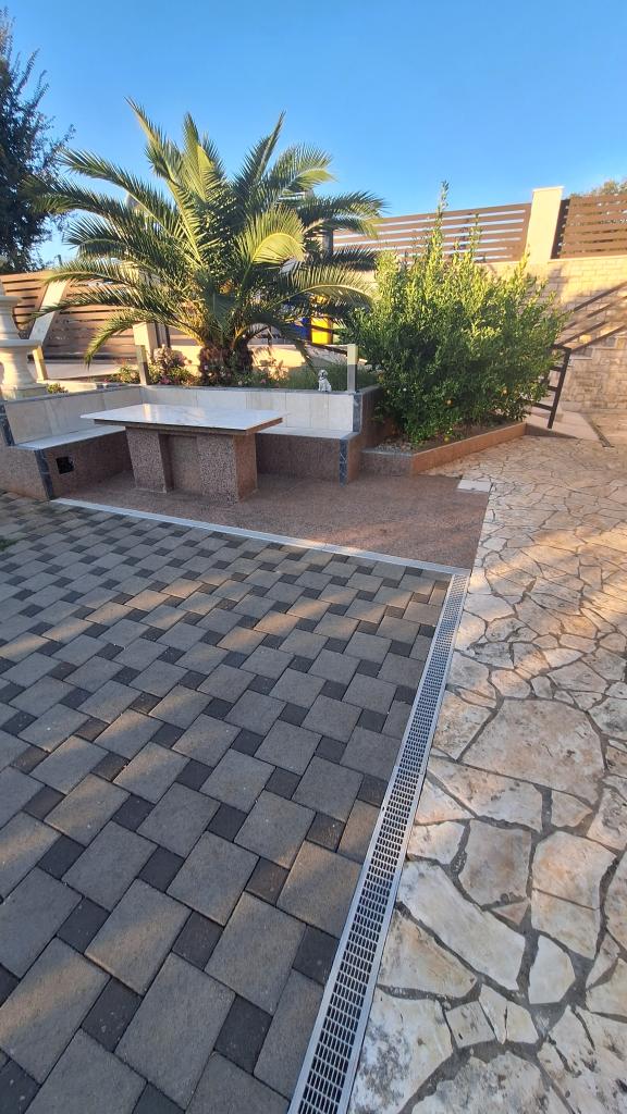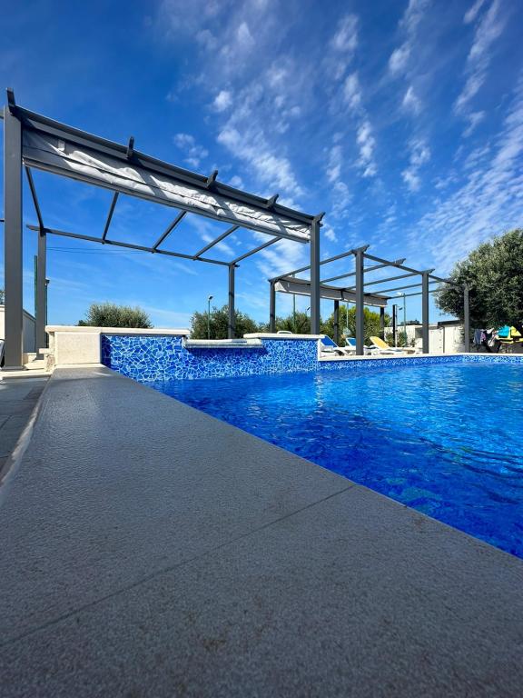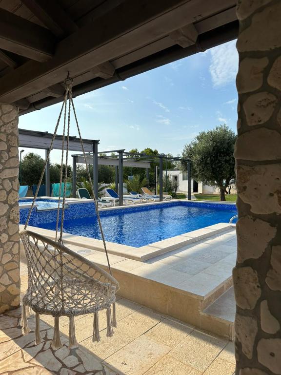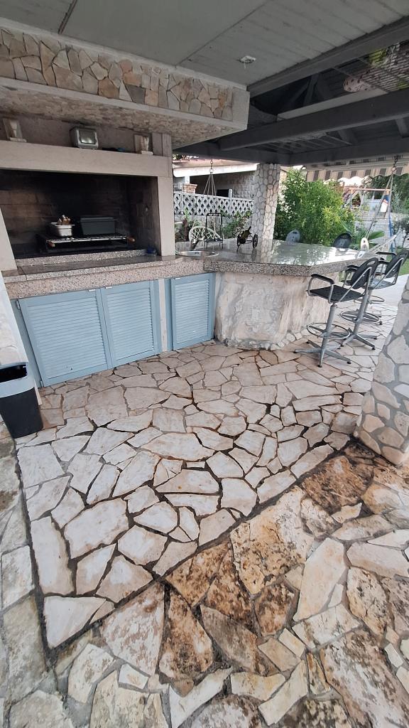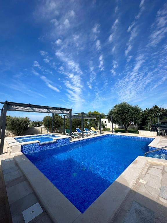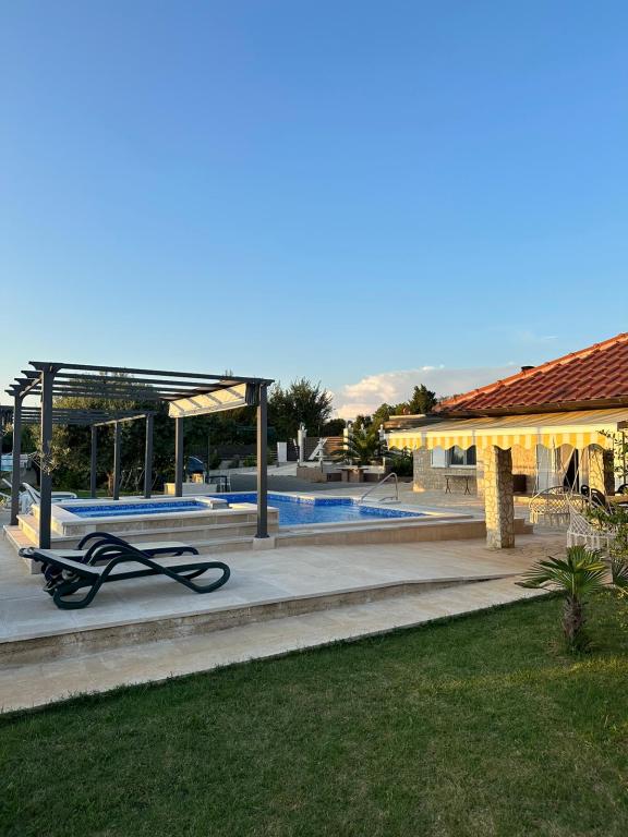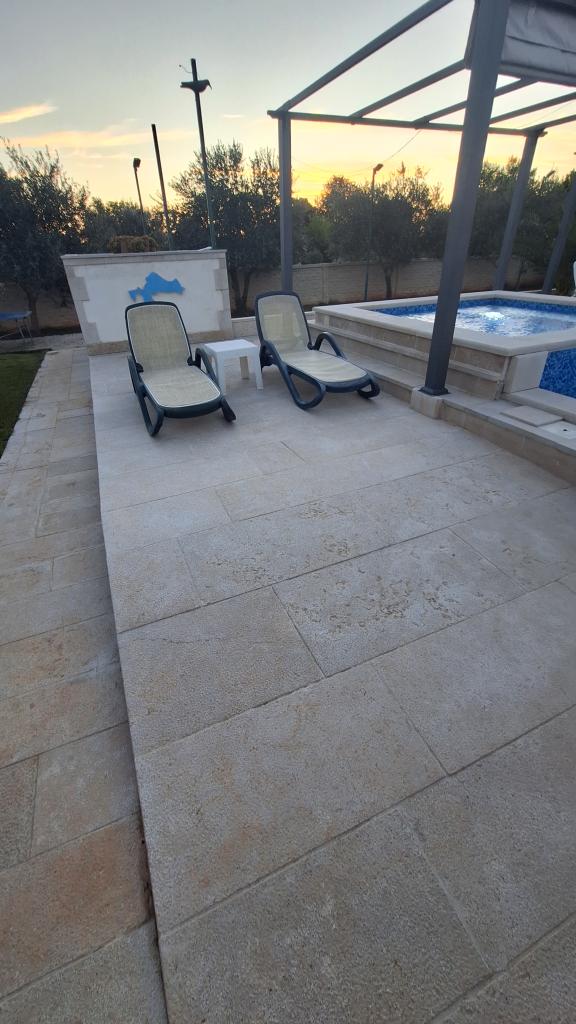 Rekreační dům s vyhřívaným bazénem a masážním bazénem s umělým vodopádem. Bazén má rozměry 8x4 m a masážní bazén 3x3 m. Je vzdálen 200 metrů od pláže. Nedaleko se nachází restaurace, přístav pro kotvení lodí a pláž pro domácí mazlíčky. S grilem, parkoviště pro 3 auta.