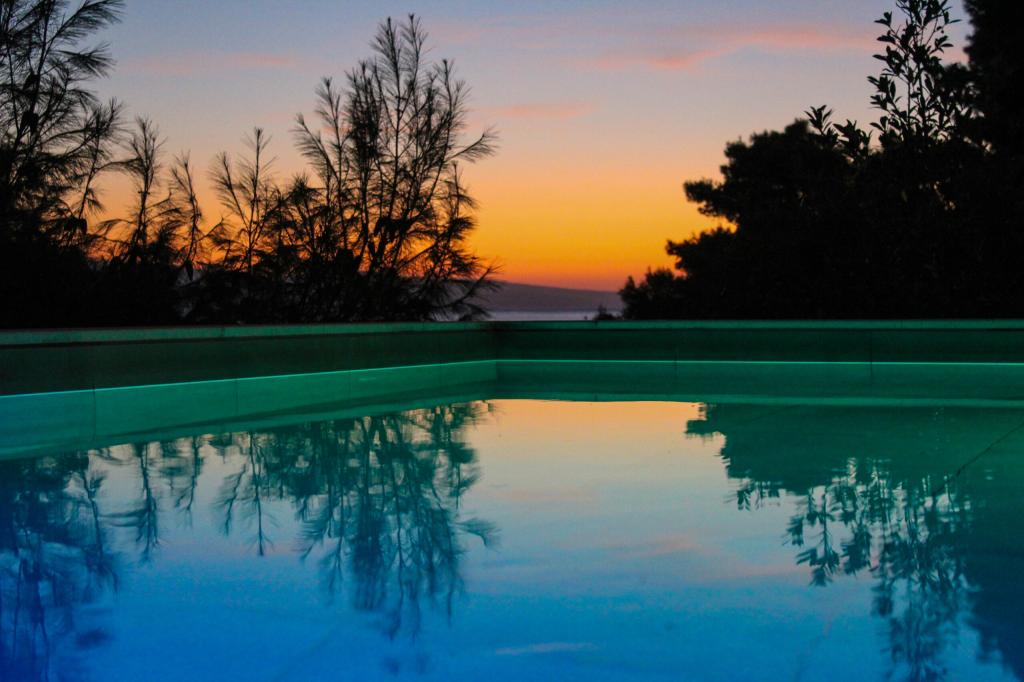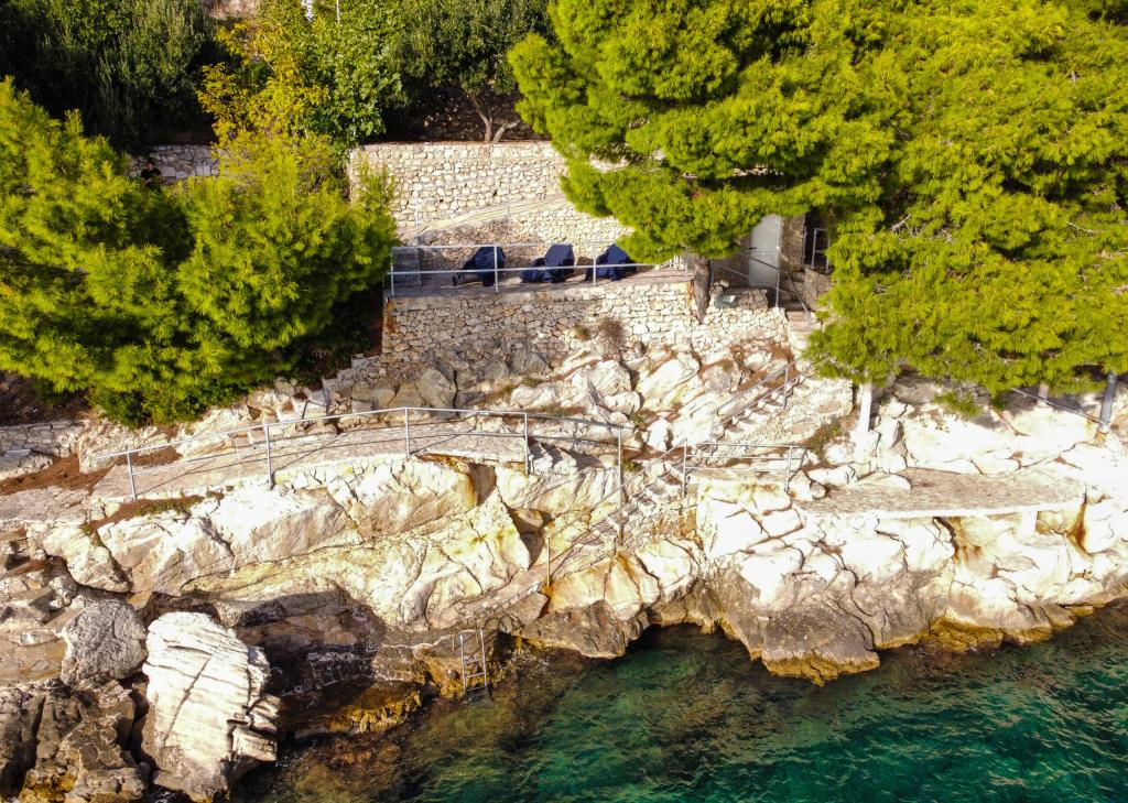 Garantovaná dvě lehátka na apartmán ve stínu borovic. Na pláži je také venkovní sprcha. Bodové světlo na pláži pro noční koupání pod domem.