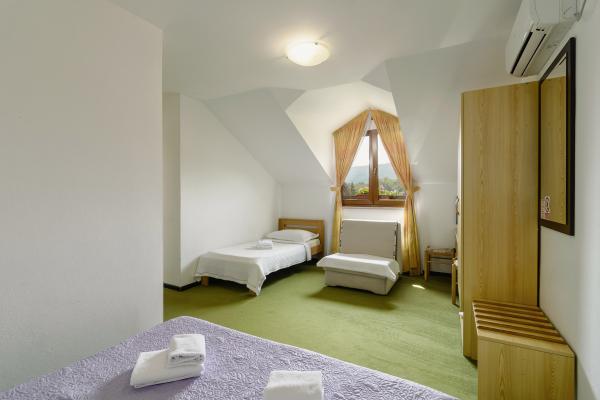 Pobytová taxa je v ceně.Z doplňkového obsahu máme otevřený sezónní bazén, adrenalinový park přes silnici (adrenalinový program, paintball, lukostřelba, airsoftový duel, zipline, osy tomahawku), badmintonový terén, cyklostezky s půjčovnou kol v našem zařízení a dětské hřiště. V ceně pokoje je bazén. Další příplatky jsou účtovány dle ceníku. Wifi je zdarma a je k dispozici ve veřejných prostorách i v pokojích.