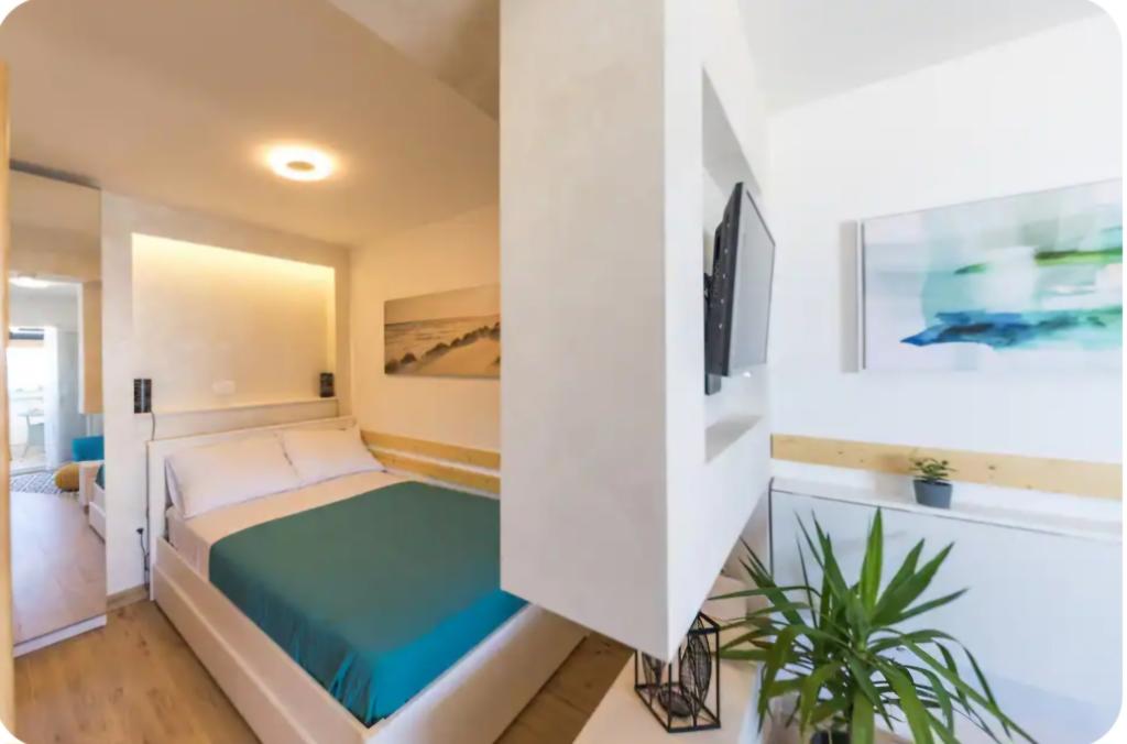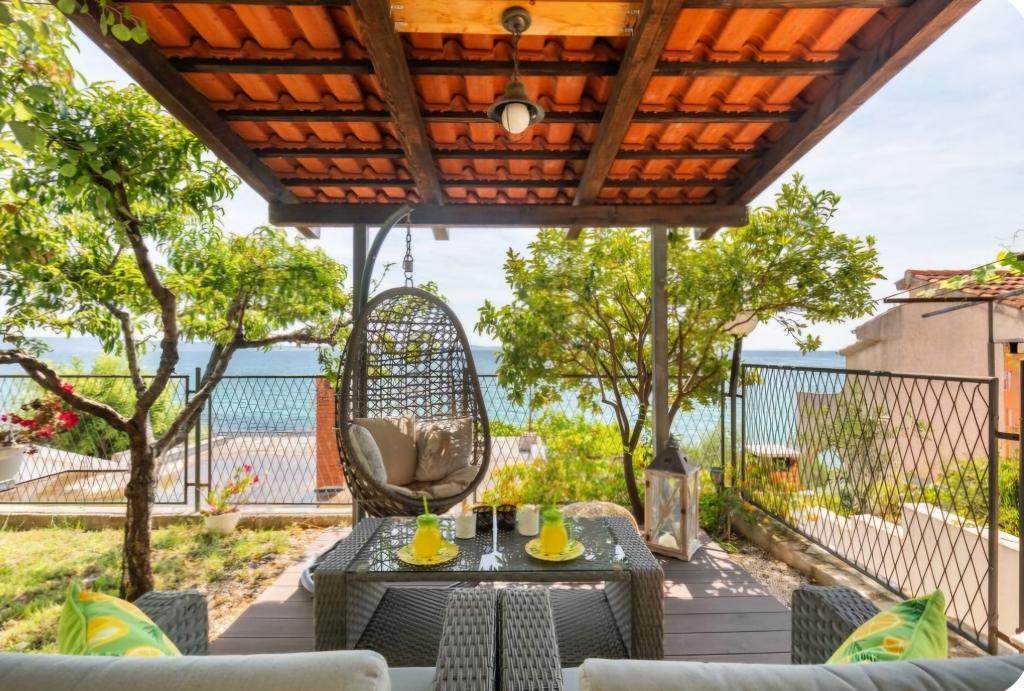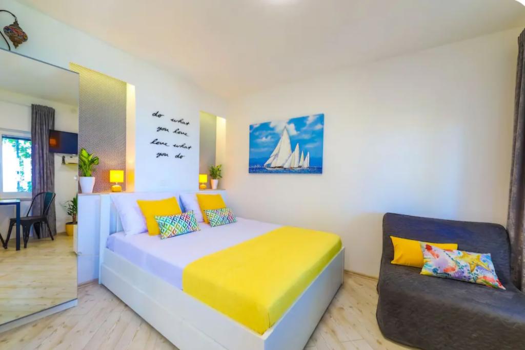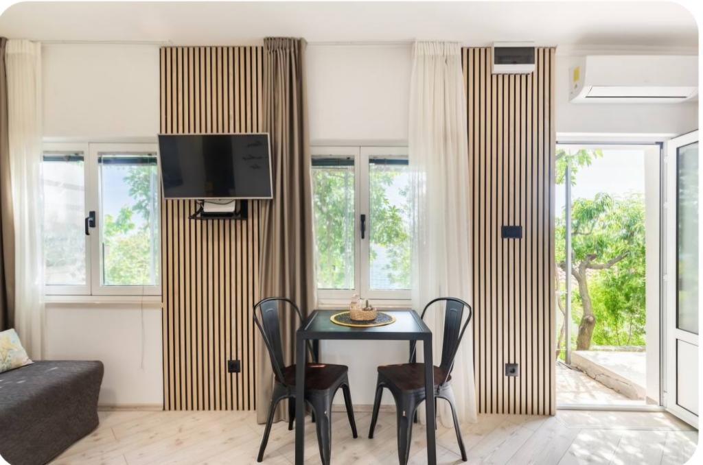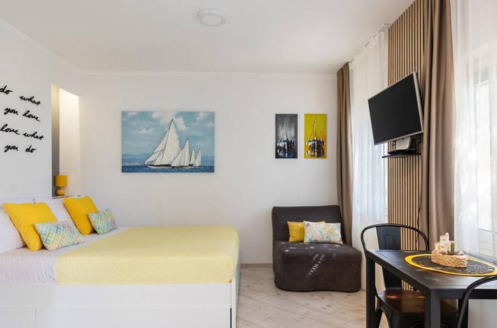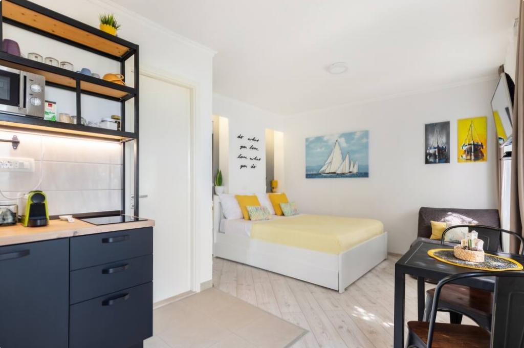 Velmi okouzlující studiový apartmán, 30 metrů od moře. K bytu náleží také soukromé parkoviště. Obývací pokoj v relaxační zahradě je to, co dává bytu vyniknout. V ceně jsou také lehátka a slunečníky.