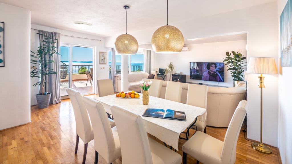 Byt se nachází v klidné turistické město Podstrana, v těsné blízkosti moře. Vše je blízko, obchody, rybí trh, supermarket, směnárna, sportovní centra, golfových hřišť, hotelů, restaurací. Byt má velkou terasu s krásným výhledem na moře, ostrovy a plavců.