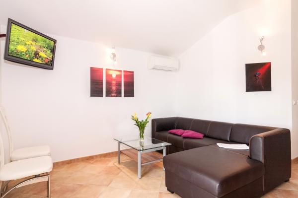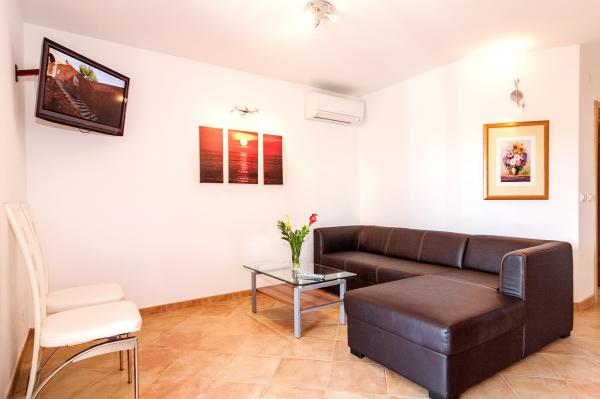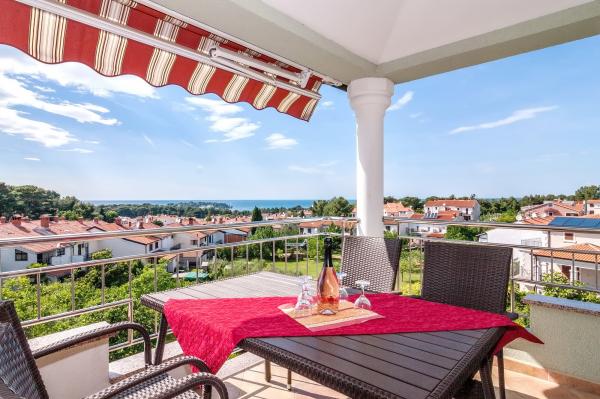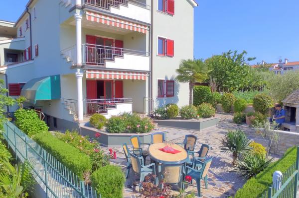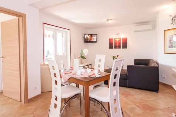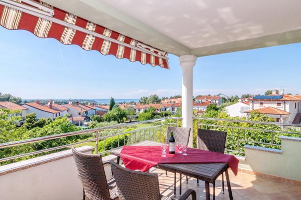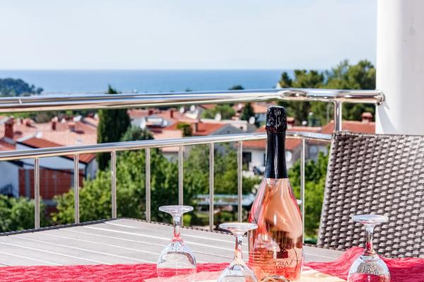 Luxusní apartmán Beethoven jako penthouse ve 2. patře vily Symphonie s 270 stupňovými výhledy na Laguna Blue a Jaderské moře do Benátek, stejně jako do italských a slovinských Alp, může pohodlně spát až 5 osob. pozice tyto víly vás jistě potěší. Pokoje a dětské pokoje (3 lůžka) mají vlastní elegantní koupelny a dostatek prostoru. Kuchyně je plně zařízená jako jídelna. s: keramickým sporákem a troubou, mrazničkou, mikrovlnnou troubou, myčkou, vysavačem. Na balkoně s elektrickým závěsem může pohodlně sedět 6 osob a vychutnat si nádherný výhled. Celý byt je hygienicky dlážděný a může být jednoduše udržován v čistotě. V bytě můžete strávit rodinu a také jako 2 páry, které mohou být společně a stále ještě nemusí zůstat bez \ osobního úhlu \. Dodatečné pohodlí zařízení: WLAN, klimatizace a topení, trezor, lednice, sedadla na kola, velký krb