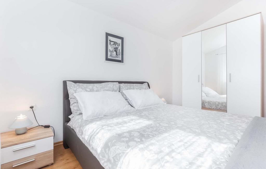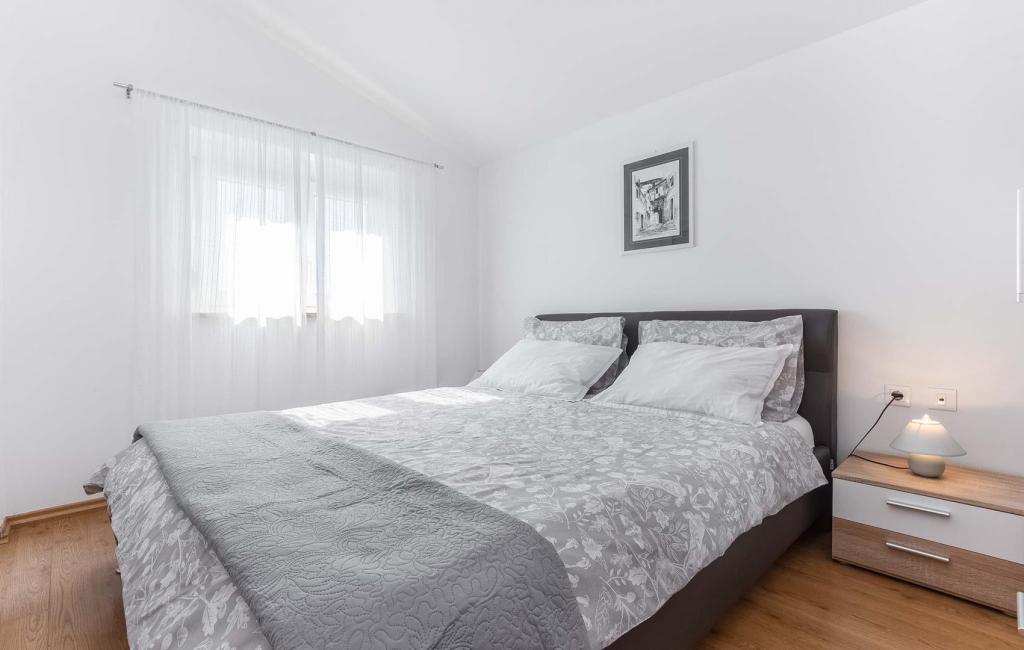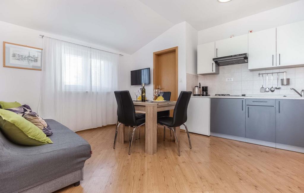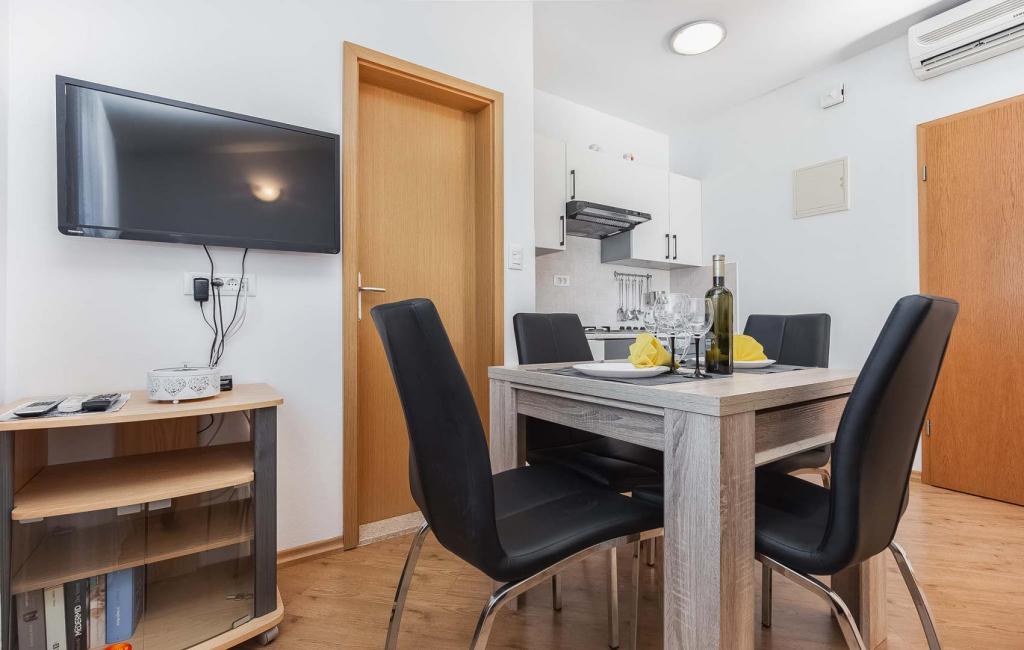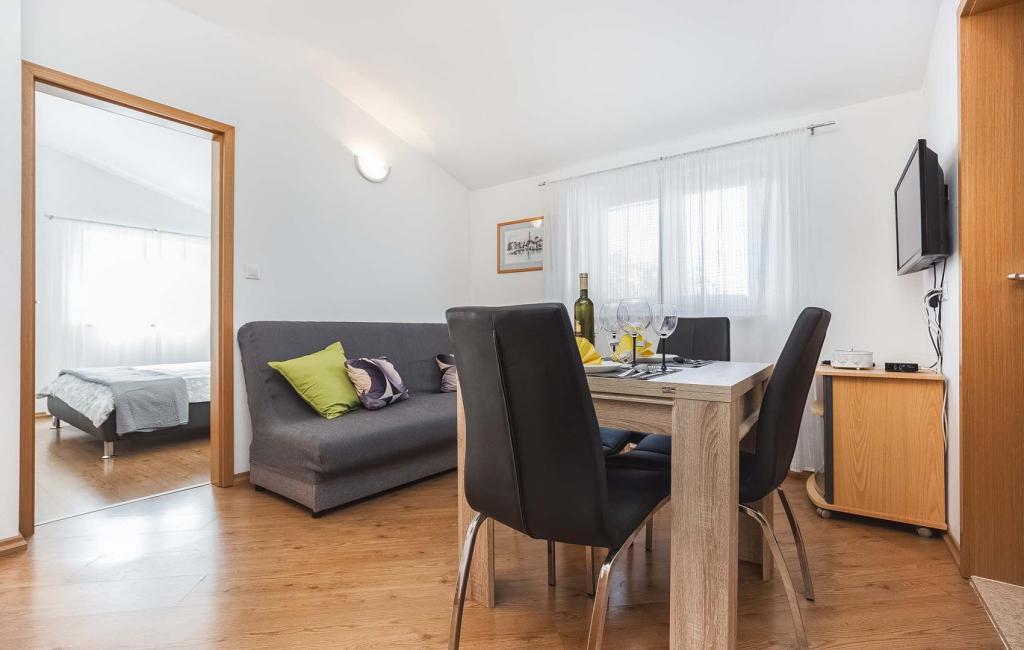 Apartmán Nikolina 1 B4 se nachází v bytovém domě v centru města, pouhých 200 metrů od pláže. Apartmán může ubytovat 4-5 osob. To má jednu ložnici s manželskou postelí, obývací pokoj s rozkládací pohovka, která slouží jako lůžko pro 2 osoby v jídelně a další pohovkou, která slouží jako ležel na pátou osobu. V kuchyni je plně vybaven. V obývacím pokoji je prostorný balkon. Parkování pro hosty je na silnici mimo budovu.