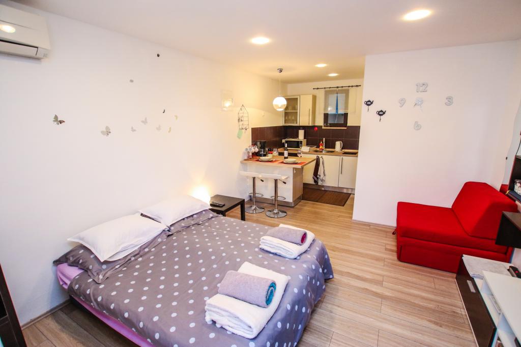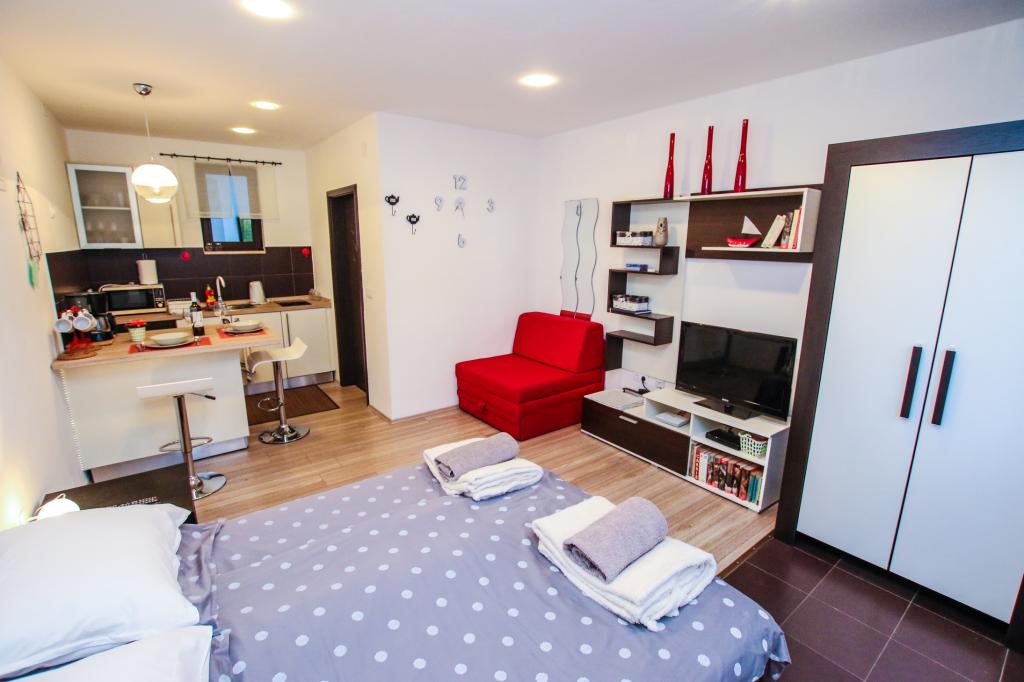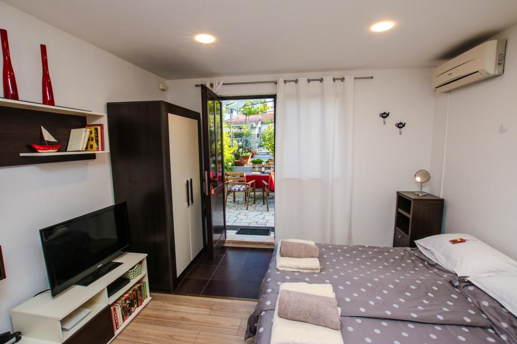 Pěkně zařízený byt a pokoj v klidné části města Poreč. Dům se nachází asi 10 minut chůze od centra a pláže. Apartmán s jednou ložnicí, obývacím pokojem s rozkládací pohovkou, standardní kuchyní, koupelnou a krásnou malou terasou s výhledem do zahrady. K dispozici je dvoulůžkový pokoj s manželskou postelí, vlastní koupelnou a lednicí. V bytě a pokoji je zdarma k dispozici WiFi internet, satelitní TV a klimatizace. V přední části domu je soukromé kryté parkoviště pro 2 auta (1 pro byt a 1 pro pokoj).