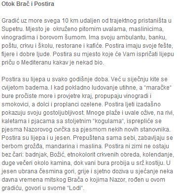 Postira je malé místo na mořském pobřeží. Apartmány Ruža vjetrova se nacházejí v samém centru města na pěší zóně. V samotném městě je několik krásných pláží, které jsou oblázkové a upravené. Krásná písečná pláž Lovrečina se nachází 3 km od obce. Klid a ticho jsou to, co přitahuje nejvíce hostů do apartmánů. Krásné pláže ve městě i mimo město s přírodním stínem, oblázkové, písečné... Nabízíme dva apartmány, dvoupokojové apartmány pro 4 osoby a jednopokojové apartmány pro 2 osoby. Na přání hosta lze přidat dětskou postýlku. Moderně vybavené apartmány mají vše, co hosté potřebují pro příjemnou dovolenou a relaxaci. Máme pračku, myčku. kávovar, žehlička se stojanem. Apartmány jsou klimatizované (dvoupokojový apartmán má další klimatizaci na pokoji). Oba apartmány mají připojení k internetu, které je zahrnuto v ceně. Dvoupokojový apartmán má terasu s výhledem na moře. Jednopokojový byt má také terasu a nachází se v přízemí a je samostatným objektem. Pláž je vzdálena 50 m.