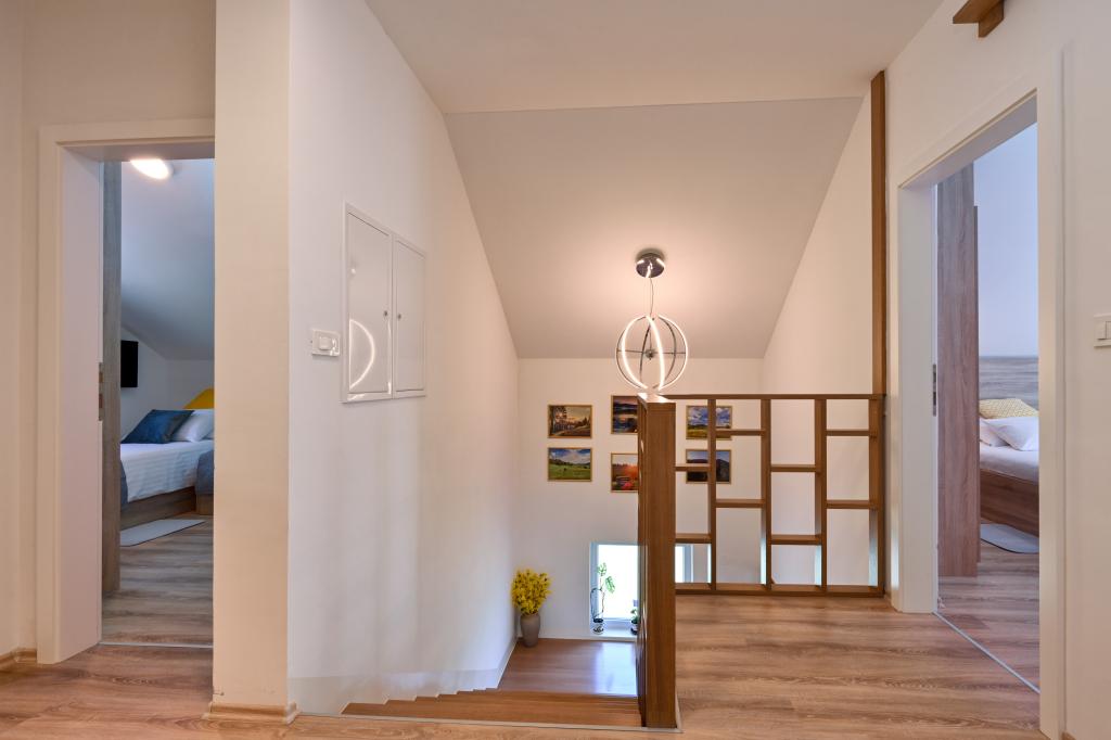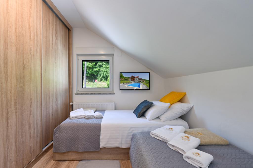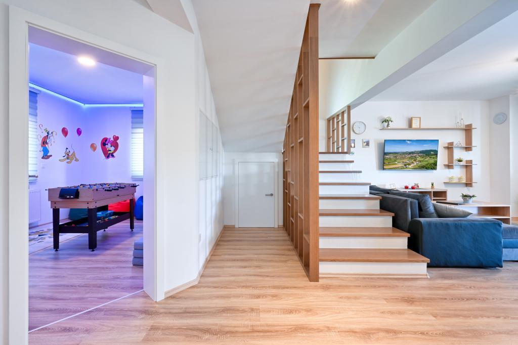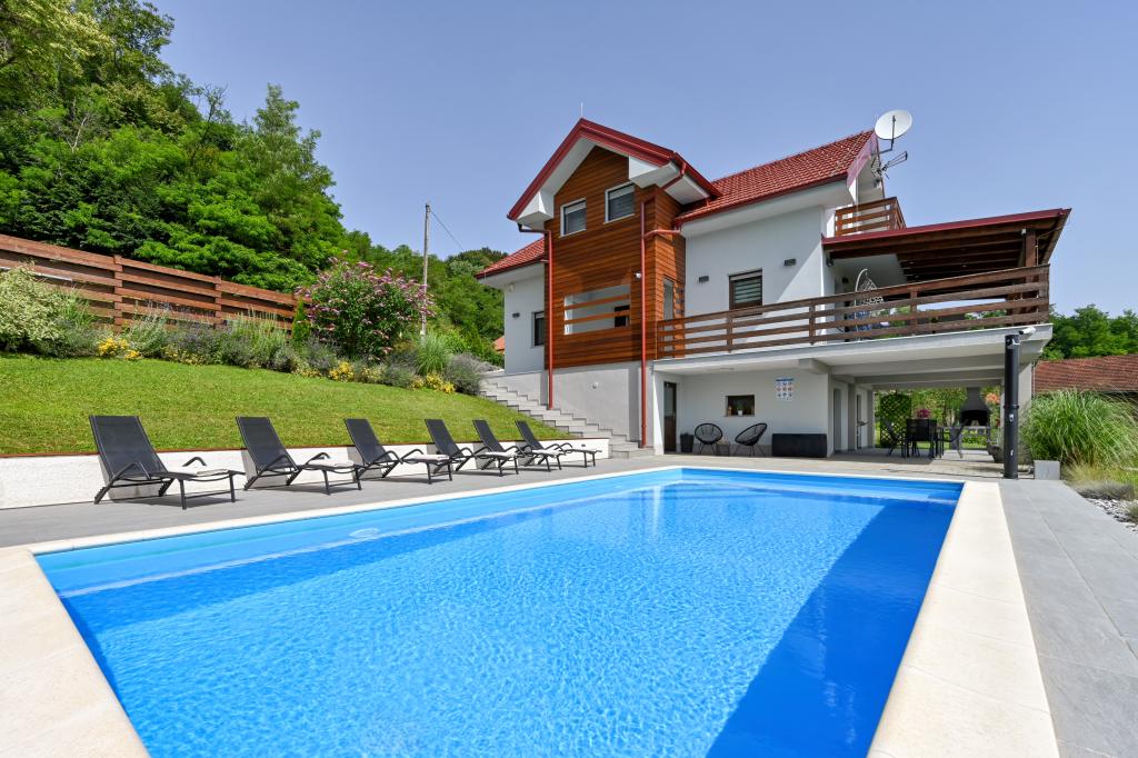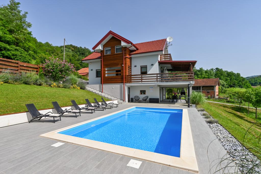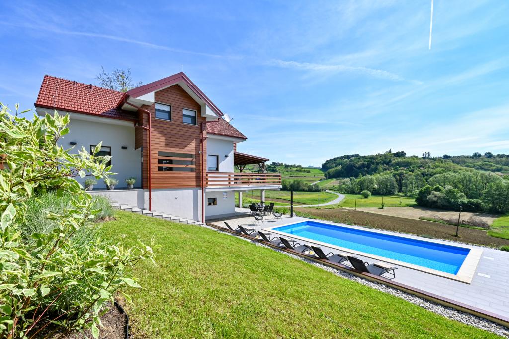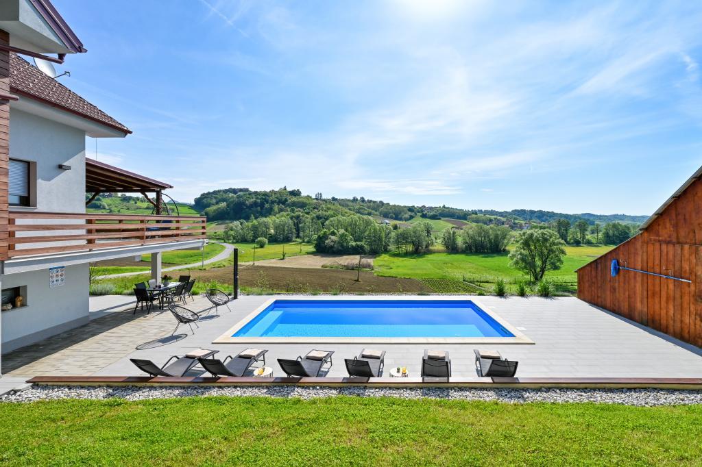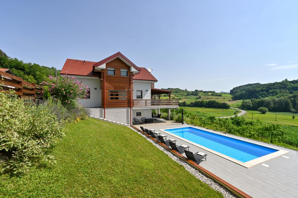 Tento neuvěřitelný dům se nachází na jednom z mnoha kopců krásného Zagorje. Obklopen kopci, vinicemi, sady a lesy, je ideálním místem pro zábavu a odpočinek v přírodě. Nádherný výhled, který se táhne, vám umožní vychutnat si krásné východy slunce, podle čehož dům dostal své jméno. Sunrise Hill je zařazen do kategorie 4* a poskytuje pohodlné ubytování pro 8 osob a je primárně orientován na rodiny s dětmi. Je ideální pro klidnou dovolenou nebo společenské setkání, ale také pro rekreaci a sport. Kromě upravené zahrady, která nabízí velký bazén se sprchou a krytou a otevřenou terasou, gril, domeček na hraní, parkoviště, zdobí dům pečlivě zdobený interiér, kterému dominuje dřevo a světlé a uklidňující tóny. Dům se skládá z přízemí s prostorným obývacím pokojem s kuchyní a jídelnou, koupelnou, dětskou hernou se stolním fotbalem, herní konzolí PS 4 a deskovými hrami a prostornou terasou, která láká k odpočinku a socializaci. V prvním patře domu jsou tři ložnice.