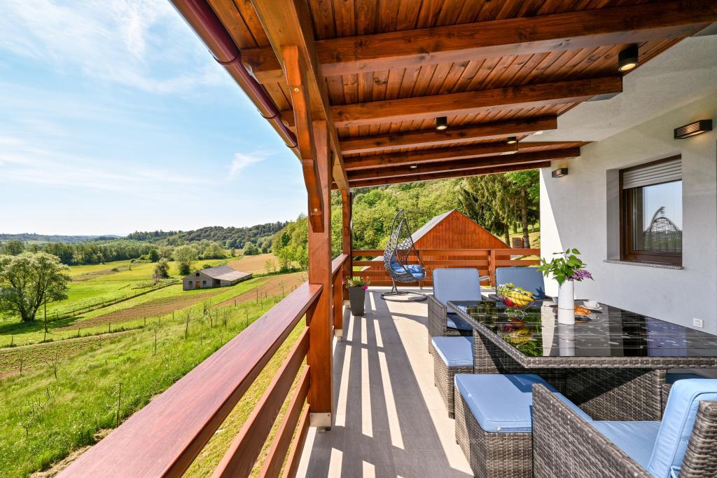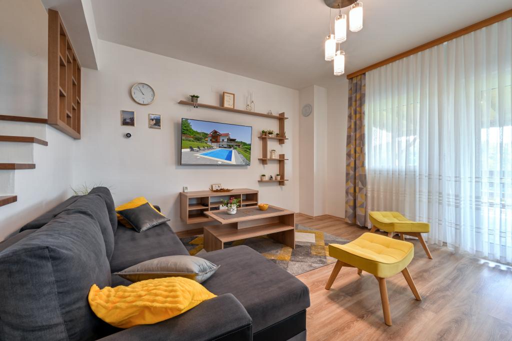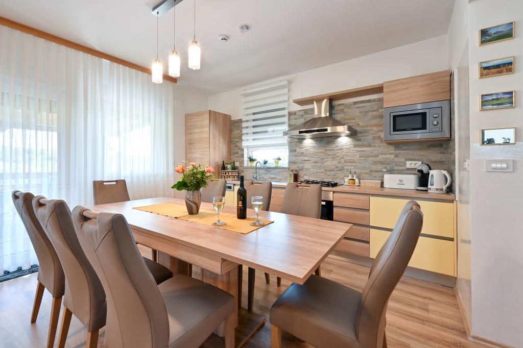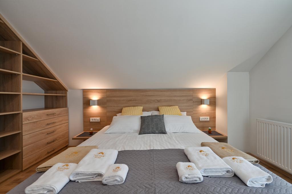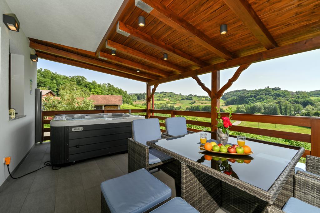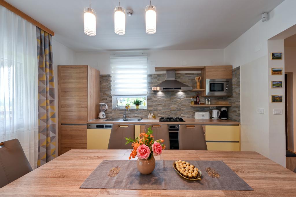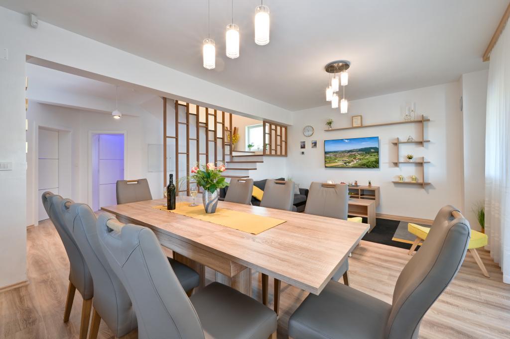 Tento neuvěřitelný dům se nachází na jednom z mnoha kopců krásného Zagorje. Obklopen kopci, vinicemi, sady a lesy, je ideálním místem pro zábavu a odpočinek v přírodě. Nádherný výhled, který se táhne, vám umožní vychutnat si krásné východy slunce, podle čehož dům dostal své jméno. Sunrise Hill je zařazen do kategorie 4* a poskytuje pohodlné ubytování pro 8 osob a je primárně orientován na rodiny s dětmi. Je ideální pro klidnou dovolenou nebo společenské setkání, ale také pro rekreaci a sport. Kromě upravené zahrady, která nabízí velký bazén se sprchou a krytou a otevřenou terasou, gril, domeček na hraní, parkoviště, zdobí dům pečlivě zdobený interiér, kterému dominuje dřevo a světlé a uklidňující tóny. Dům se skládá z přízemí s prostorným obývacím pokojem s kuchyní a jídelnou, koupelnou, dětskou hernou se stolním fotbalem, herní konzolí PS 4 a deskovými hrami a prostornou terasou, která láká k odpočinku a socializaci. V prvním patře domu jsou tři ložnice.