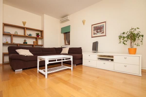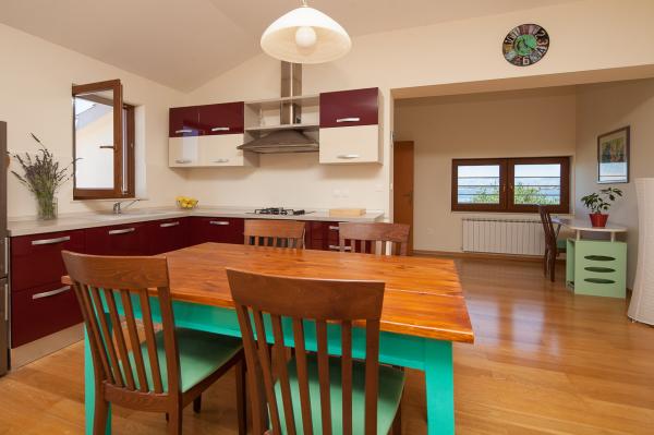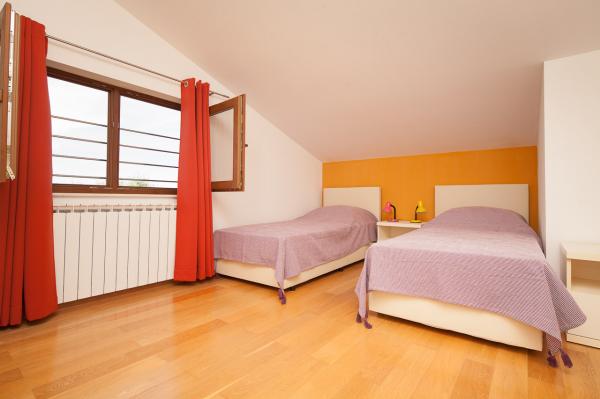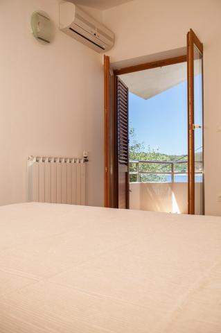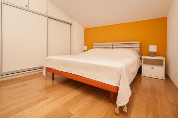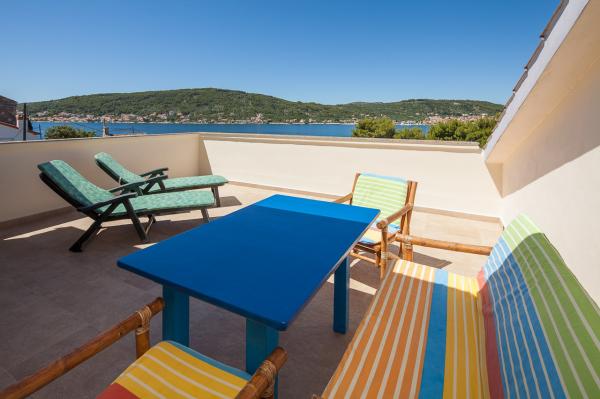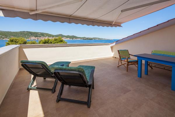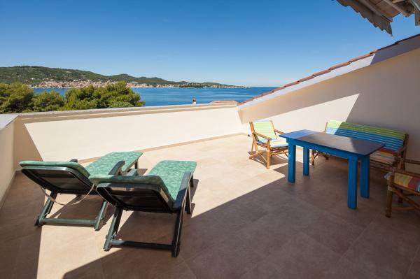 Prostorný byt s výhledem na moře z každé místnosti, s velkou terasou 25 m2 s výhledem na moře a ostrov Ugljan. Byt se nachází v podkroví domu, na malém ostrově Ošljak, první ostrov do Zadaru. Byt má dvě ložnice. Pokoj s balkonem má manželskou postel o rozměrech 180 x 200 cm a skříň a výhled na moře a ostrov Ugljan. Druhá ložnice má dvě lůžka měřící 90 x 200 cm (což může být také snadno připojeny na velkou manželskou postelí) a komora. Pokud je to nutné, může být uveden dodatečný dětský krevetić.Ova pokoj má výhled na přístav, město Zadar, Velebit a část ostrova Ugljan. Koupelna je prostorná se sprchovým koutem a pračkou. Kuchyň má veškeré potřebné nádobí, lednice, trouba a myčka. Jeden klimatizace v obývacím a druhý v ložnicích apartmánech. V obývacím pokoji je velká rohová sedací souprava a televize a jídelnu otevřenou na terasu, která má stůl se židlemi a dvěma pohodlnými lehátky. Terasa je plná, pokud je to nutné, může být pokryta s markýzou.