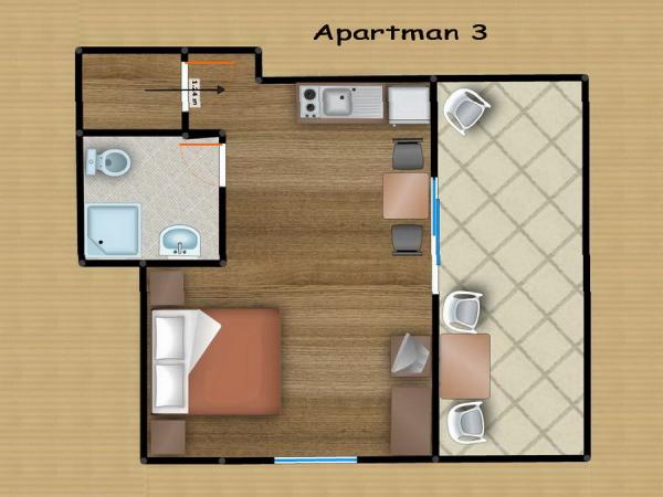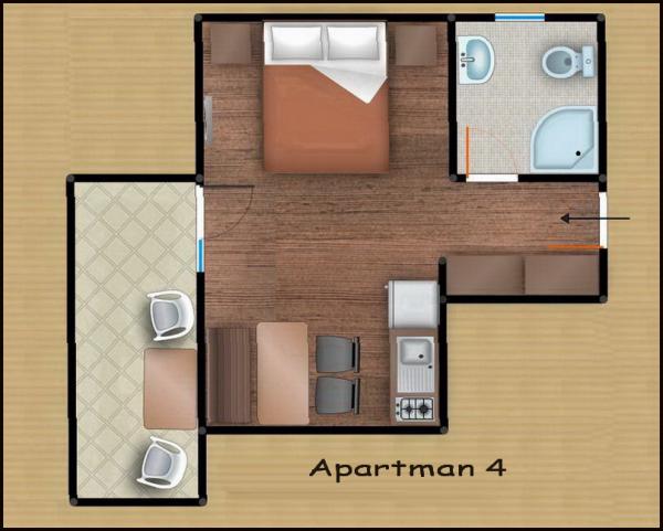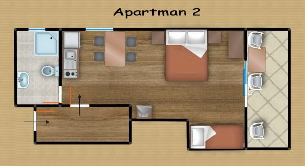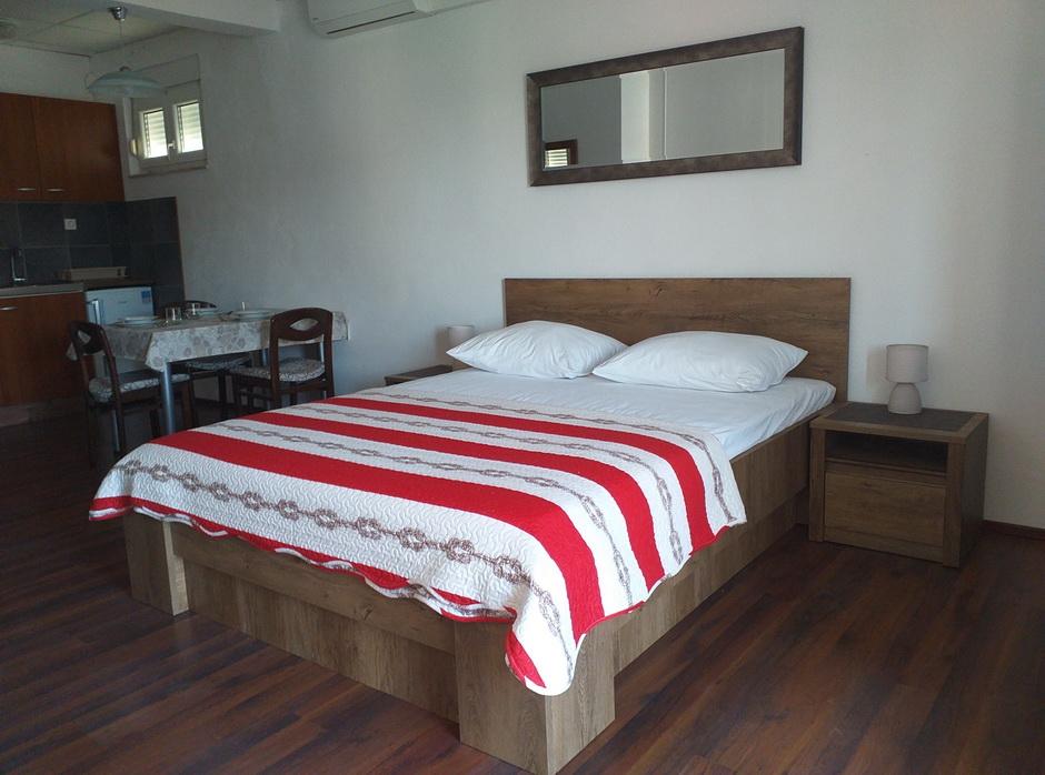 Komfortní apartmány pro dvě až tři osoby. S terasou, klimatizací, parkováním a satelitní TV a připojením k internetu 400 m od pláže a moře v klidném a relaxačním prostředí. V ceně: Klimatizace, Parkování, WI-FI, TV, SAT, Pobytová taxa, ložní prádlo, ručníky, nádobí na přípravu a konzumaci jídel, příbory.