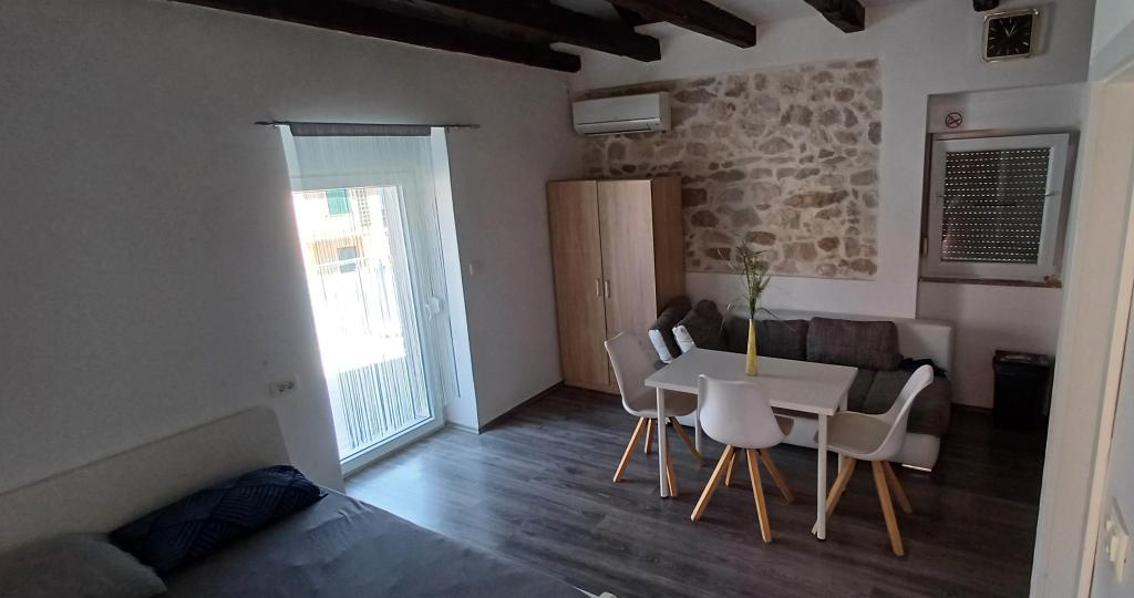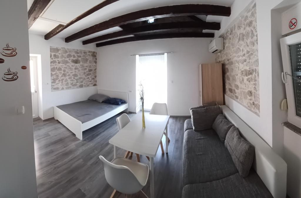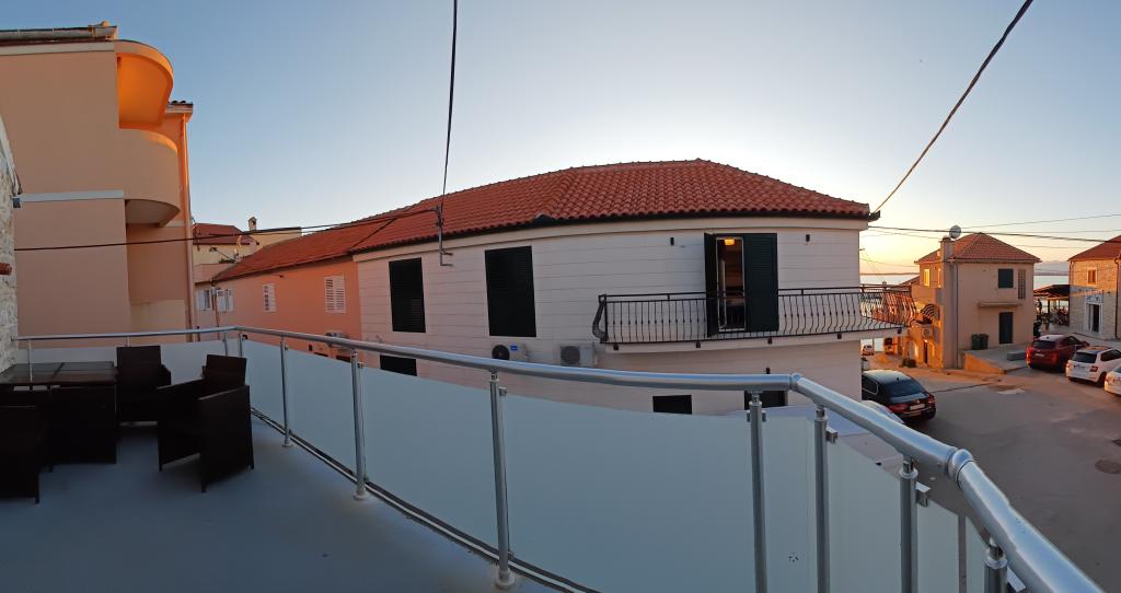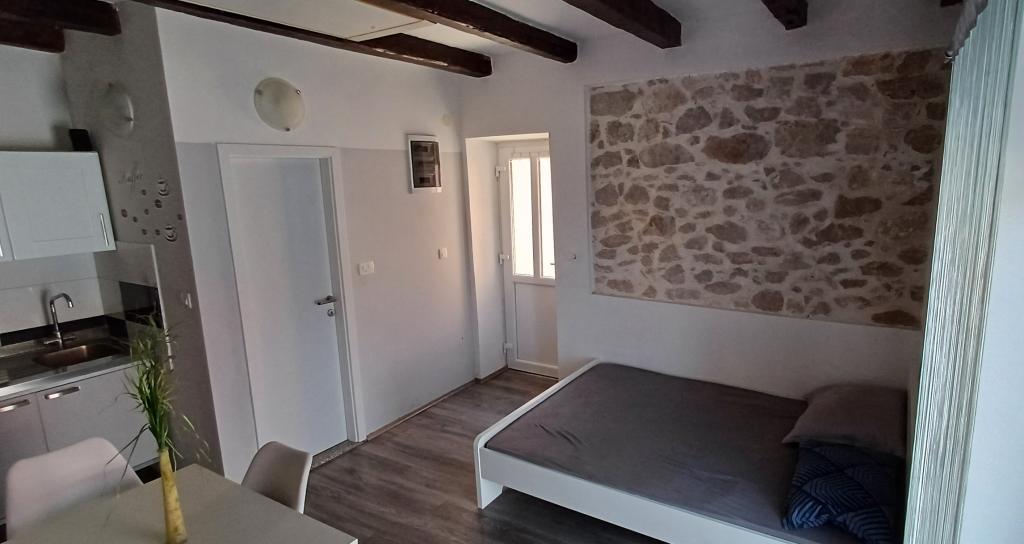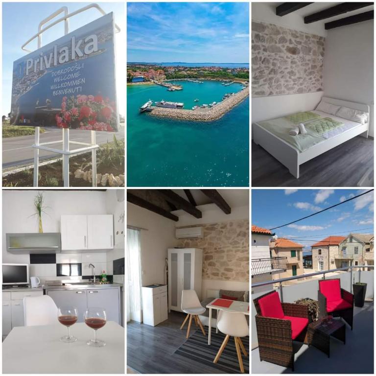 Studio (460x440) ve starém centru Privlaky v prvním patře se samostatnou koupelnou (110x210) se sprchou, WC a umyvadlem. Prostorná terasa (500x260) na severozápad s výhledem na moře, stínící markýza, posezení a stůl. Manželská postel (140x200) s přistýlkou (gauč 80x200) pro třetí osobu. Kuchyňská linka s elektrickou varnou deskou bez trouby, lednicí s mrazákem, nádobím a nádobím, TV se satelitním příjmem, šatní skříní s věšáky a policemi, jídelním stolem a židlemi. Lokalita je klidná, obklopená rodinnými domy a apartmány, v bezprostřední blízkosti přístavu, písečných, skalnatých a betonových pláží a oblastí ke koupání. Také velmi blízko k zábavním zařízením, dětským hřištím a četným restauracím s širokou nabídkou ve všech cenových relacích. Jeden z nich (Skoby Street Food bar) se nachází přímo pod apartmánem, v přízemí stejné budovy, a můžete si ho objednat přímo ze svého balkónu! :) Ložní prádlo a ručníky nejsou k dispozici (BYO)!