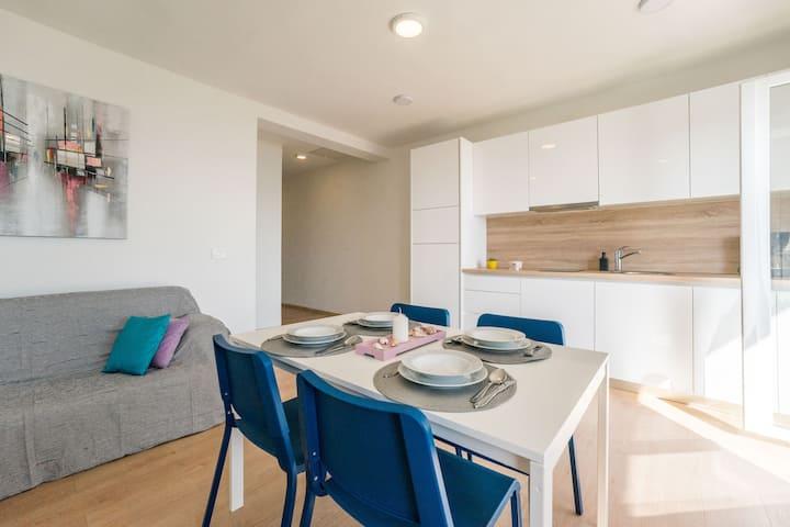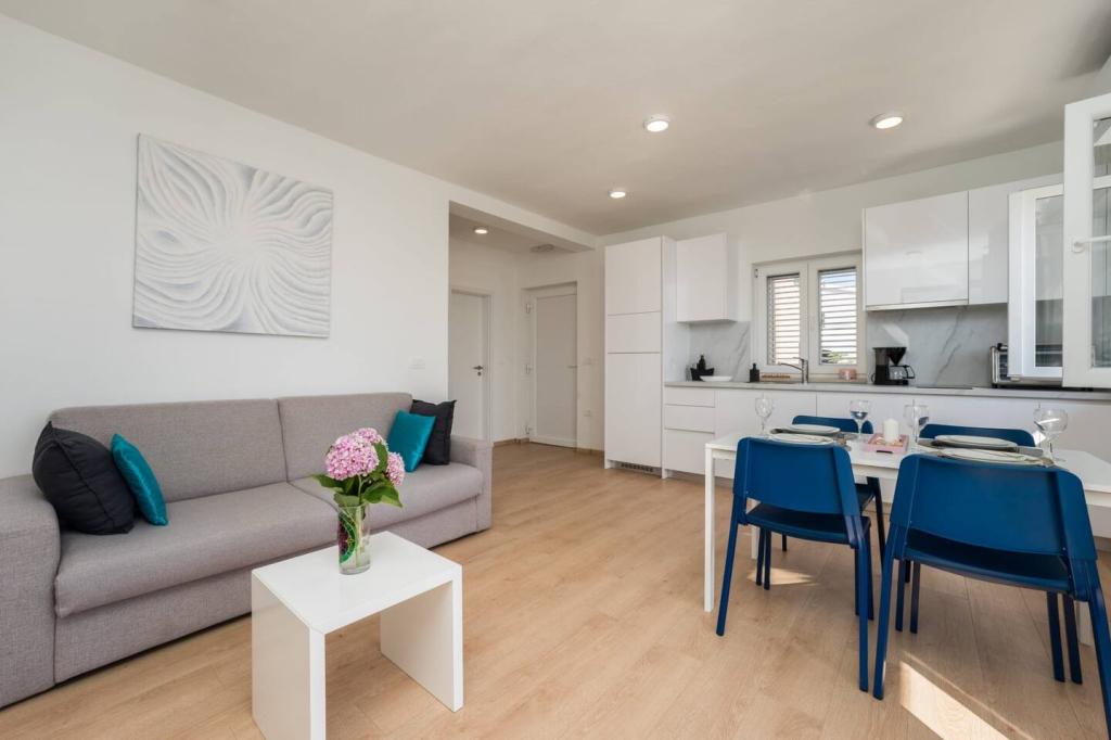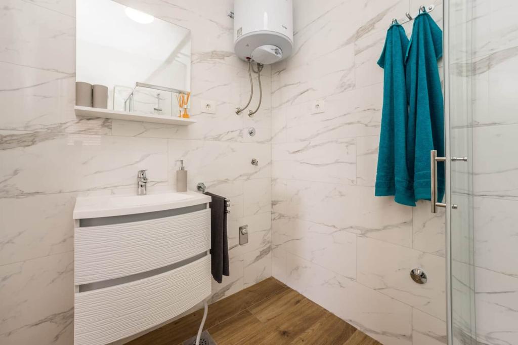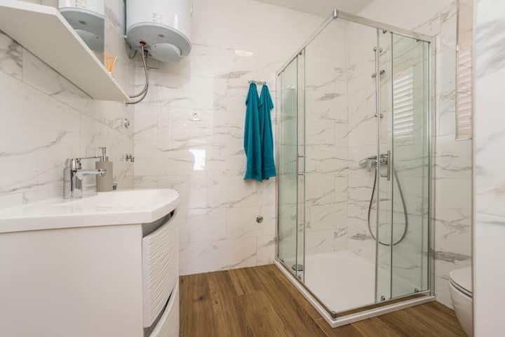 Nové a moderní apartmány v domě v bezprostřední blízkosti moře, s krásným výhledem na moře. Písečná pláž je nedaleko a můžete se koupat před domem. K dispozici je bezplatné Wi-Fi, klimatizace ve 2 pokojích a parkování je možné za nebo před domem. V blízkosti jsou obchody, kavárny a restaurace. Každý apartmán má 1 ložnici a pohovku v obývacím pokoji. Obývací pokoj je propojen s kuchyní. Má koupelnu a samostatné WC. K dispozici je pěkná terasa s mimořádným výhledem na moře a malý stůl, kde si ráno nebo večer se západem slunce můžete vychutnat snídani. Užijte si odpočinkovou dovolenou v těchto krásných apartmánech.