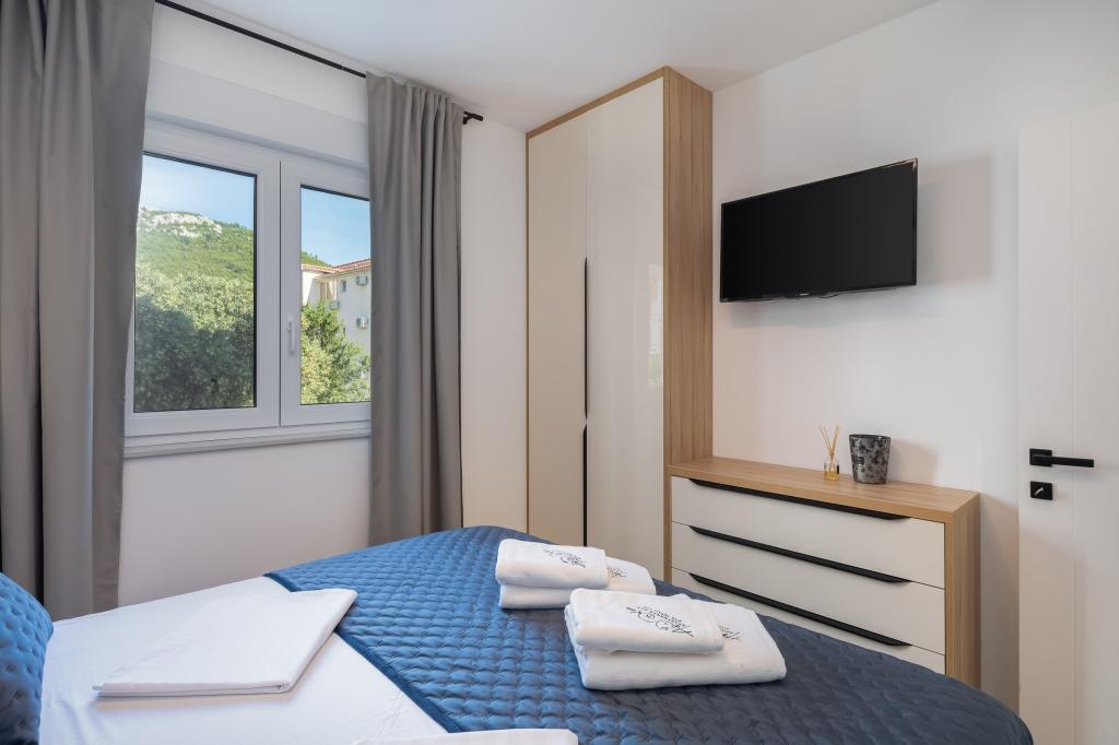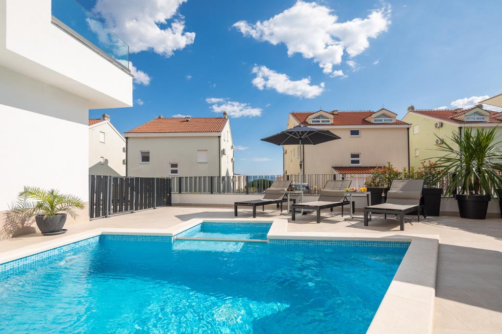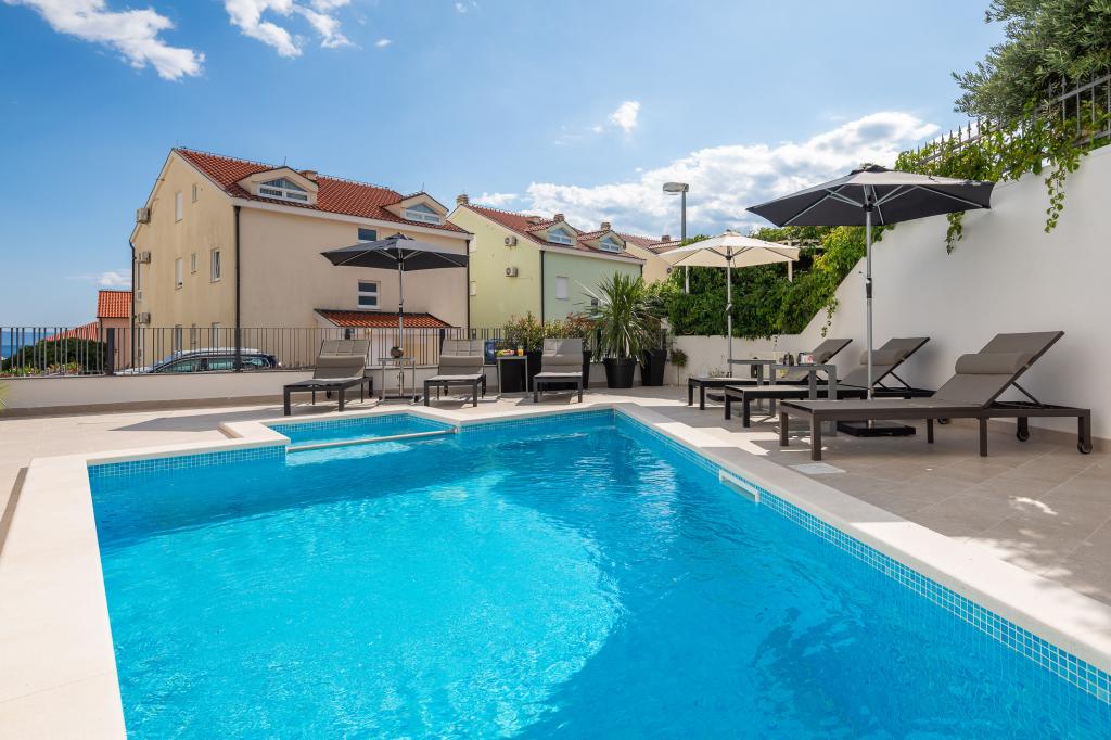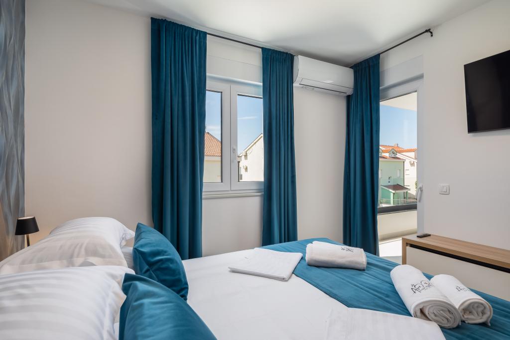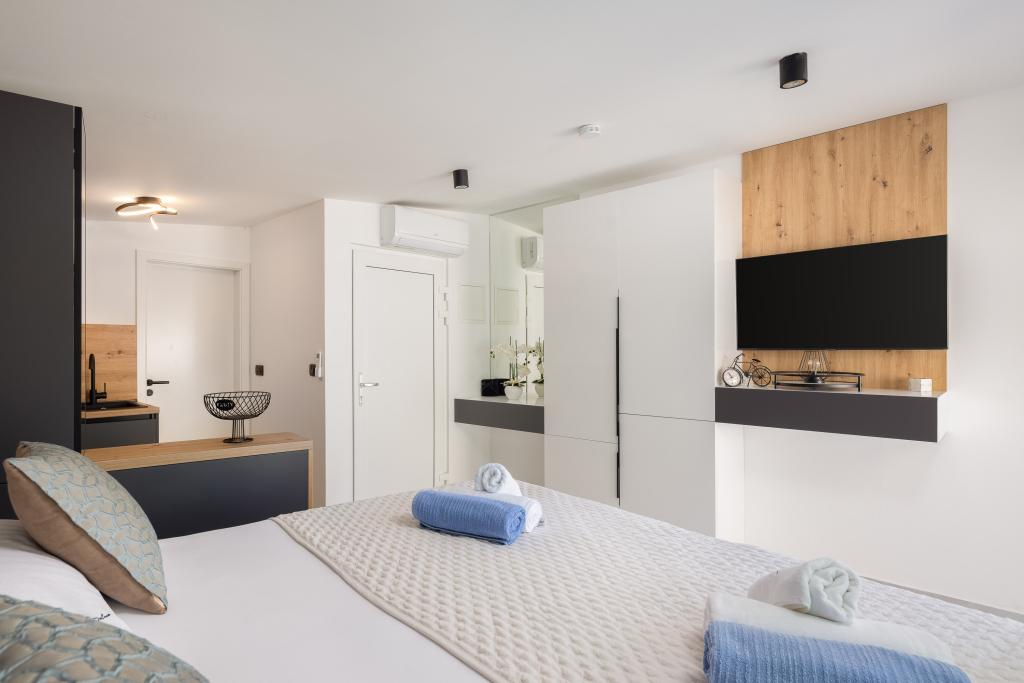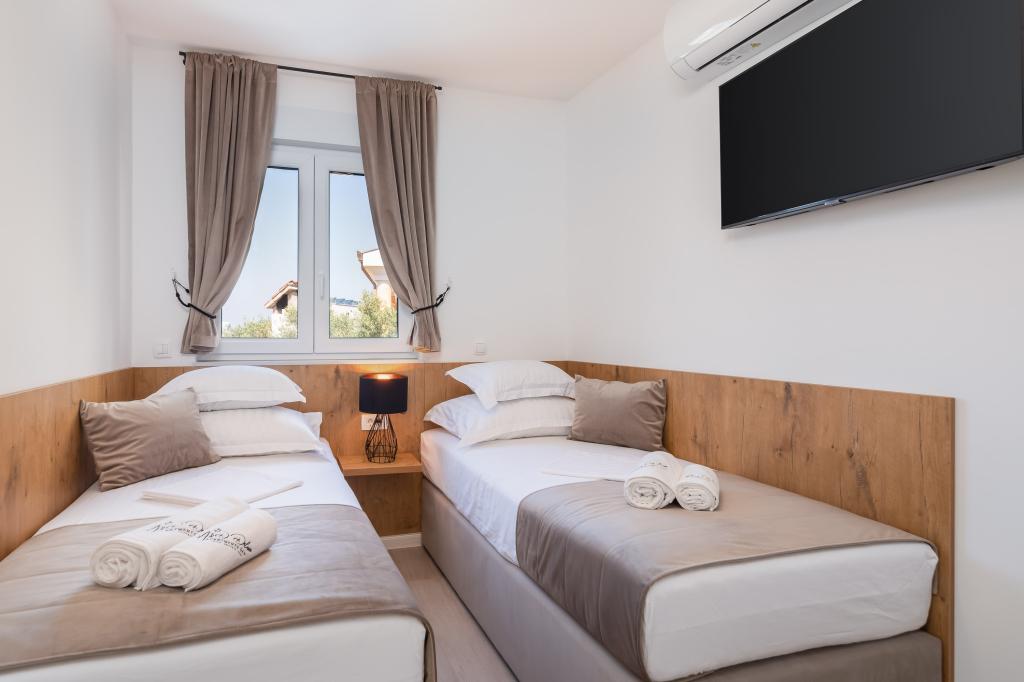 Představujeme vám apartmány A&D Deluxe s bazénem, komfortní ubytovací jednotky umístěné v docházkové vzdálenosti od moře, pouhých 300 metrů. Každý apartmán nabízí dokonalou kombinaci komfortu a luxusu. Apartmán A1 se 2 ložnicemi, 2 koupelnami a prostornou terasou nabízí částečný výhled na moře a je ideálním místem k odpočinku pro rodiny nebo malé skupiny. Hosté mají navíc přímý přístup do bazénu, který jim umožňuje vychutnat si občerstvení a další zábavu. Apartmá A2, také se 2 ložnicemi a 2 koupelnami, má také přístup k bazénu, což hostům umožňuje užít si další zábavu a relaxaci. Apartmán A3 s jednou ložnicí a koupelnou má také přístup k bazénu a je ideální pro páry nebo menší rodiny, které hledají odpočinkovou dovolenou u moře. Všechny apartmány jsou plně vybaveny, včetně kuchyní, soukromého parkoviště, klimatizací a chytrých televizorů, což zajišťuje komfort a pohodlí během vašeho pobytu. Užijte si luxus soukromého bazénu a blízkost krásných pláží v těchto apartmánech.