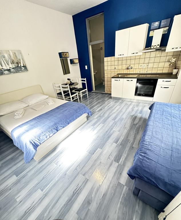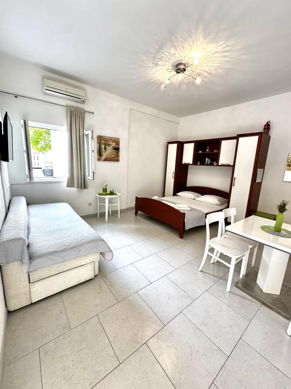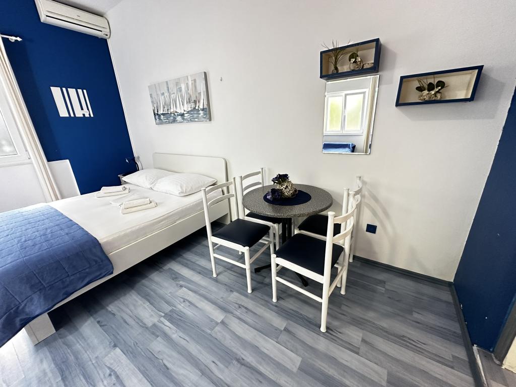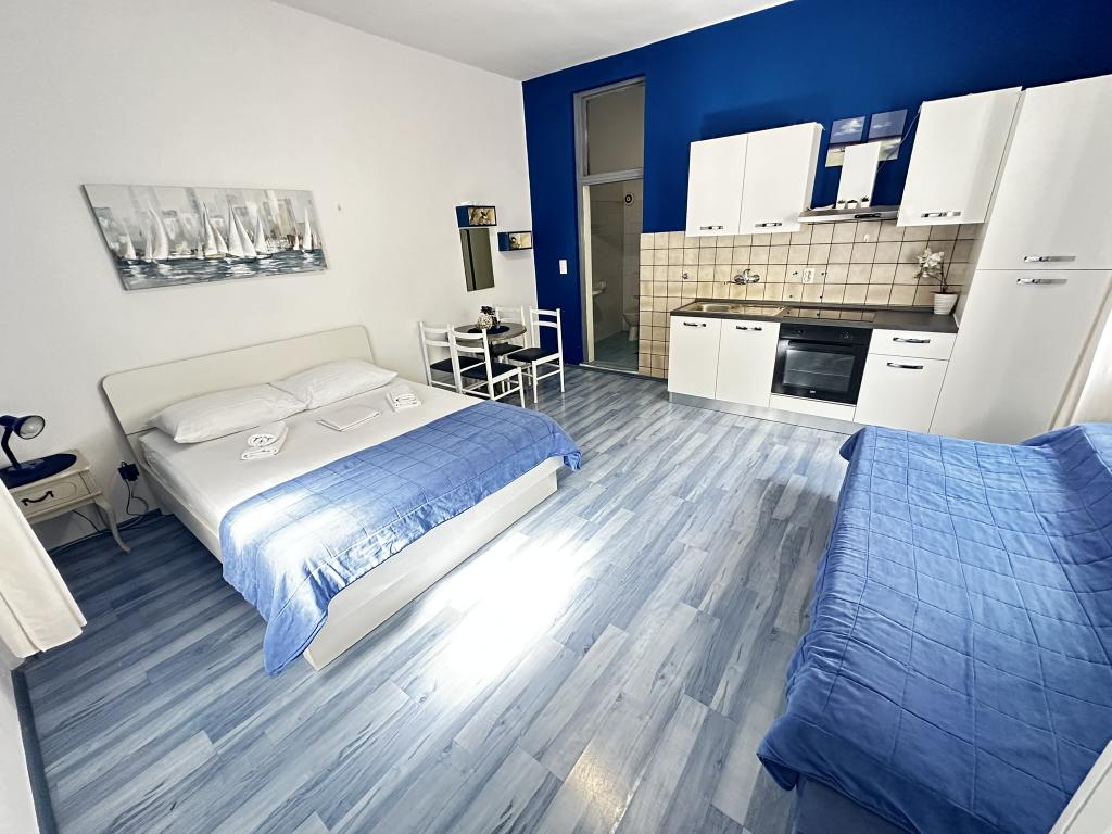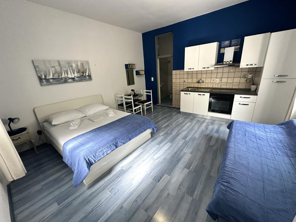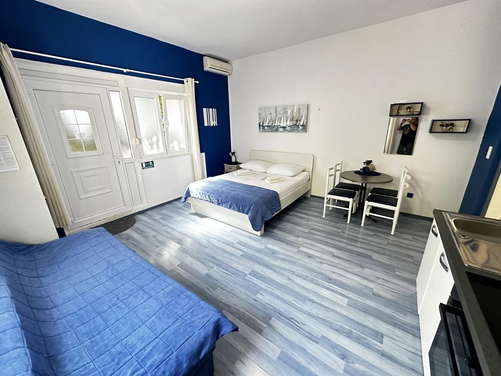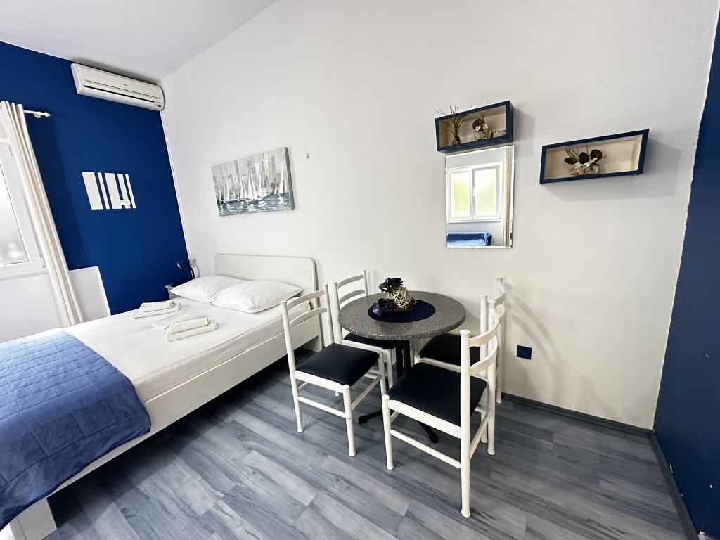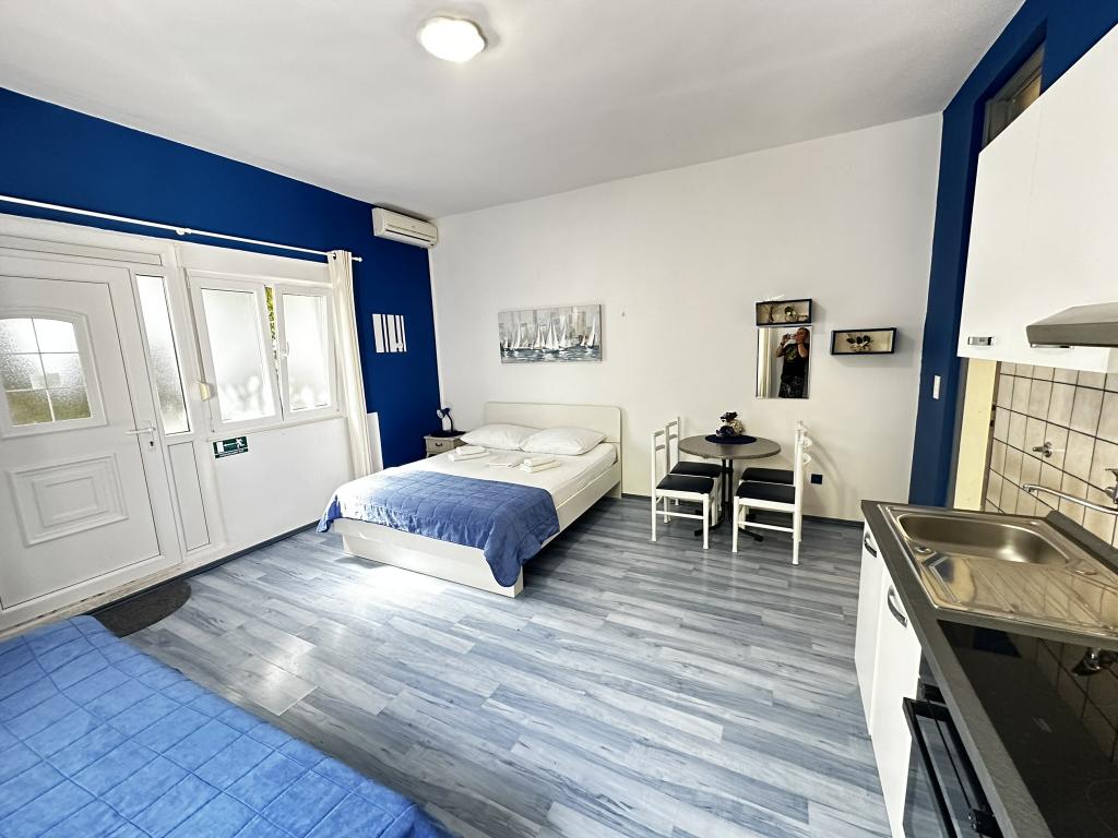 V nabídce jsou dva krásné dvoupokojové apartmány, plně vybavená a dvě klimatizovaná studia. Dvoupokojové apartmány mají dva pokoje s manželskou postelí. Jeden z apartmánů má možnost ubytovat další dvě osoby na gauči. Dvě studia mají každé dvojlůžko a rozkládací pohovku a jsou vhodná pro rodinu maximálně 4 osob, z toho 2 děti. Všechny koupelny ve dvoupokojových apartmánech jsou vybaveny sprchovým koutem a také pračkou a vysoušečem vlasů. Kuchyně jsou plně vybavené. Obsahují troubu, mikrovlnnou troubu, lednici, myčku a rychlovarnou konvici. Samozřejmě jsme se postarali i o veškeré kuchyňské náčiní, které potřebujete. Studio má koupelnu se sprchovým koutem, vybavenou kuchyň s mikrovlnnou troubou, sporákem a lednicí. Nachází se 300 metrů od moře v Promajně a mají bezplatné Wi-Fi a klimatizaci. V budově je k dispozici bezplatné soukromé parkoviště.