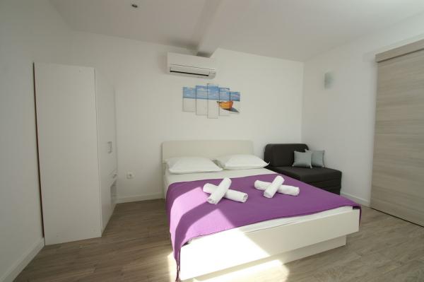 Apartmány v nově postavené budově, 60 metrů od krásné oblázkové pláže s přírodním stínem. Apartmány jsou plně vybaveny pro Váš příjemný pobyt. Parkování je zajištěno ve dvoře objektu. Všechny apartmány mají otevřený výhled na moře. V blízkosti se nachází trh se zeleninou, pekárna a trh. Pláž je vzdálená 80 metrů nebo 2 minuty chůze.