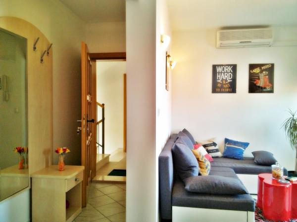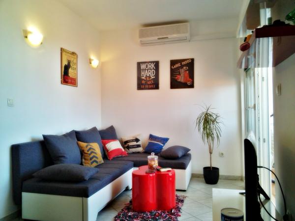 Apartmány se nachází trochu dál od centra, ale v blízkosti moře. To trvá jen pár minut, na pláž. Z terasy je tak krásný výhled na záliv chráněné před větrem. Apartmány jsou vybaveny vším, co potřebujete, aby vaše dovolená co nejpříjemnější. Centrum je 10 minut chůze od nejbližší restaurace během několika minut.