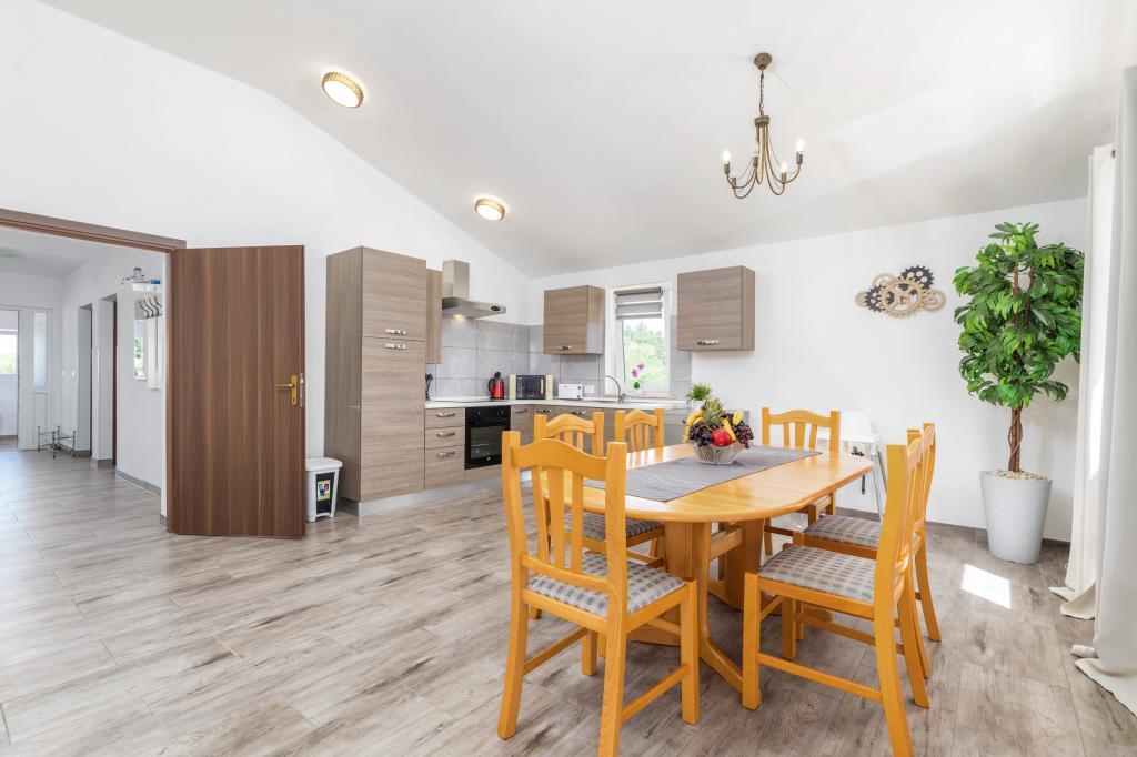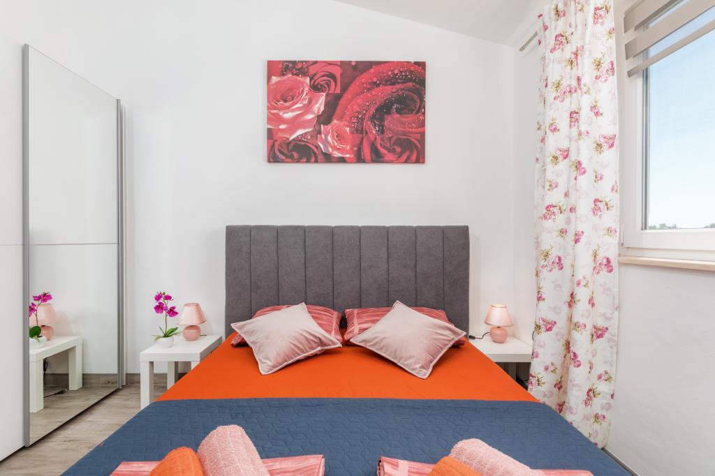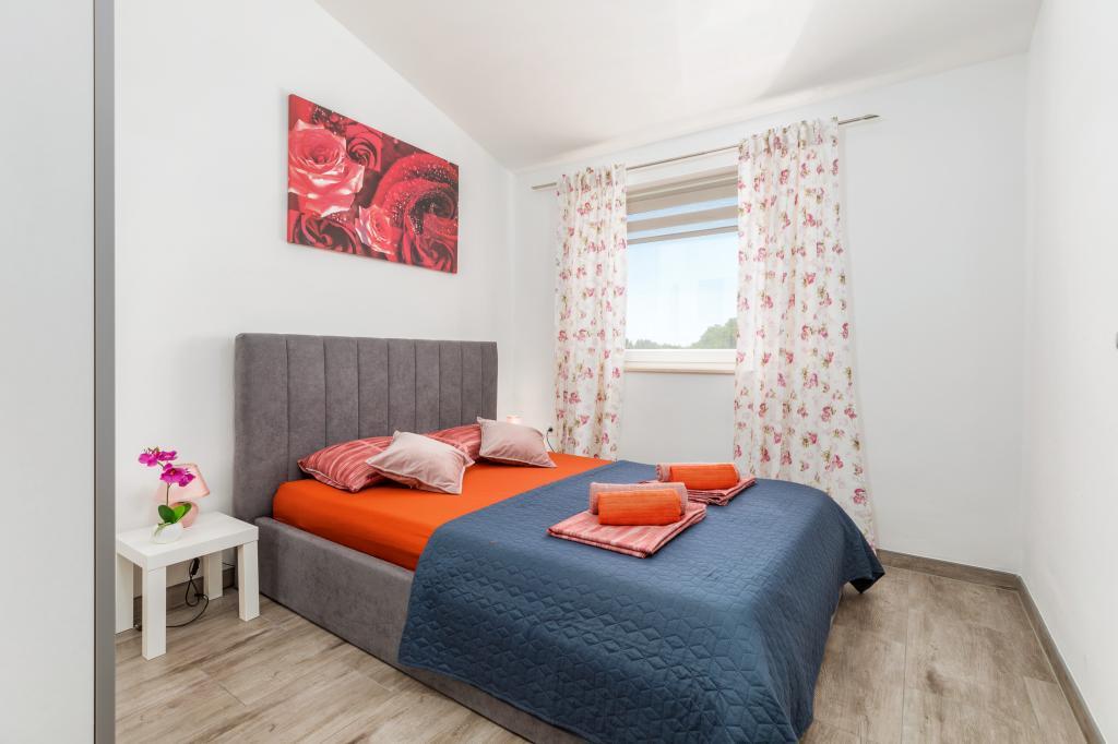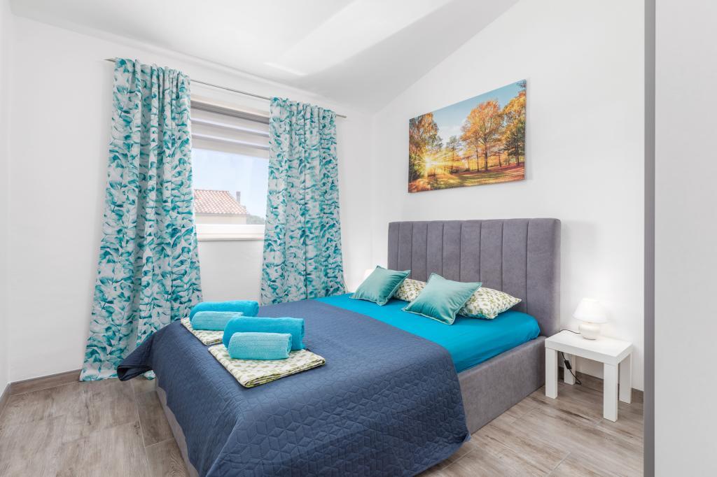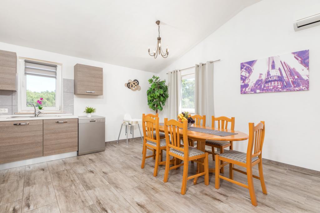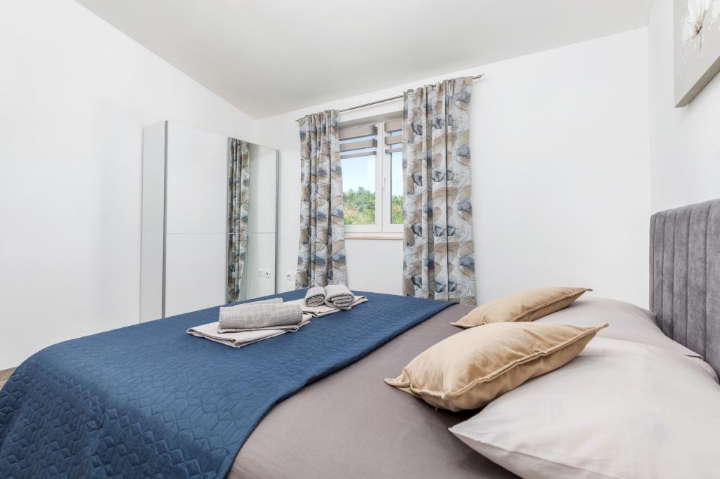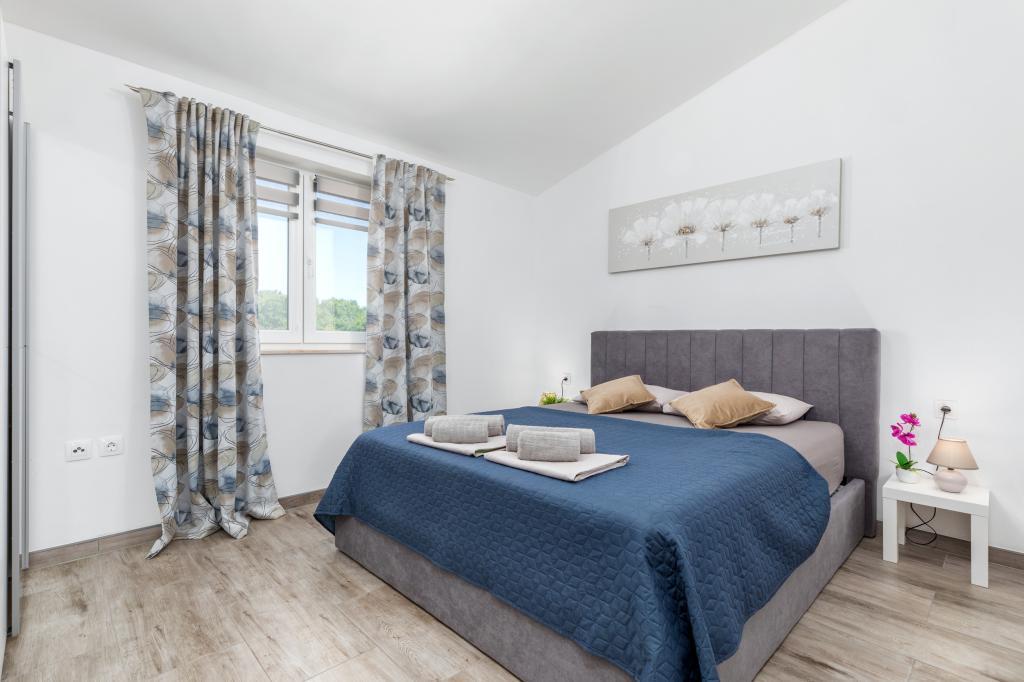 Odpočiňte si v nově vybudovaném zařízení jen 8 km od centra Puly a 10 km od první pláže. Klidné prostředí na kraji lesa, probouzející se za cvrlikání ptáků. Byt v prvním patře má 3 ložnice, koupelnu vybavenou pračkou a sprchovým koutem, kuchyň s pračkou, jídelnu a obývací pokoj. Krytá terasa s jídelním stolem a obývacím nábytkem a v přízemí gril s inventářem a velkou zahradou. Wi-Fi, dětská postýlka, krmítko, parkování zdarma. V blízkosti hřiště a supermarket.