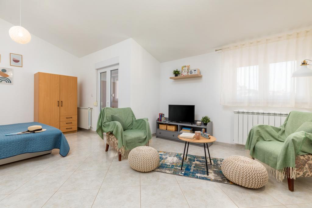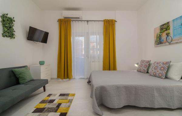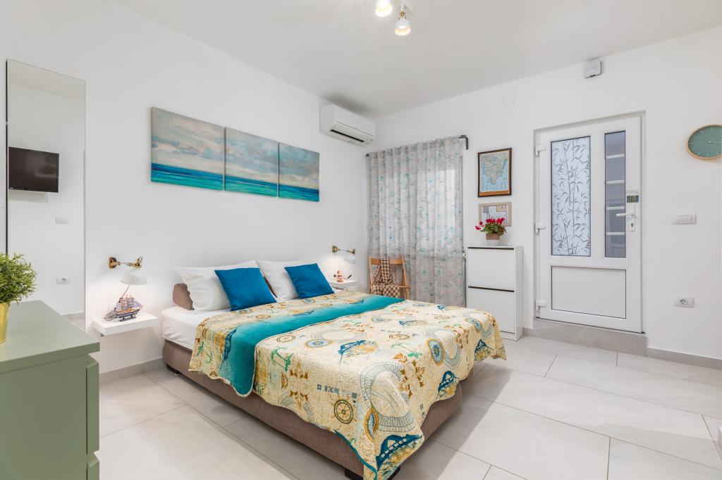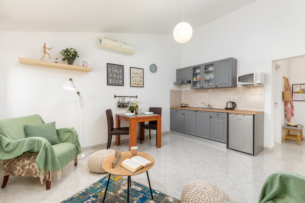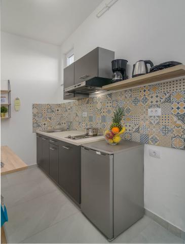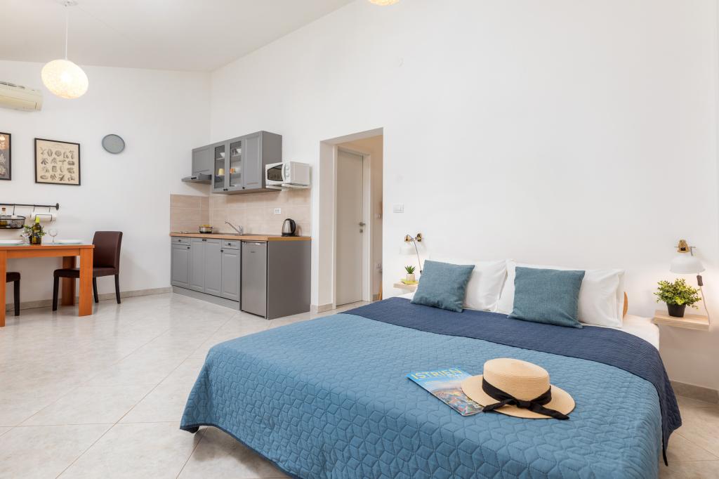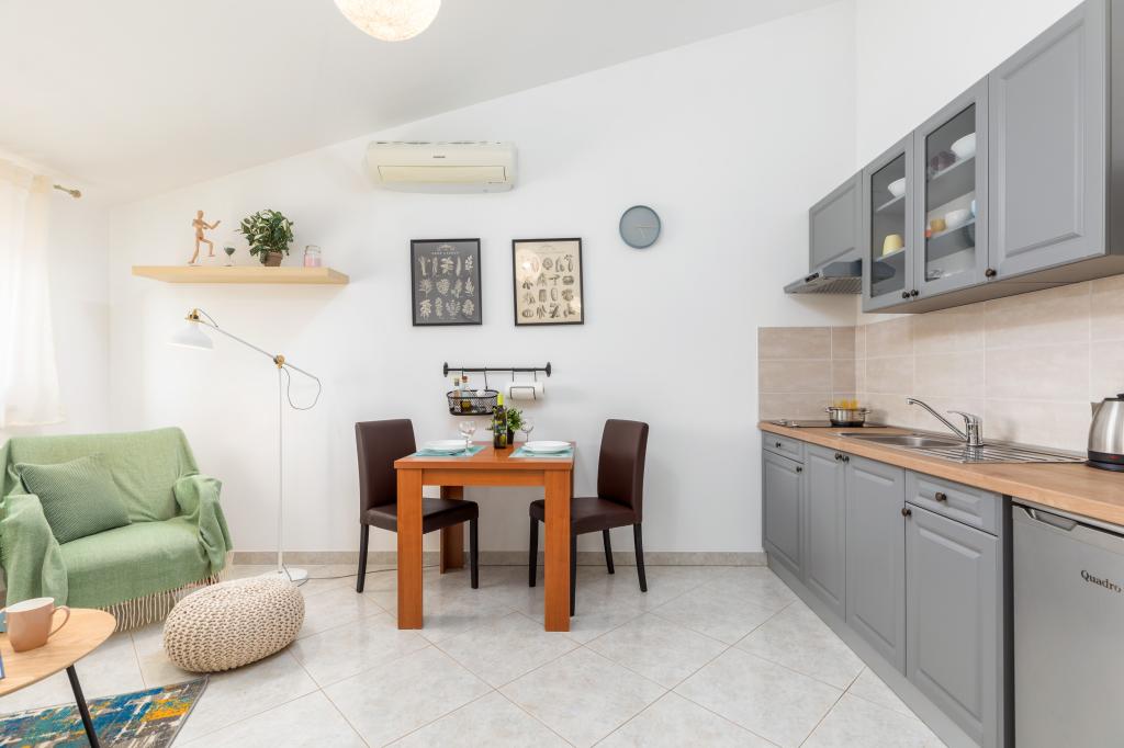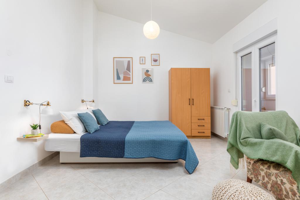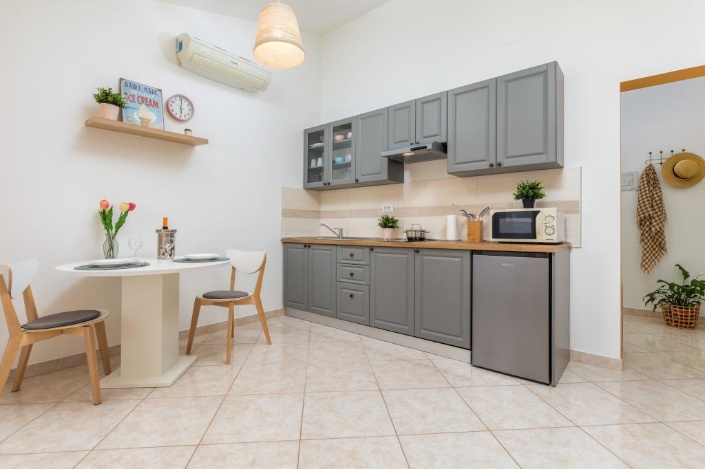 Garsonka se nachází v novostavbě rodinného domu v klidné části města, jsou plně vybavené a mají terasu. Vzdálenost od centra města je asi 15 minut pěšky a na pláž asi 10 minut autem. V bezprostřední blízkosti se nachází nákupní centrum, supermarket, nemocnice, restaurace, kavárny, čerpací stanice, posilovna a dětský park. V přízemí je možnost uložení kočárků a kol.