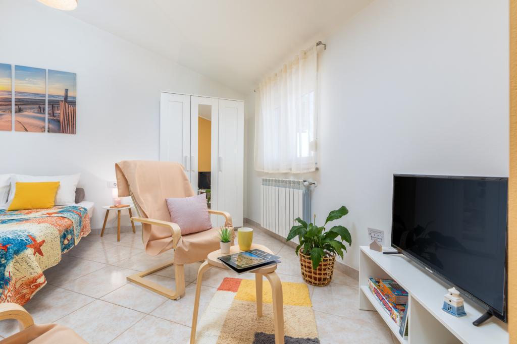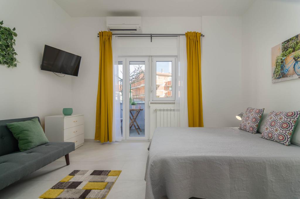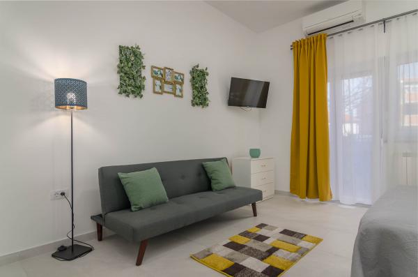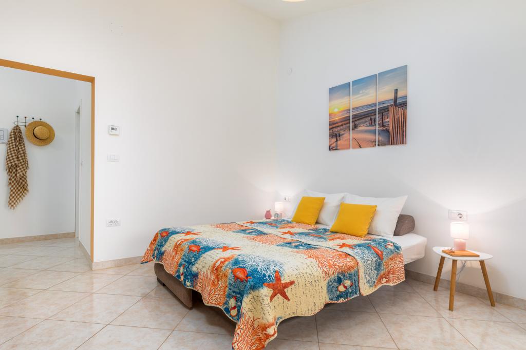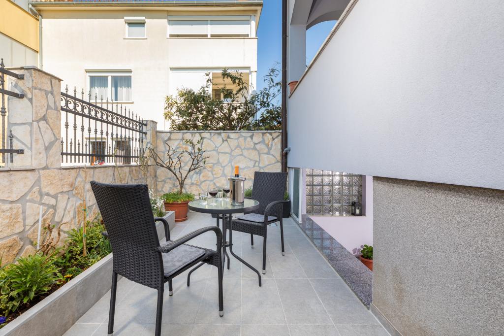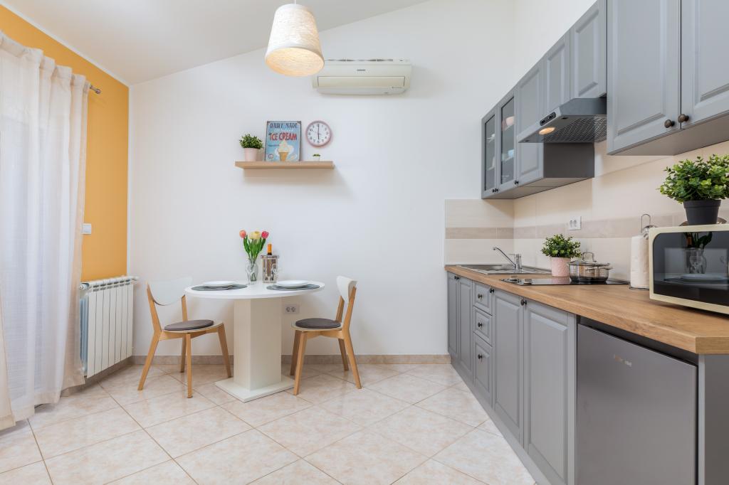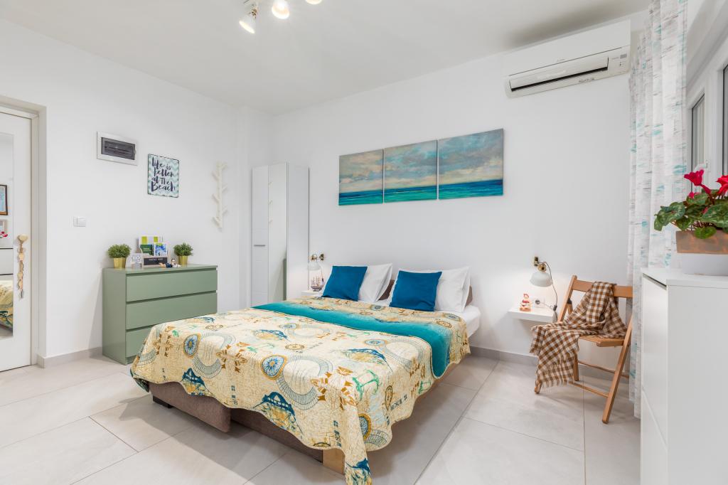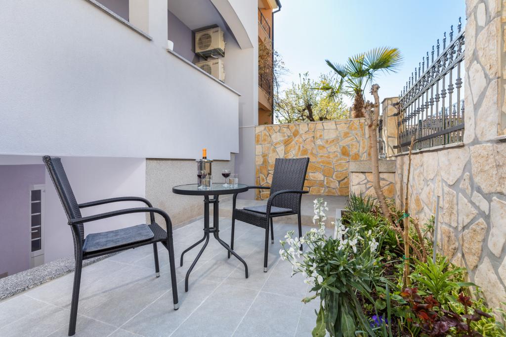 Garsonka se nachází v novostavbě rodinného domu v klidné části města, jsou plně vybavené a mají terasu. Vzdálenost od centra města je asi 15 minut pěšky a na pláž asi 10 minut autem. V bezprostřední blízkosti se nachází nákupní centrum, supermarket, nemocnice, restaurace, kavárny, čerpací stanice, posilovna a dětský park. V přízemí je možnost uložení kočárků a kol.