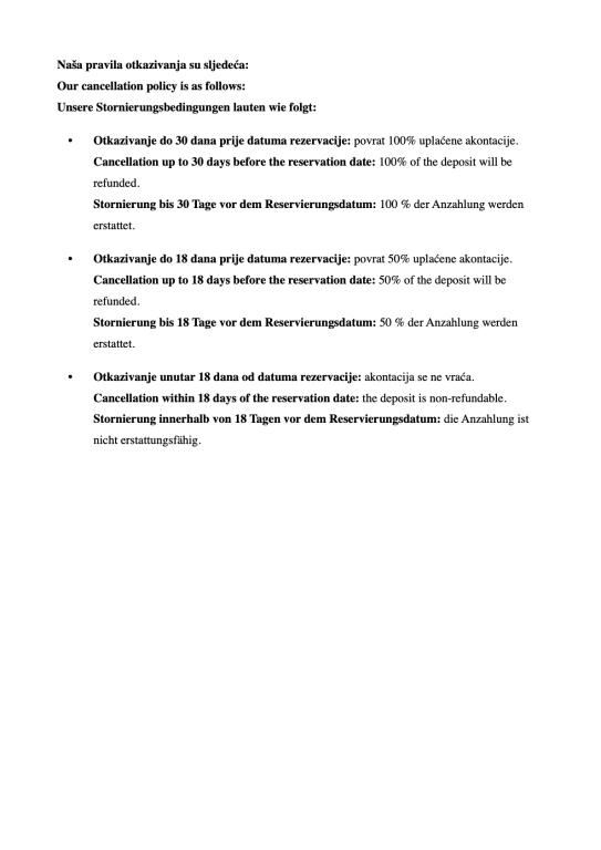Pobytová taxa je v ceně. Doklad o potvrzení rezervace při rezervaciStorno 30 dní před dnem rezervace - vrací se 100% zálohy. Storno 18 dní před rezervací - 50% zálohy se vrací. Poté se již záloha nevrací.
