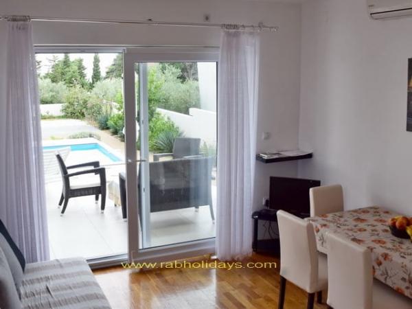 Dům \\ Villa Marija \\ s výběrem prostorných apartmánů se nachází na ostrově Rab v Banjolu. Apartmány vily Marija se nacházejí v klidném a krásném místě, od pláže asi 500 metrů. Čeká na vás pohodlné ubytování v moderně zařízených apartmánech (klimatizace, satelitní TV, gril, terasa s lehátky, výhled na moře, parkoviště). V bytě je také bazén. Úprimně doufáme, že poznáte krásu ostrova Rab a strávíte svou krásnou a příjemnou dovolenou v Banjolu a budeme mít tu čest být vaším hostitelem.