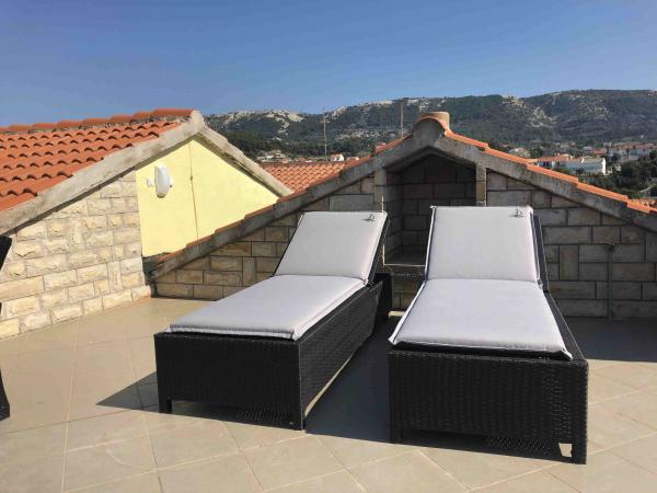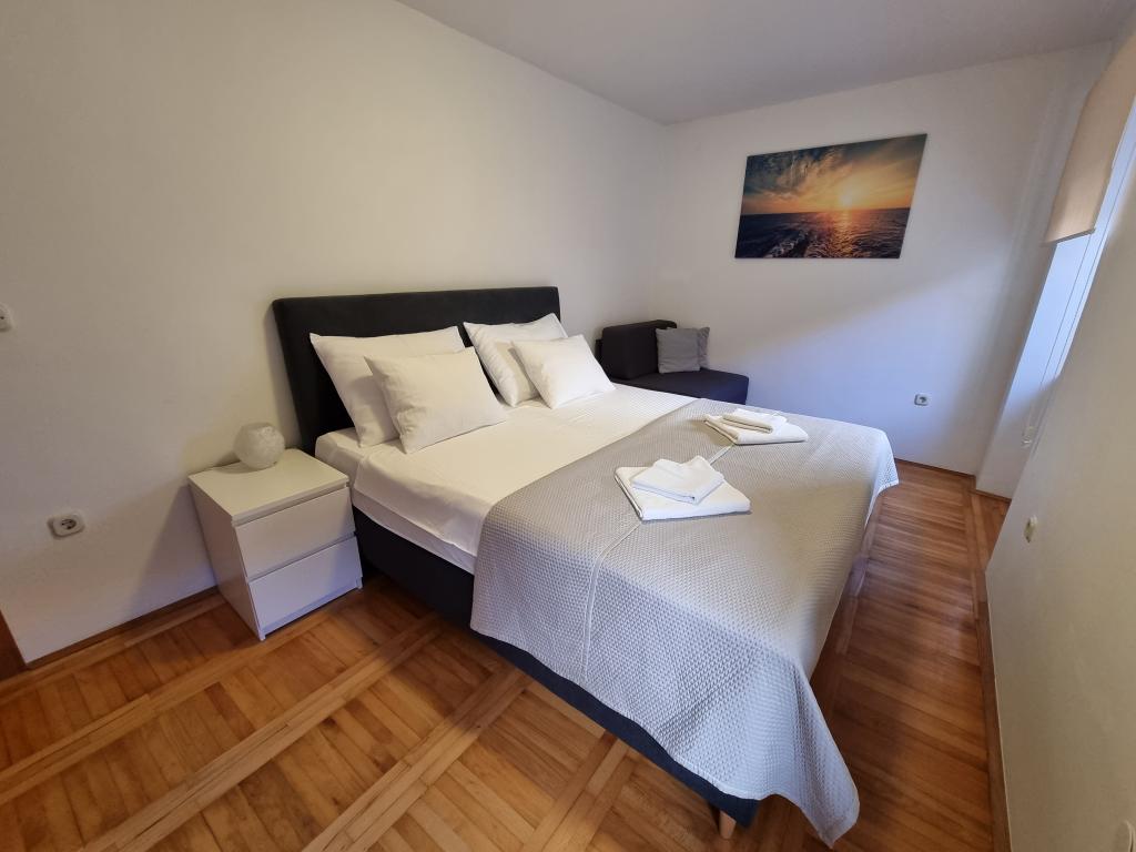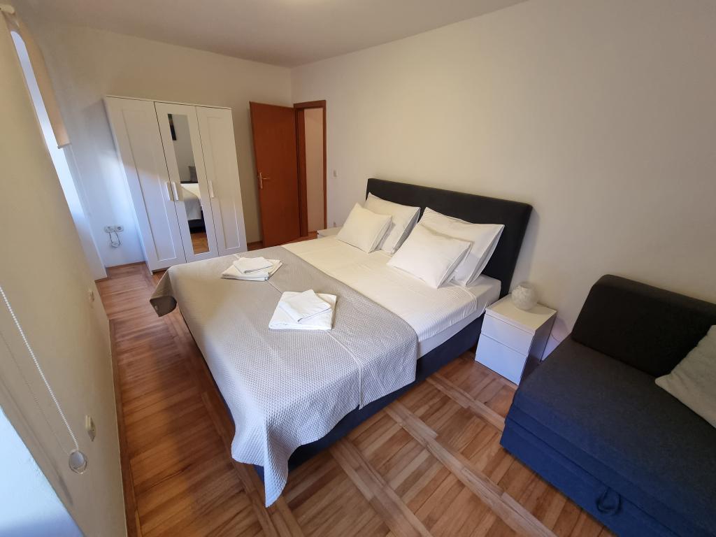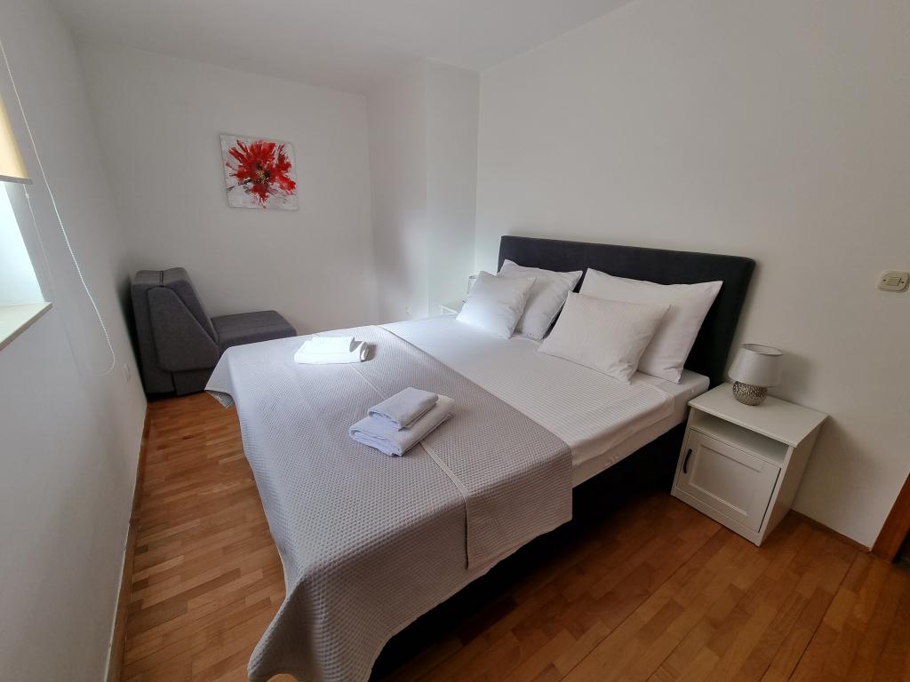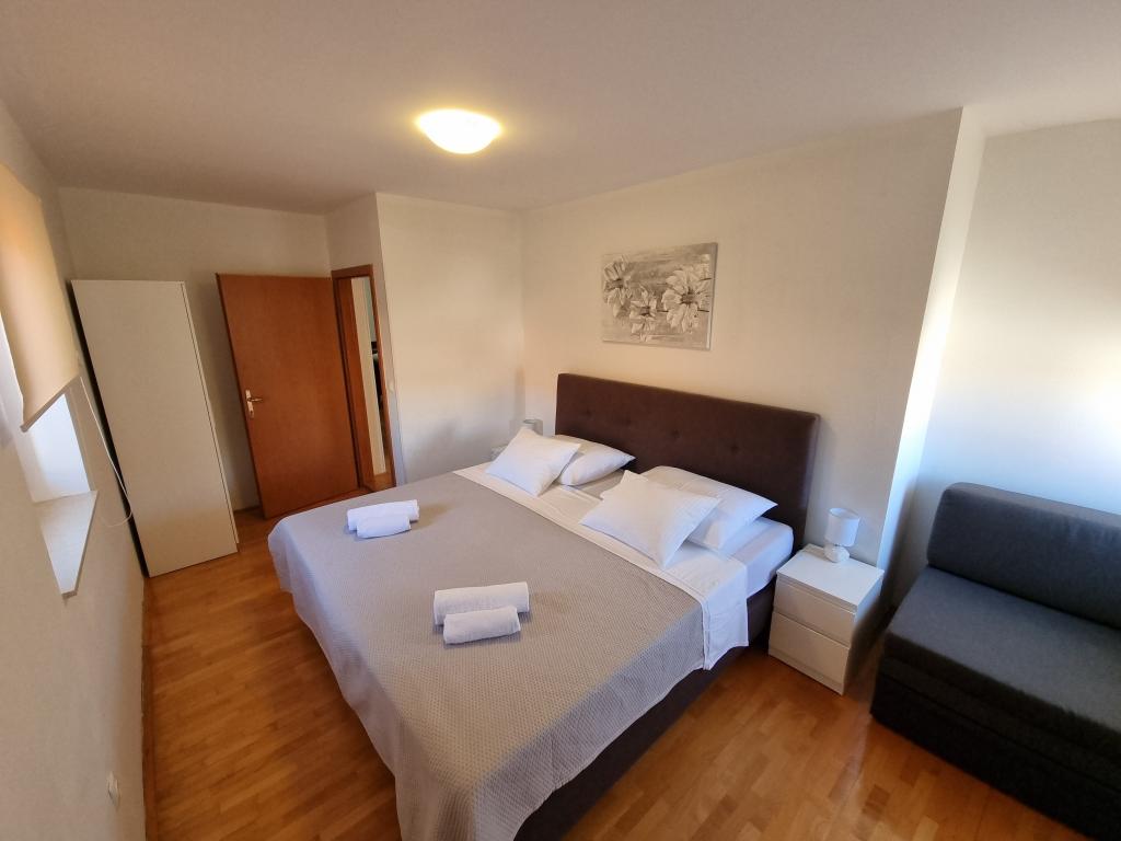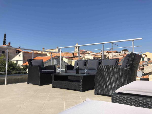 Zažijte nezapomenutelnou letní dovolenou v srdci města Rab na ostrově Rab v našich pohodlných apartmánech umístěných v klidném prostředí starých městských hradeb. Nemine vás vzrušení, když budete obdivovat nádherný panoramatický výhled ze střešní terasy většího bytu, kde si užijete neuvěřitelné výhledy na čtyři slavné zvonice města. Nenechte si ujít příležitost užít si blízkost městské pláže, jen 2 minuty chůze od apartmánu, nebo prozkoumat ulice a obchody na hlavní ulici, pouhých 30 metrů od domu. A pokud chcete ochutnat místní jídlo, restaurace je jen 10 metrů od apartmánu! Díky bezplatnému parkování pro všechny hosty na městském parkovišti, které se nachází u nábřeží jen pár minut chůze od apartmánu, se nebudete muset o nic starat. Rezervujte nyní a zažijte nezapomenutelnou letní dovolenou v srdci města Rab na ostrově Rab!
