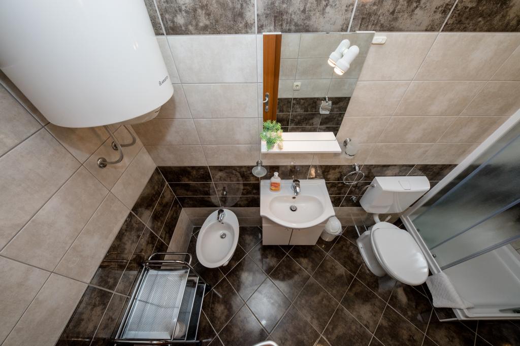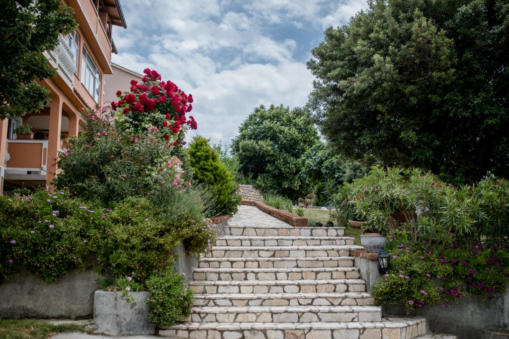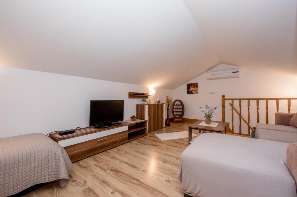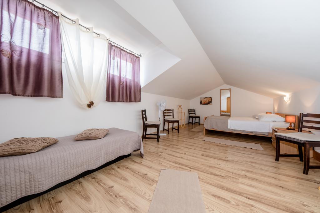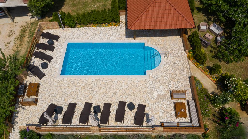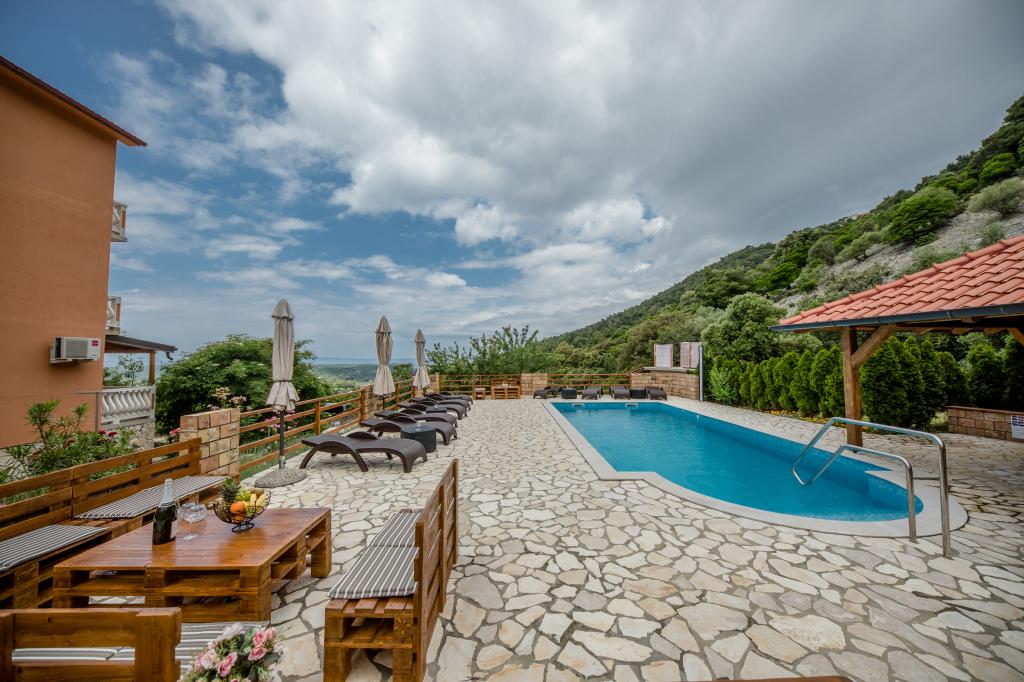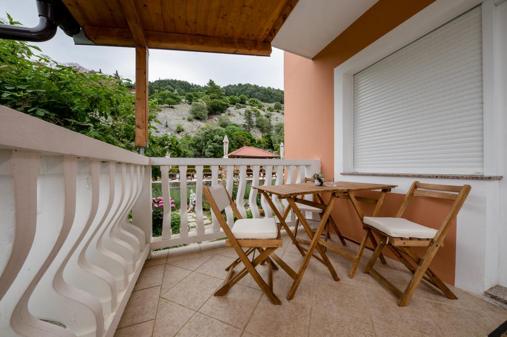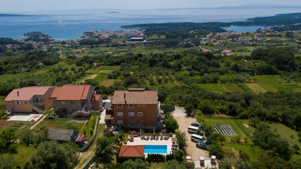 Moderně vybavené apartmány v nadmořské výšce 350 metrů v klidné vesnici v Mundanije na ostrově Rab zvaném Šćerbi. Objekt je vzdálen přibližně 2-3 km od moře, centra a všech ostatních důležitých míst, což je přibližně 10 minut jízdy autem. Poloha budovy nabízí krásný výhled ze všech teras a balkonů na celý ostrov a větší část Kvarnerského zálivu. Klid a nulový provoz našeho města nabízí dokonalou a pohodovou dovolenou v úkrytu přírody a nádherného letního slunečného počasí. U domu je velké parkoviště a za domem je krásně udělaný bazén a vedle něj plocha na opalování.