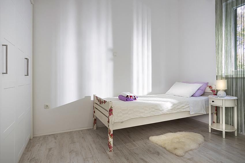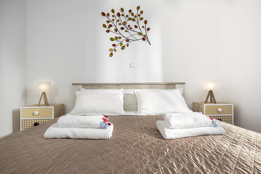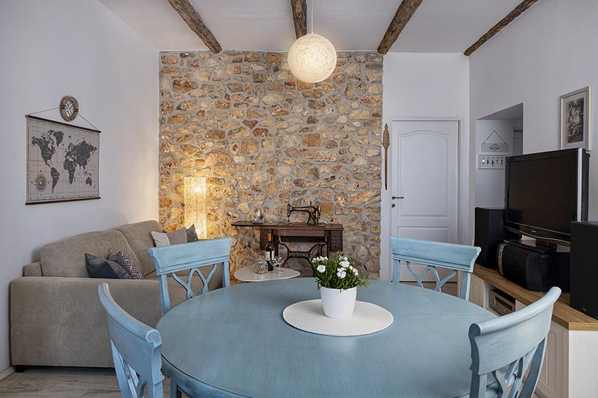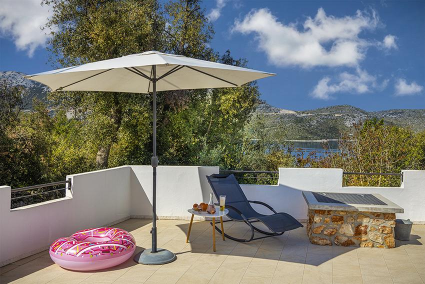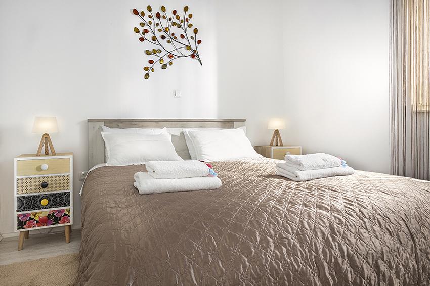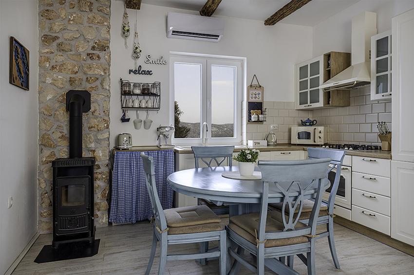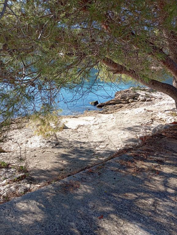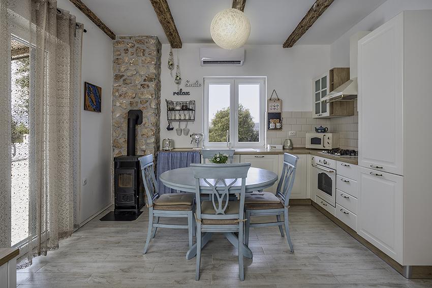 Byt se nachází na samotě ve starší části obce na vrcholu kopce (75 m až 82 m n. m.), takže si užijete klid a pohodu. Od nejbližší pláže je vzdálen 100 m. Dá se k ní dojít pěšky po staré cestě nebo pěšky nebo autem po nové silnici. Kuchyně je moderně vybavená a můžete využít lednici s mrazákem, troubu, myčku, espresso, toustovač, varnou konvici, mikrovlnku. V budově je klimatizace a podlahové vytápění. Koupelna je vybavena pračkou. Byt má dva pokoje. Jeden má manželskou postel a druhý pokoj má dvě samostatné postele, které lze spojit. Můžete si také užívat venku na prostorné terase.