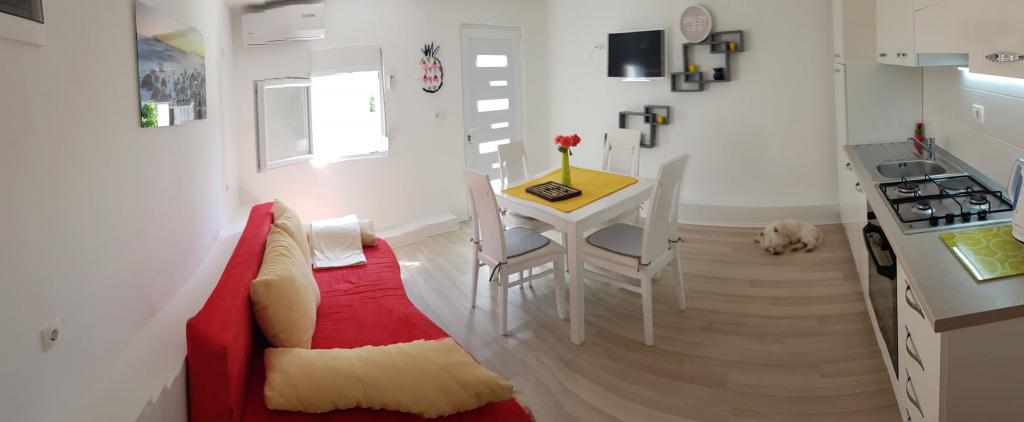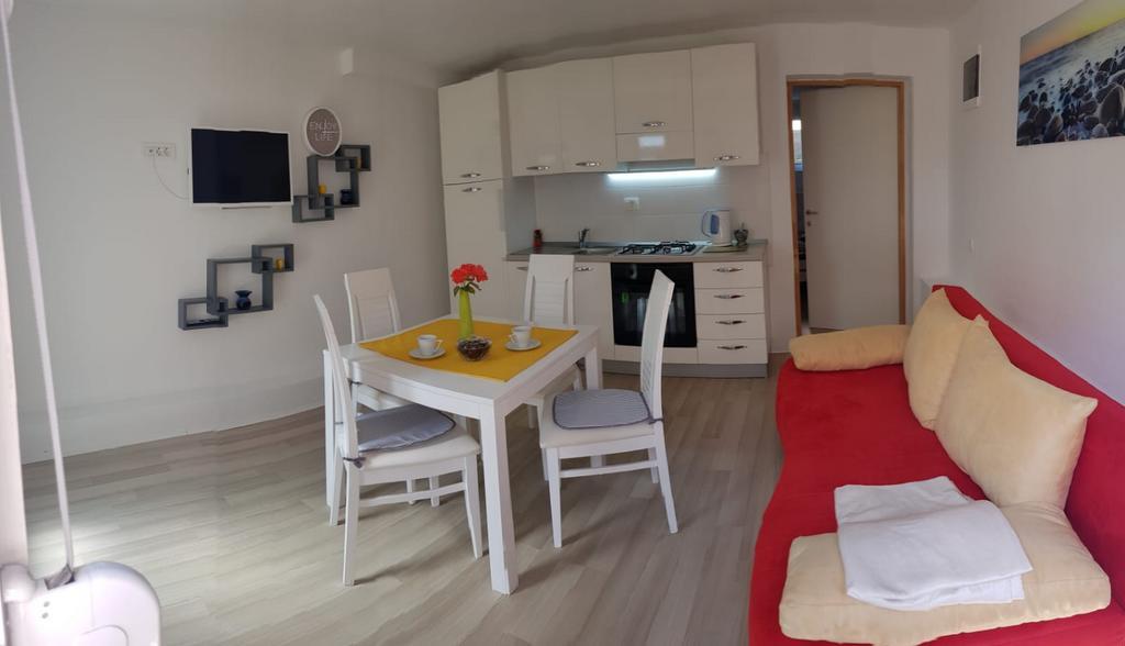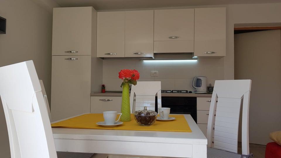 Apartmány velmi čisté, dobře vybavená kuchyň, nic nechybělo. Hostitelé velmi užitečné a pěkné, péče o hosty. Nádherné místo pro rodinnou dovolenou. Oblázková pláž, je zde skákací plocha, málo lidí. Doporučujeme s čistým svědomím. Děkuji mnohokrát!!!