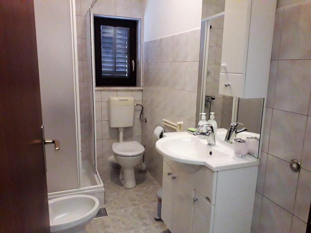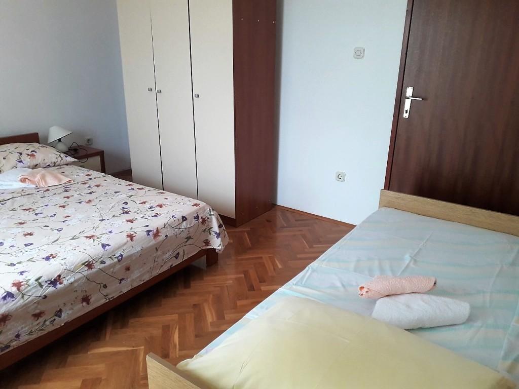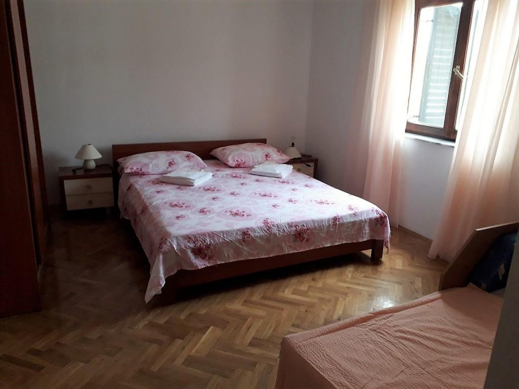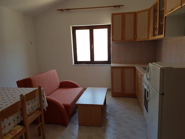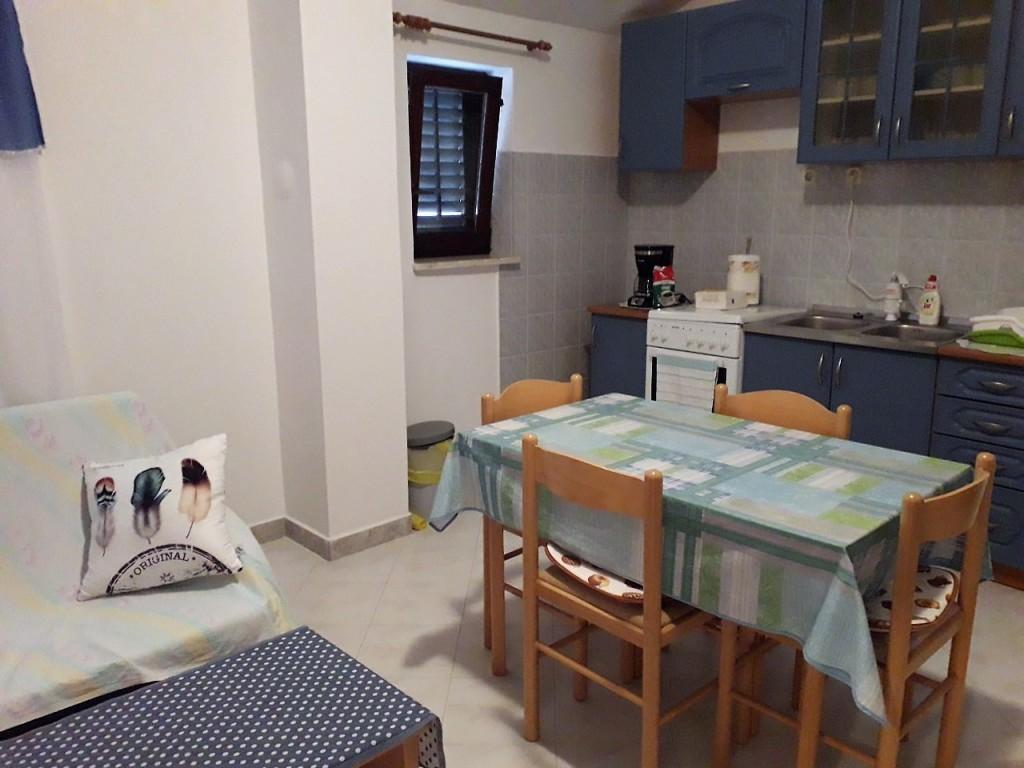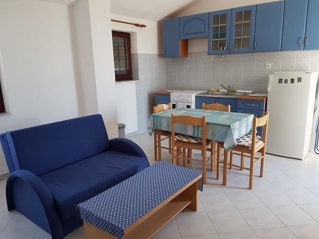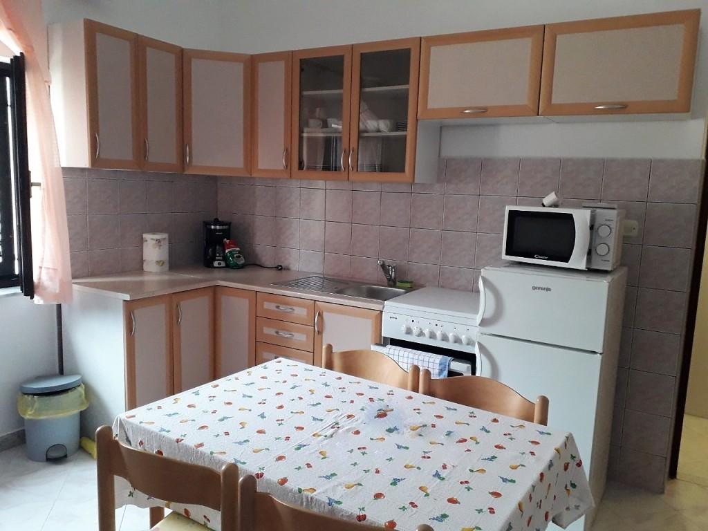 Byt se nachází v domě v prvním patře. Apartmán má samostatnou ložnici s manželskou postelí a samostatným lůžkem. Z tohoto pokoje je východ na balkon s výhledem na moře a krásnou krajinu. V obývacím pokoji je sedací souprava, která zároveň slouží jako přistýlka. Kuchyň je propojená s obývacím pokojem a je vybavena kuchyňským nádobím a nádobím, příbory, lednicí, mikrovlnnou troubou a varnou konvicí. Součástí kuchyně je také balkon. Koupelna je standardně vybavena sprchovým koutem a elektrickým bojlerem. V kuchyni je klimatizace. K dispozici je venkovní gril. Na pláž se dostanete autem za 2 minuty nebo pěšky v přírodě za pouhých 10 minut. Vzdálenost do pekárny a nejbližší restaurace je cca 800m, do obchodu (minimarketu) a další restaurace cca 1500m.