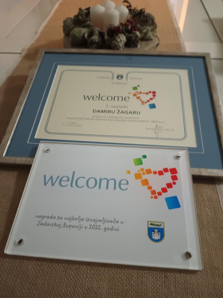 Vážení hosté, těším se na váš příjezd Obdrželi jsme nálepku Vítejte pro nejlepší nájemníky v Zadarské župě. V kategorii byt jsme získali třetí místo.