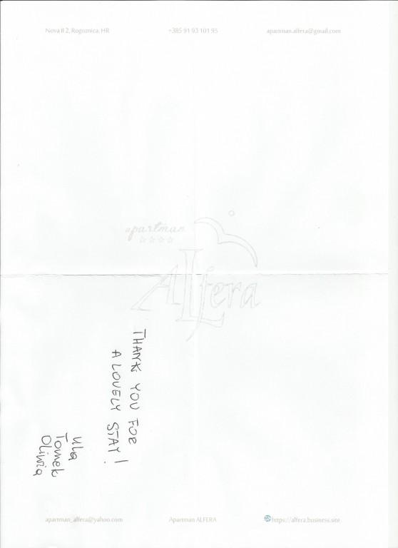 Nově zrekonstruovaný apartmán Alfera se nachází na výjimečném místě, pouhých 30 kroků od moře. Je plně vybavený, pěkně zařízený, plný světla, klasifikace 4 hvězdičky, s jedním parkovacím místem a nabízí ubytování pro tři osoby (možná pro čtvrtou). Apartmán Alfera s přímým výhledem na moře se také pyšní svým prostředím, které je úhledně kultivováno v duchu středomořské krajiny pro úplnou relaxaci a požitek a je ideálním místem pro dovolenou s rodinou a přáteli. Vítejte!
