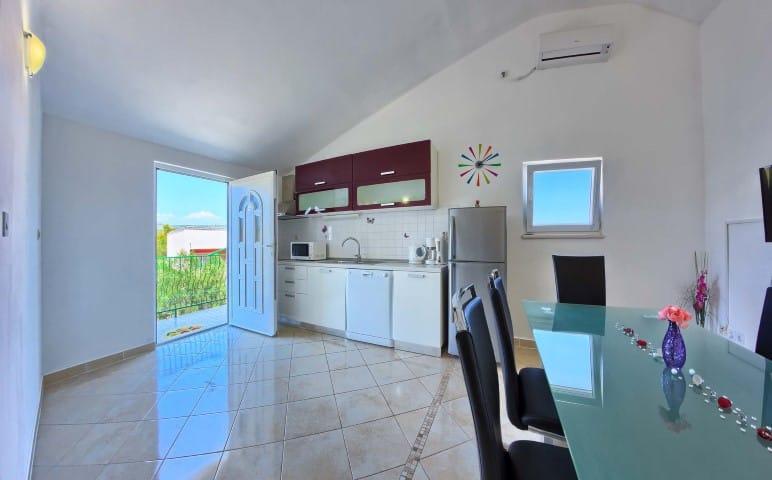 V Rogoznici, v krásné zátoce Lozica, ve vzdálenosti 150 m od moře a pláží, Vám nabízíme 6 exkluzivních apartmánů s kapacitou 2 až 8 osob na ploše téměř 5000 m2. Apartmány se nacházejí v našich dvou vilách, vila MARTINA (bílá budova), 30 m od moře a 50 m od venkovního bazénu, kde jsou 2 komfortní apartmány (A1 (85 m2, přízemí, 2 ložnice) a A2 ( 85 m2, první patro, 2 ložnice) ), a Villa DARIA (žlutá budova), 120 m od moře a 20 m od venkovního bazénu, kde jsou 4 apartmány (A3 (75 m2, přízemí, 2 ložnice), A4 (90 m2, první patro, 3 ložnice), A5 (45 m2, první patro, 2 ložnice) a A6 (100 m2, druhé patro, 4 ložnice)). Apartmány jsou vybaveny klimatizací, Smart TV, WiFi internetem, plně vybavenou kuchyní a vším potřebným pro příjemnou a uvolněnou dovolenou. Spolu s ubytováním nabízíme našim hostům využití venkovního bazénu s prostorem na opalování a dětským hřištěm zcela zdarma. Vítejte v CVITA Holiday Apartments v Rogoznici! :)