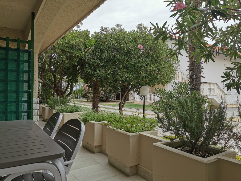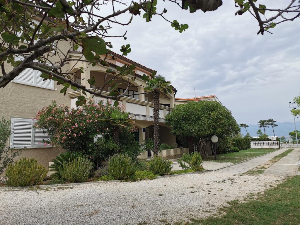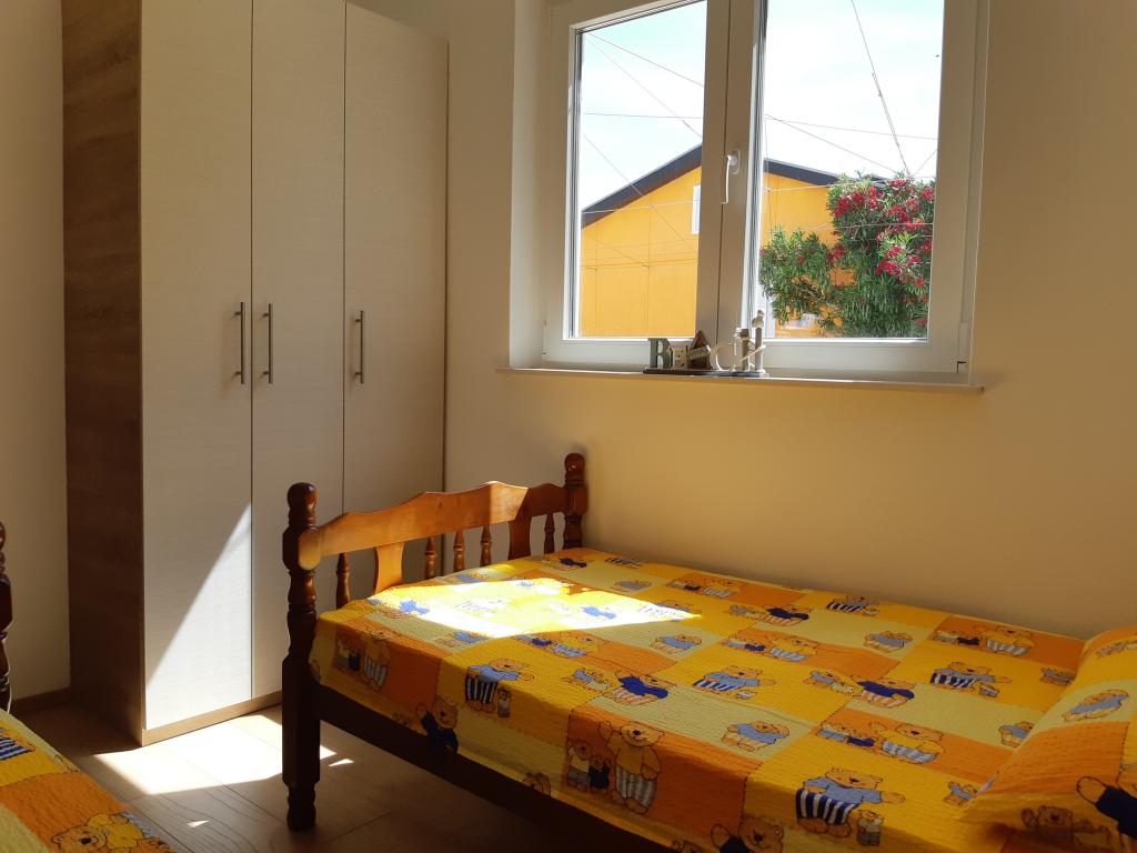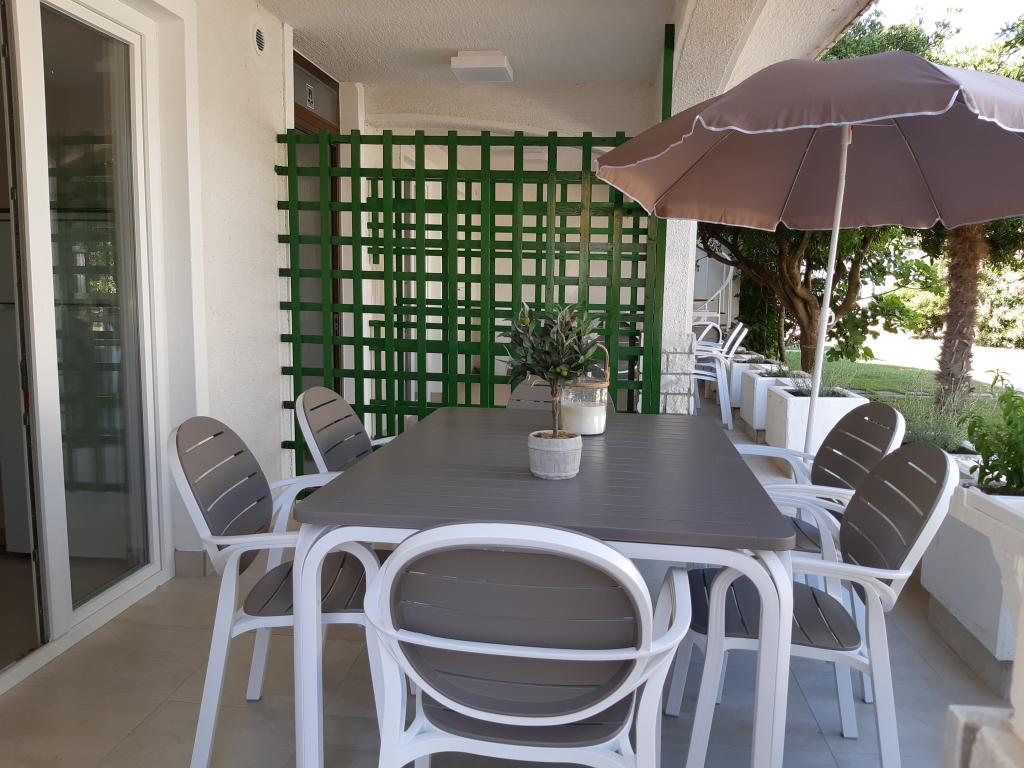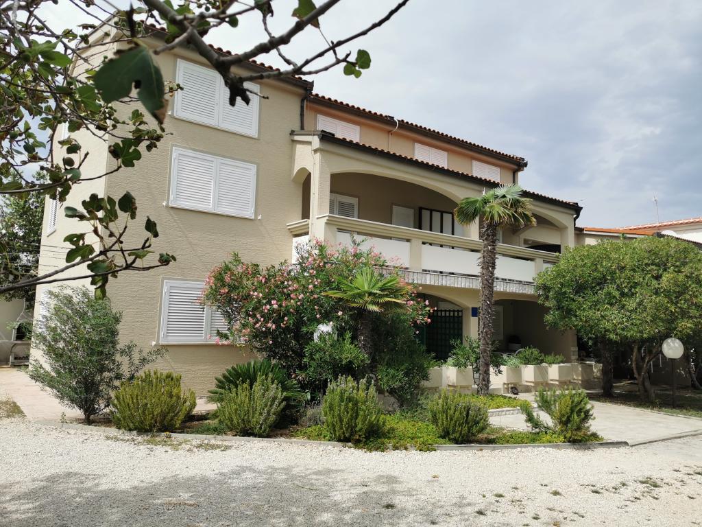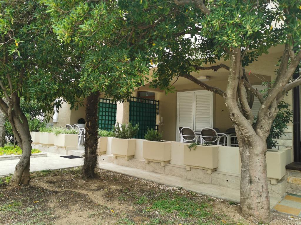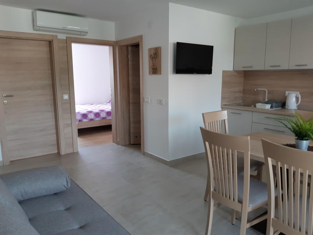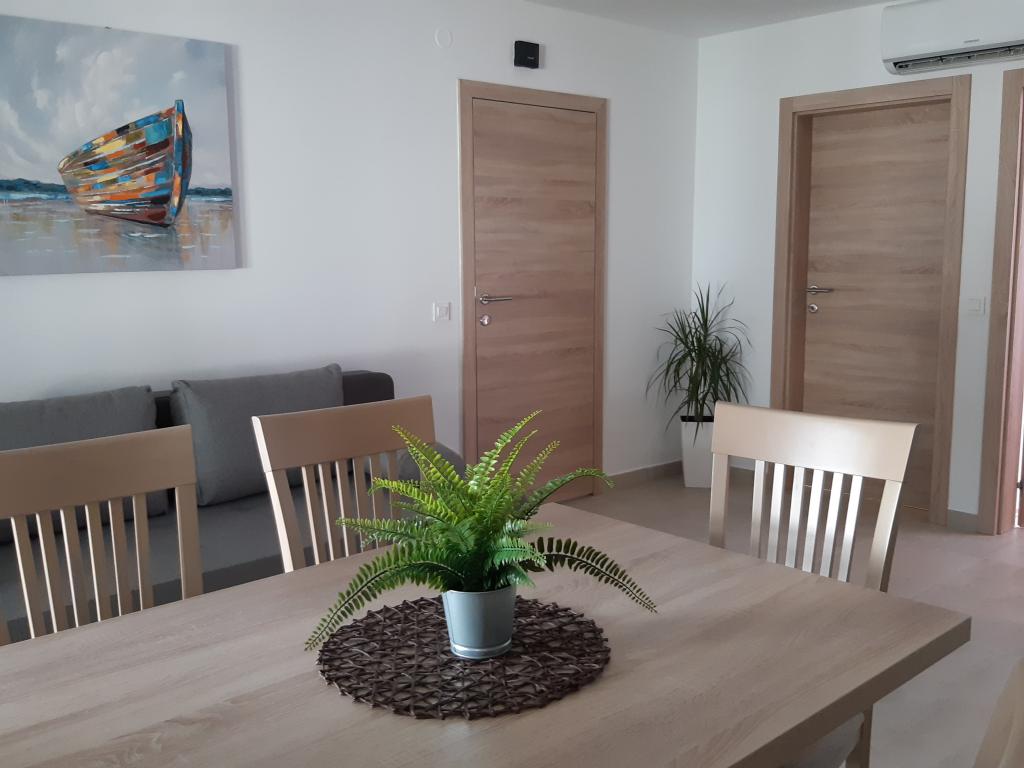 Nově a moderně zařízené apartmány. Poloha v osadě - první řada k moři. Apartmány se dvěma ložnicemi (jedna s manželskou postelí a druhá se dvěma samostatnými), kuchyní s jídelnou, krytou terasou, koupelnou s WC a sprchou. TV, varná konvice, mikrovlnná trouba, varná deska, trouba, lednice s malým mrazákem. Dvoumístné v jídelně (přistýlka pro 2 osoby) nebo v pokoji s manželskou postelí (přistýlka pro 1 osobu). Promenáda do centra obce - obchod, pekárna, prodejna ovoce, kavárna, zmrzlina - 2 min chůze. První restaurace 50 m před objektem je park a borový les se sportovním zázemím a oplocené nové dětské hřiště. Dvě kavárny v parku. Uzavřený dvůr našeho zařízení. Klimatizace, parkoviště kryté ochrannou sítí, Wi-fi, poplatky a taxy, venkovní sprcha a použití grilu v ceně.
