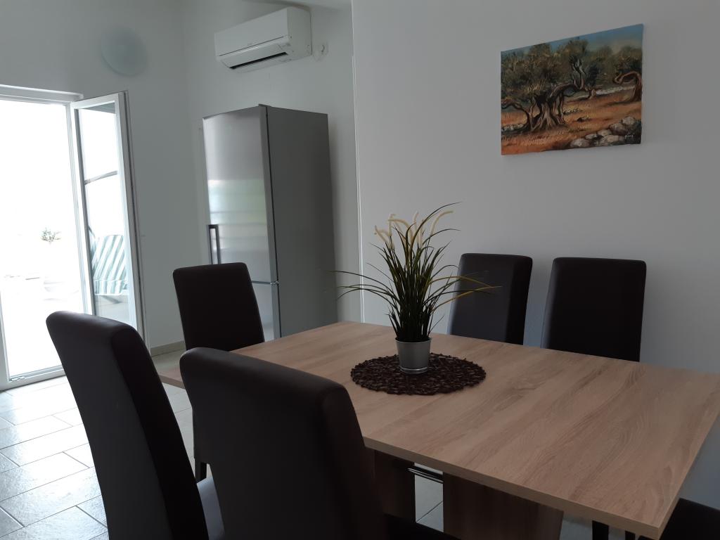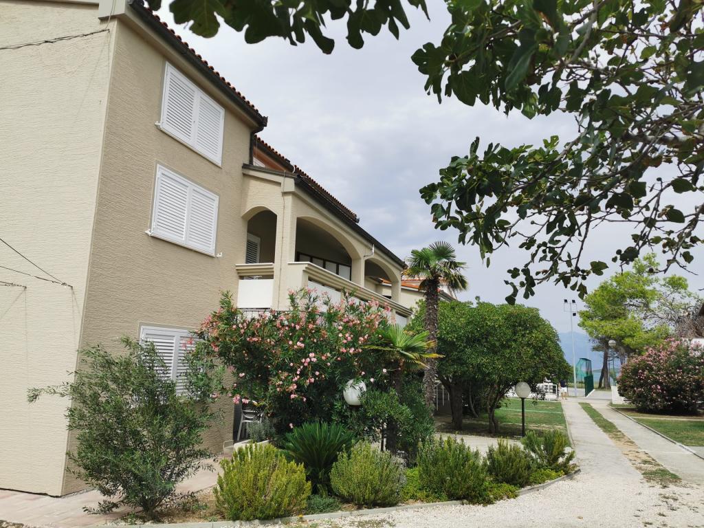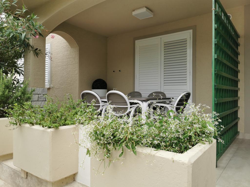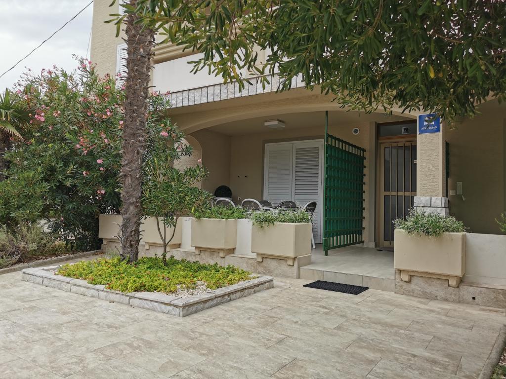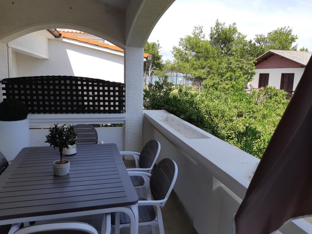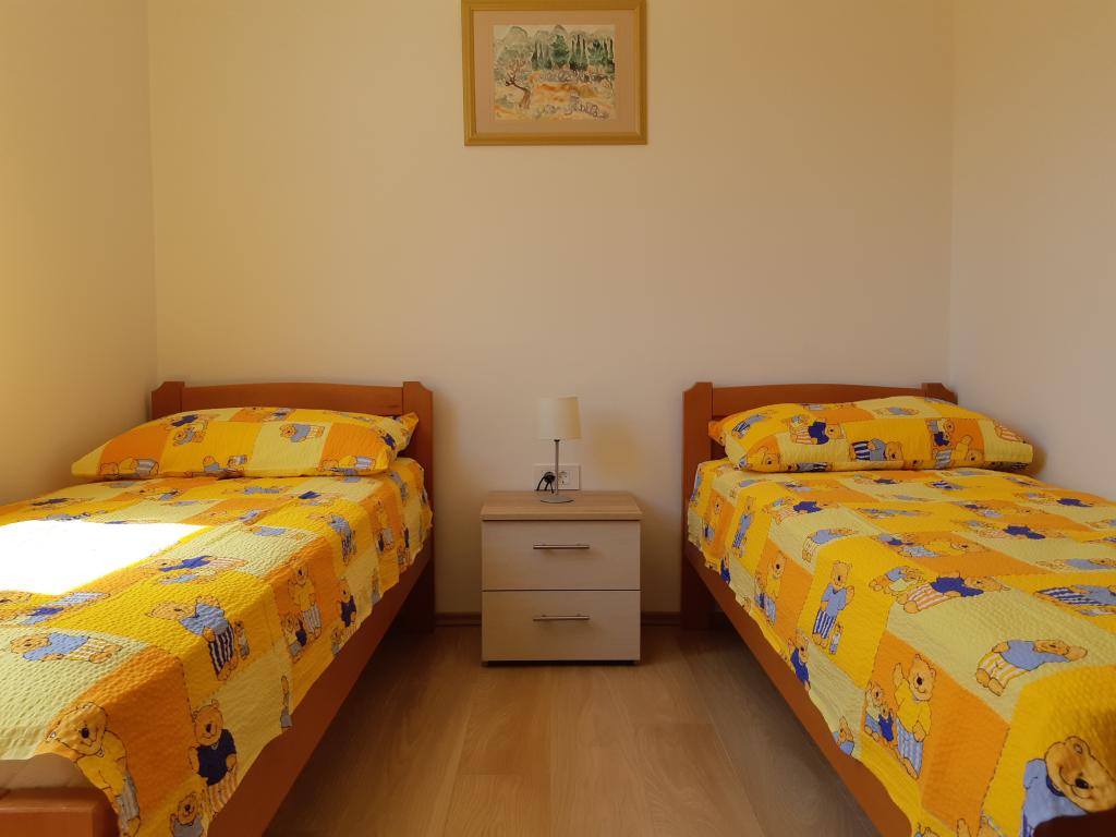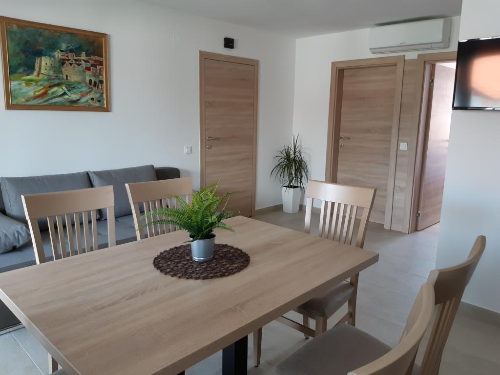 Nově a moderně zařízené apartmány. Poloha v osadě - první řada k moři. Apartmány se dvěma ložnicemi (jedna s manželskou postelí a druhá se dvěma samostatnými), kuchyní s jídelnou, krytou terasou, koupelnou s WC a sprchou. TV, varná konvice, mikrovlnná trouba, varná deska, trouba, lednice s malým mrazákem. Dvoumístné v jídelně (přistýlka pro 2 osoby) nebo v pokoji s manželskou postelí (přistýlka pro 1 osobu). Promenáda do centra obce - obchod, pekárna, prodejna ovoce, kavárna, zmrzlina - 2 min chůze. První restaurace 50 m před objektem je park a borový les se sportovním zázemím a oplocené nové dětské hřiště. Dvě kavárny v parku. Uzavřený dvůr našeho zařízení. Klimatizace, parkoviště kryté ochrannou sítí, Wi-fi, poplatky a taxy, venkovní sprcha a použití grilu v ceně.