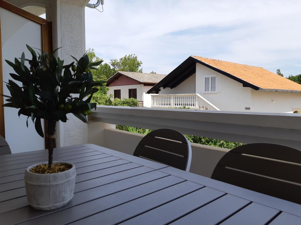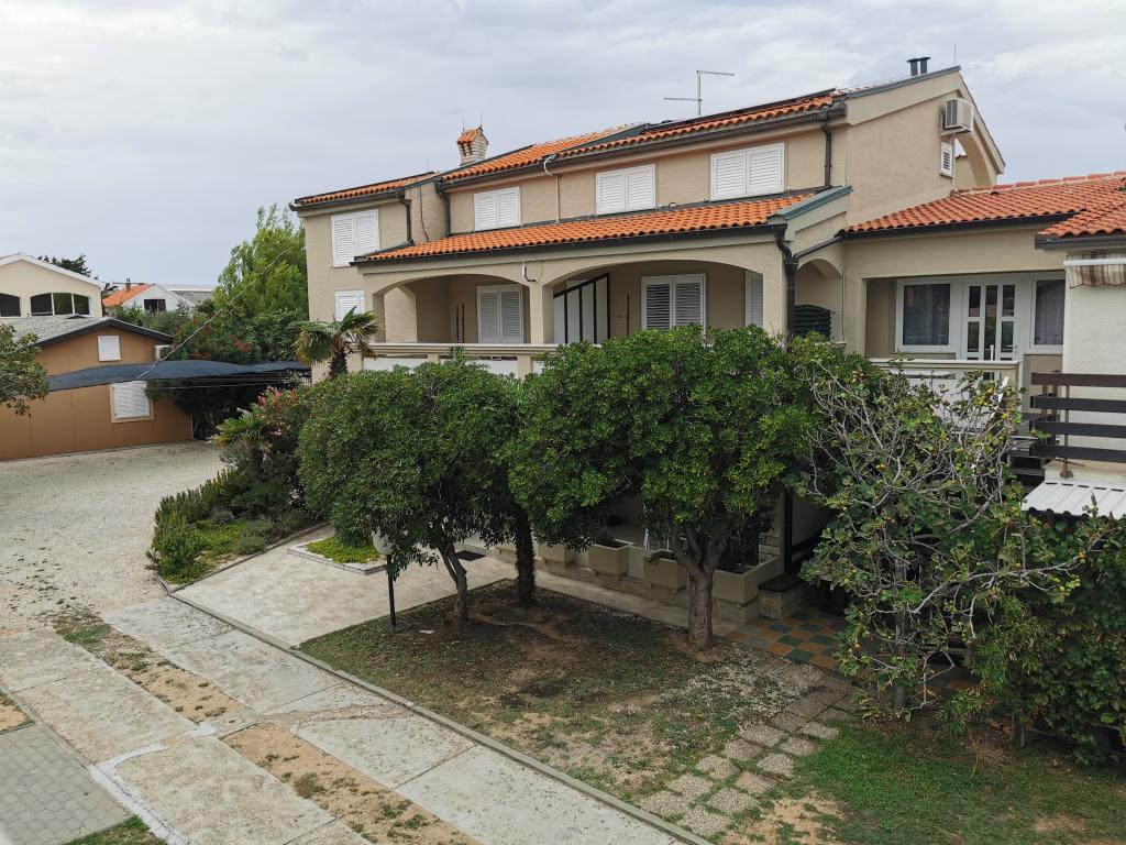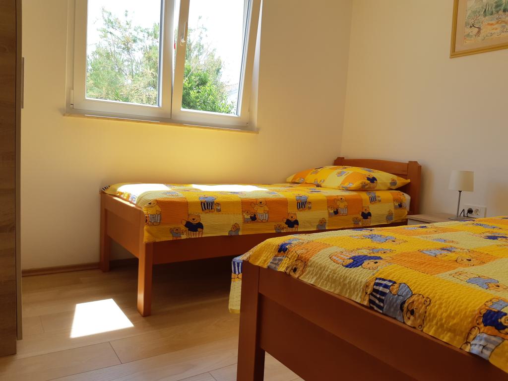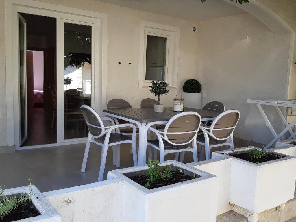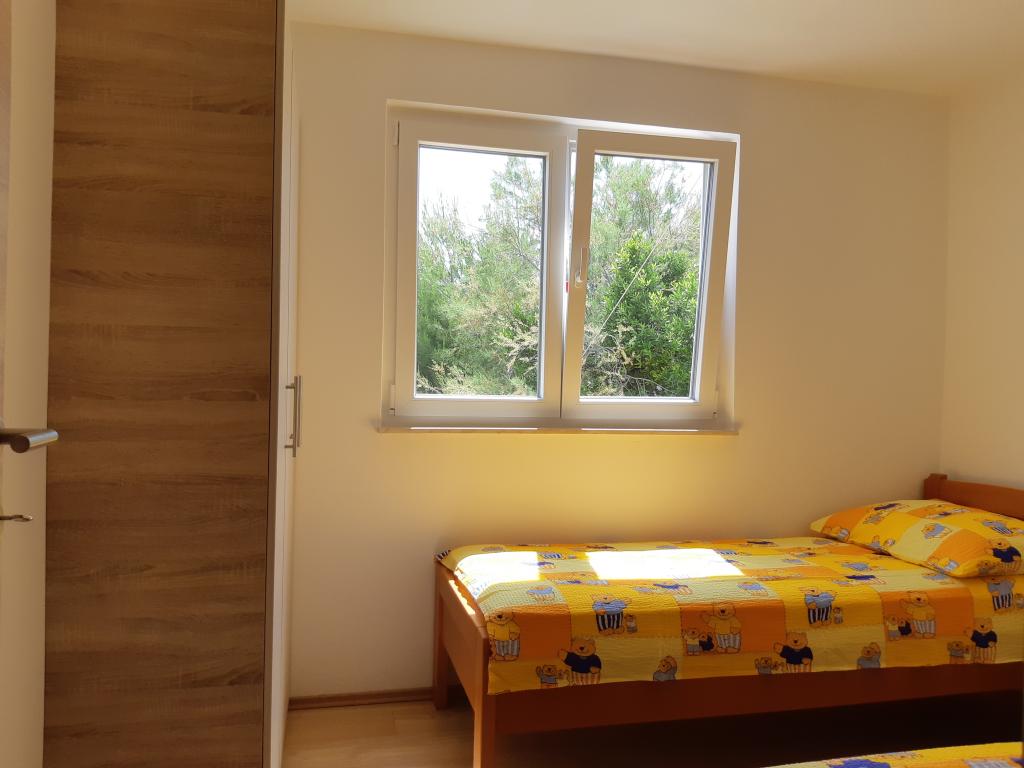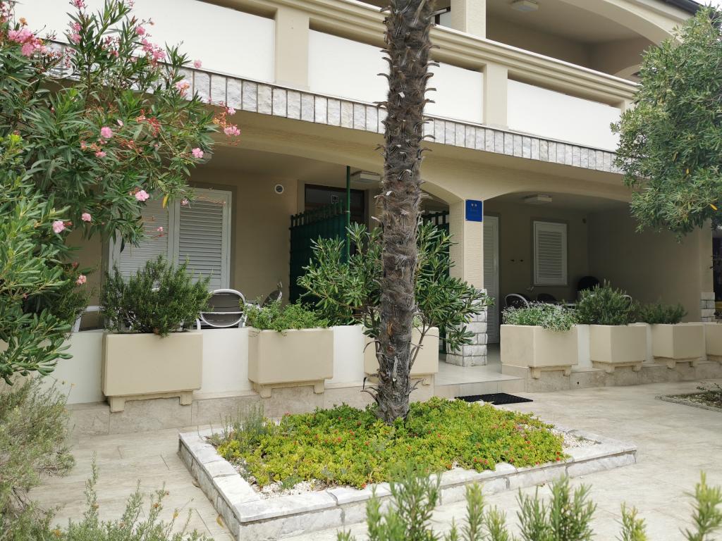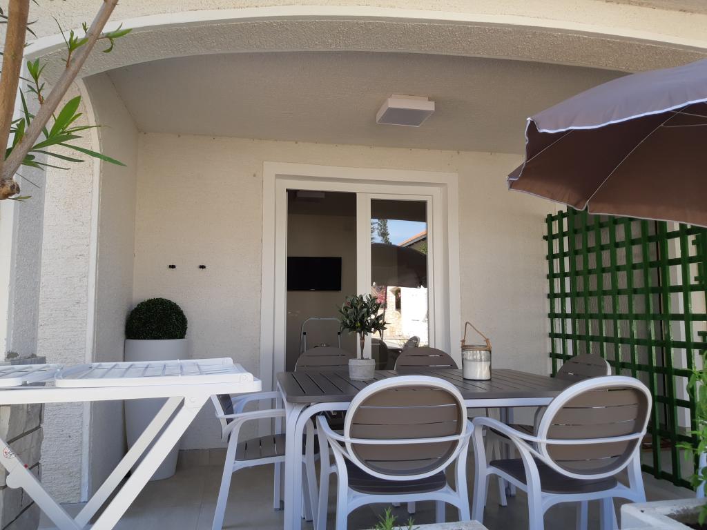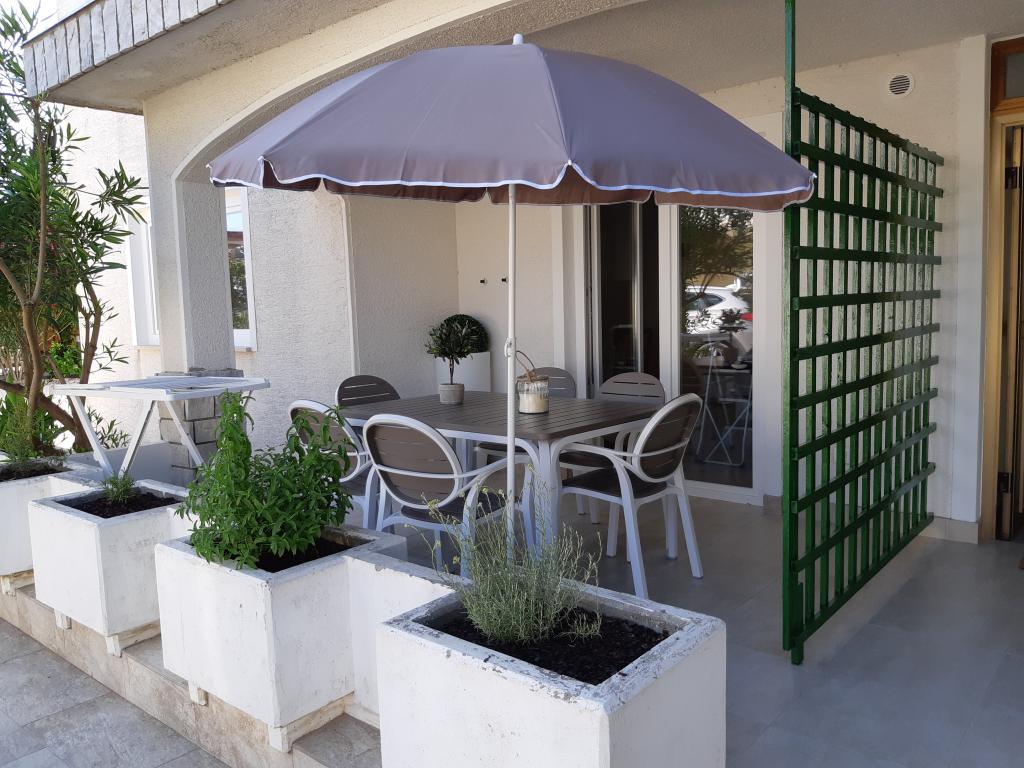 Nově a moderně zařízené apartmány. Poloha v osadě - první řada k moři. Apartmány se dvěma ložnicemi (jedna s manželskou postelí a druhá se dvěma samostatnými), kuchyní s jídelnou, krytou terasou, koupelnou s WC a sprchou. TV, varná konvice, mikrovlnná trouba, varná deska, trouba, lednice s malým mrazákem. Dvoumístné v jídelně (přistýlka pro 2 osoby) nebo v pokoji s manželskou postelí (přistýlka pro 1 osobu). Promenáda do centra obce - obchod, pekárna, prodejna ovoce, kavárna, zmrzlina - 2 min chůze. První restaurace 50 m před objektem je park a borový les se sportovním zázemím a oplocené nové dětské hřiště. Dvě kavárny v parku. Uzavřený dvůr našeho zařízení. Klimatizace, parkoviště kryté ochrannou sítí, Wi-fi, poplatky a taxy, venkovní sprcha a použití grilu v ceně.
