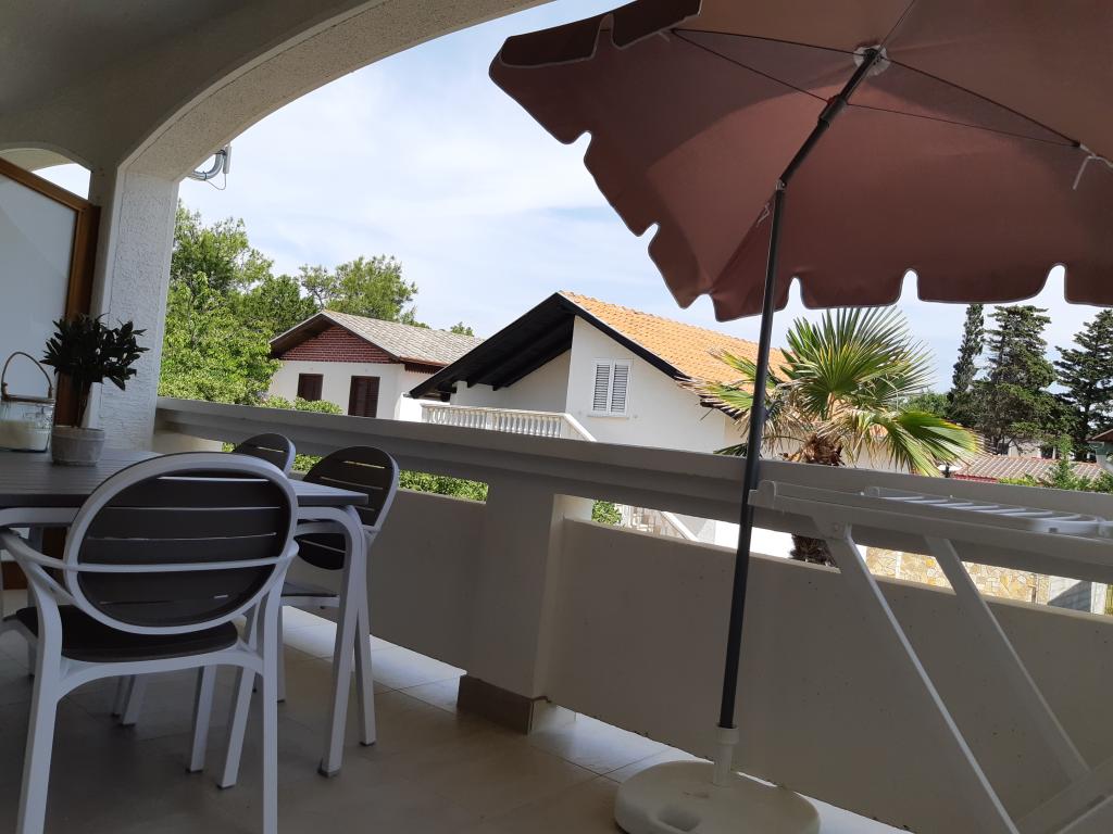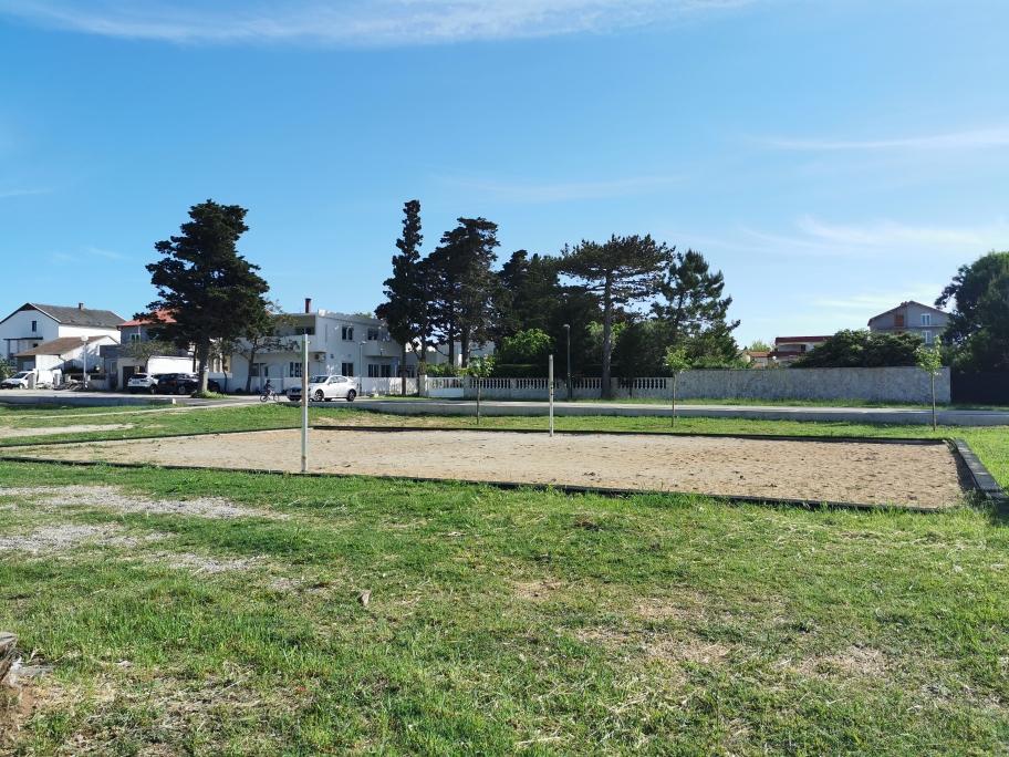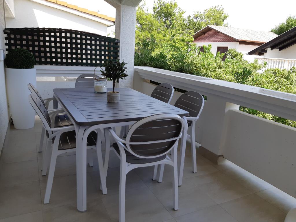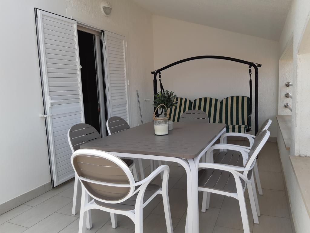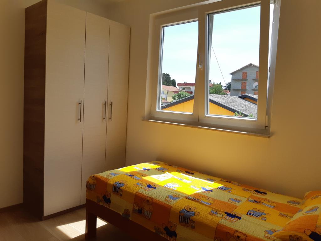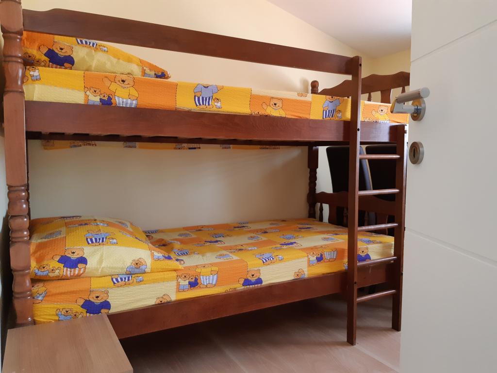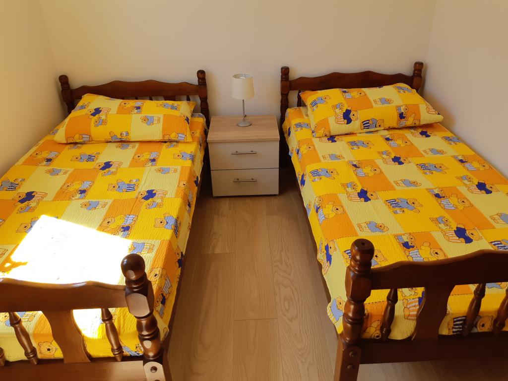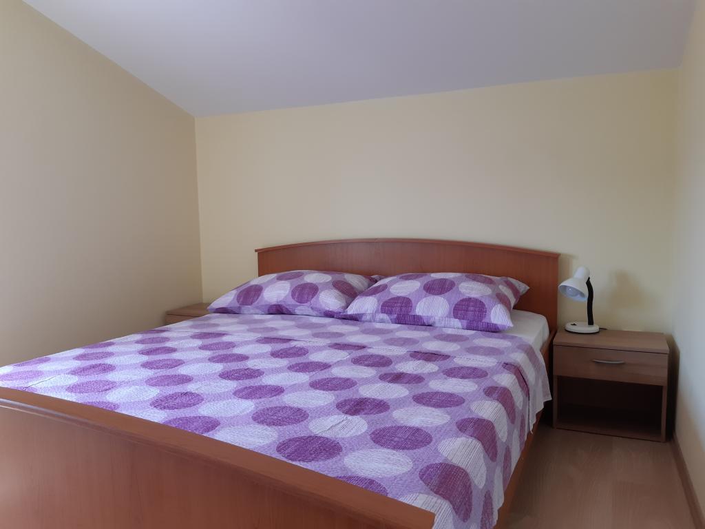 Nově a moderně zařízené apartmány. Poloha v osadě - první řada k moři. Apartmány se dvěma ložnicemi (jedna s manželskou postelí a druhá se dvěma samostatnými), kuchyní s jídelnou, krytou terasou, koupelnou s WC a sprchou. TV, varná konvice, mikrovlnná trouba, varná deska, trouba, lednice s malým mrazákem. Dvoumístné v jídelně (přistýlka pro 2 osoby) nebo v pokoji s manželskou postelí (přistýlka pro 1 osobu). Promenáda do centra obce - obchod, pekárna, prodejna ovoce, kavárna, zmrzlina - 2 min chůze. První restaurace 50 m před objektem je park a borový les se sportovním zázemím a oplocené nové dětské hřiště. Dvě kavárny v parku. Uzavřený dvůr našeho zařízení. Klimatizace, parkoviště kryté ochrannou sítí, Wi-fi, poplatky a taxy, venkovní sprcha a použití grilu v ceně.
