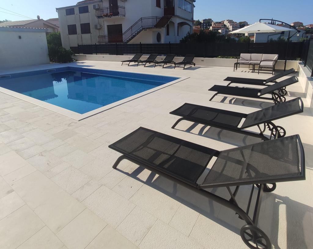Nově zrekonstruované apartmány s bazénem o rozměrech 9x5 metrů, prostornou plochou na opalování s lehátky a rohovým nábytkem, v bazénu je i WC, v krásném dalmatském městečku Seget Vranjica, jen 5 minut chůze od pláže. V okruhu 200 m jsou obchody, restaurace, kostel, sportoviště atd. Pouhé 4 km od nás je vzdáleno starobylé město UNESCO Trogir, které je spojeno trajektovou linkou Seget Vranjica - Trogir, letiště je vzdáleno 10 km a město Split je vzdálené 30 km.