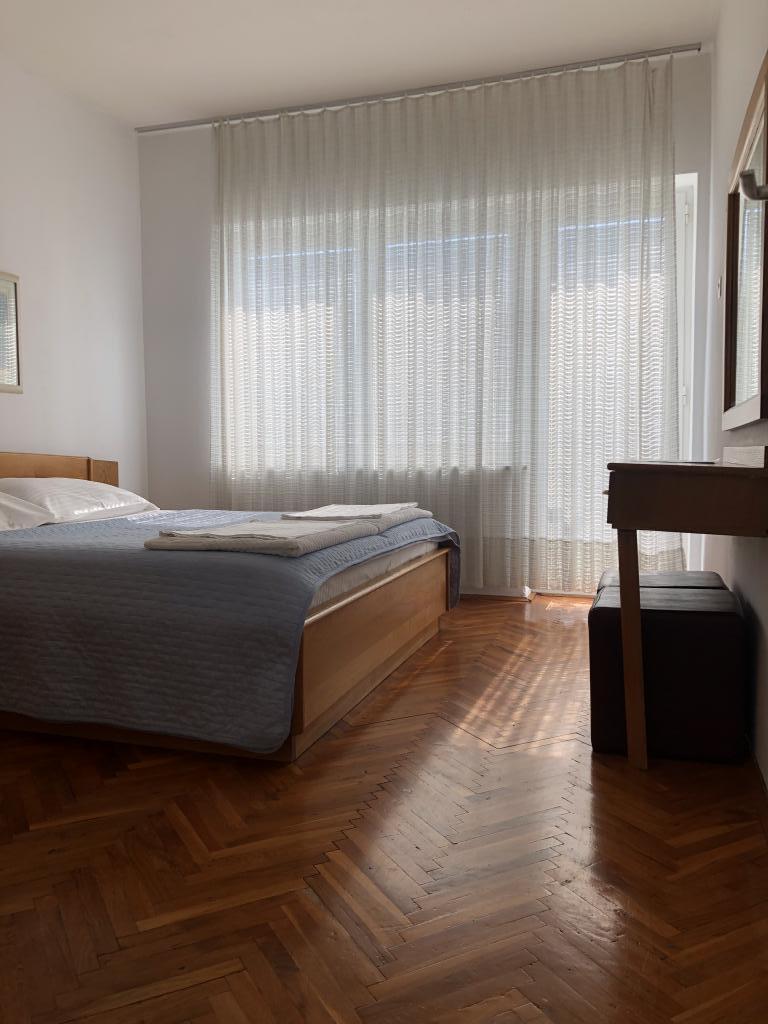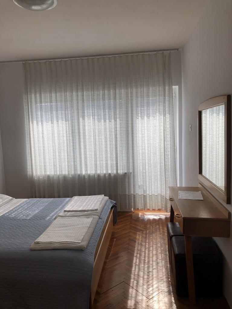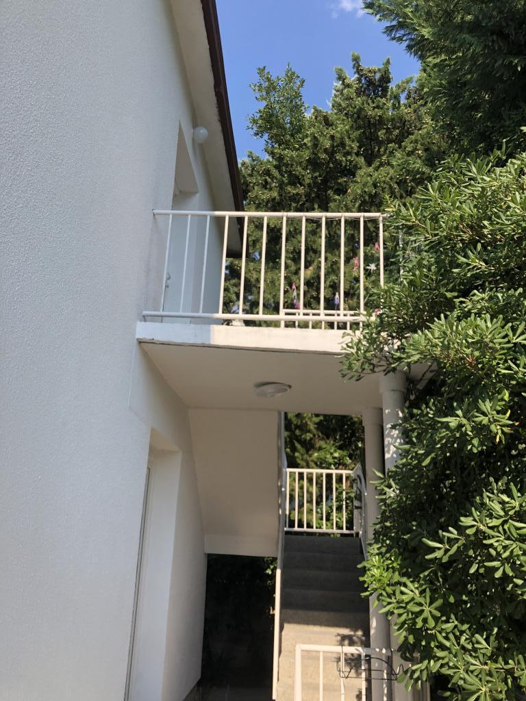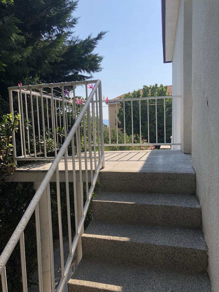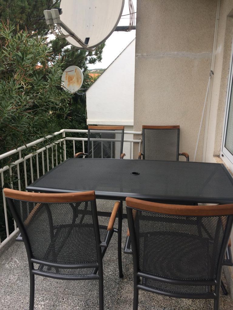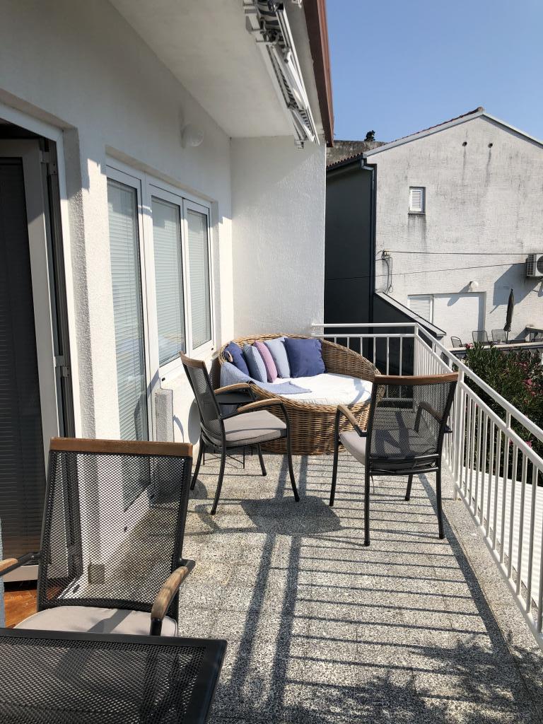 Moderně zařízený byt se nachází v prvním patře rodinného domu, samostatné patro se samostatným vchodem a parkovacím místem. 5 minut chůze od centra a deset od pláže. Skládá se ze vstupní chodby, koupelny s vanou, plně vybavené kuchyně vybavené sporákem, lednicí, mikrovlnkou, kompletním nádobím a nádobím. Ložnice s manželskou postelí a vestavěnou skříní, menší ložnice s rozkládací pohovkou a vestavěnou skříní a obývací pokoj s TV a rohovou sedací soupravou. Před ložnicí a obývacím pokojem je pohodlná terasa s výhledem na moře, krytá markýzou a vybavená jídelním koutem a lehátkem. Prostor je klimatizovaný a má wifi.