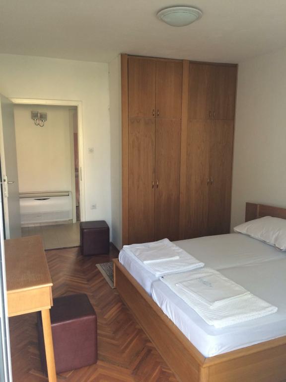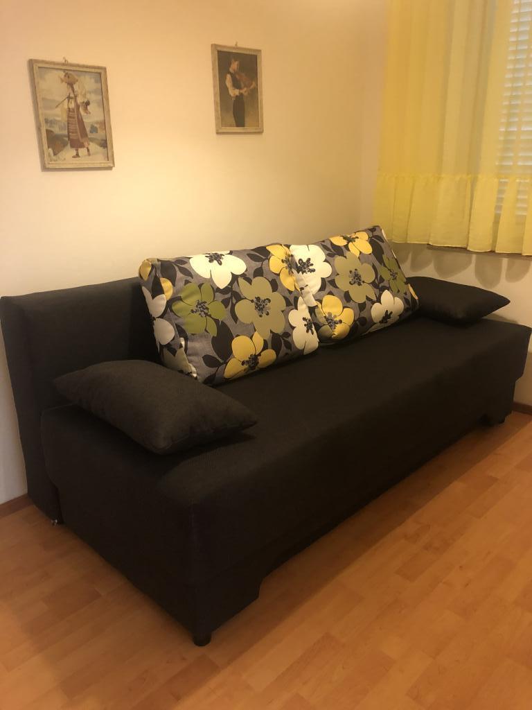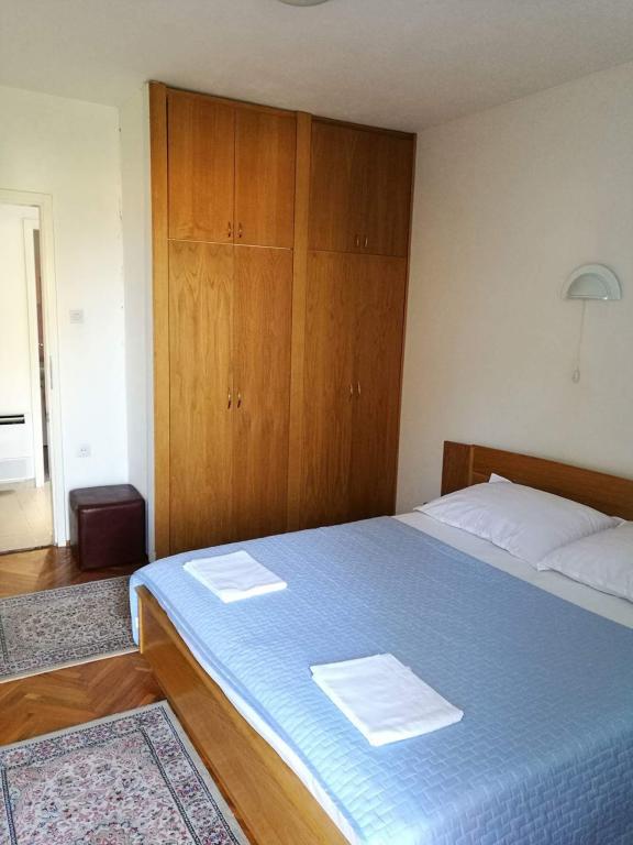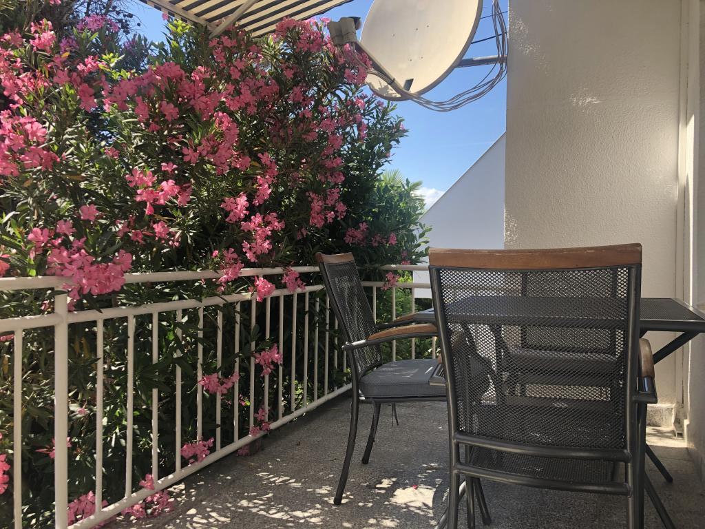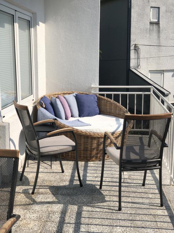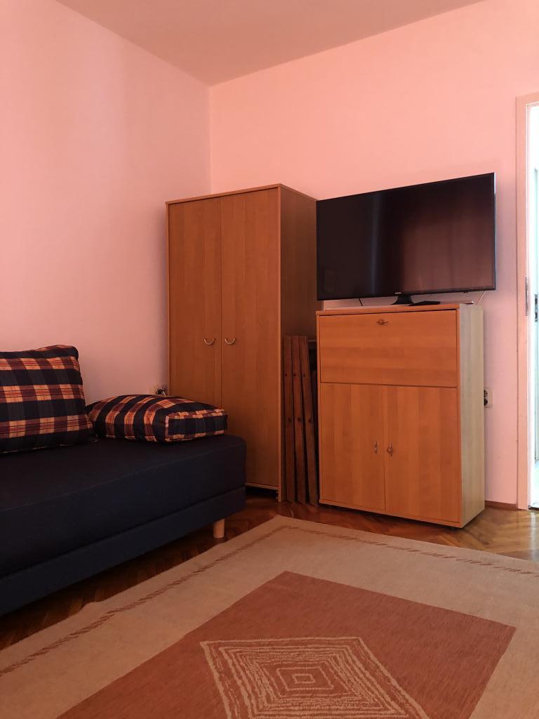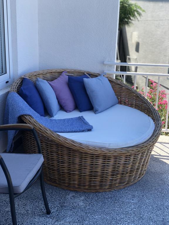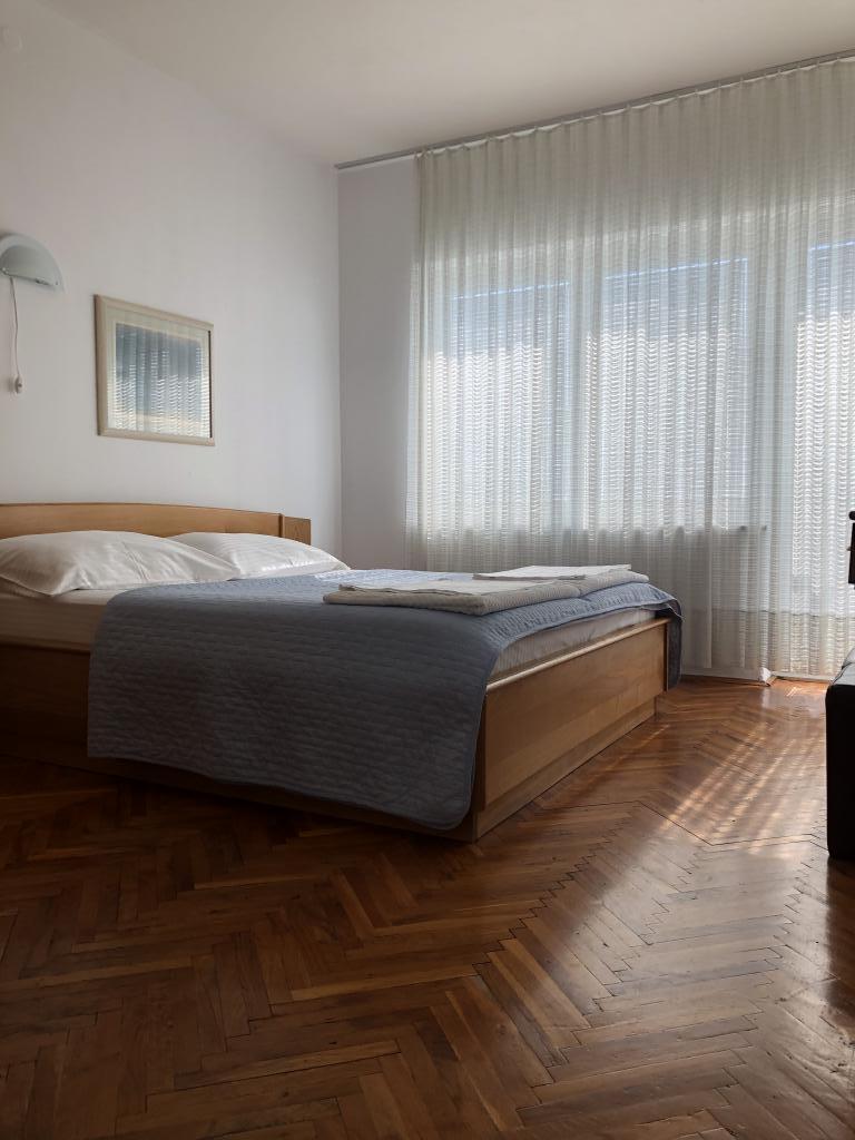 Moderně zařízený byt se nachází v prvním patře rodinného domu, samostatné patro se samostatným vchodem a parkovacím místem. 5 minut chůze od centra a deset od pláže. Skládá se ze vstupní chodby, koupelny s vanou, plně vybavené kuchyně vybavené sporákem, lednicí, mikrovlnkou, kompletním nádobím a nádobím. Ložnice s manželskou postelí a vestavěnou skříní, menší ložnice s rozkládací pohovkou a vestavěnou skříní a obývací pokoj s TV a rohovou sedací soupravou. Před ložnicí a obývacím pokojem je pohodlná terasa s výhledem na moře, krytá markýzou a vybavená jídelním koutem a lehátkem. Prostor je klimatizovaný a má wifi.